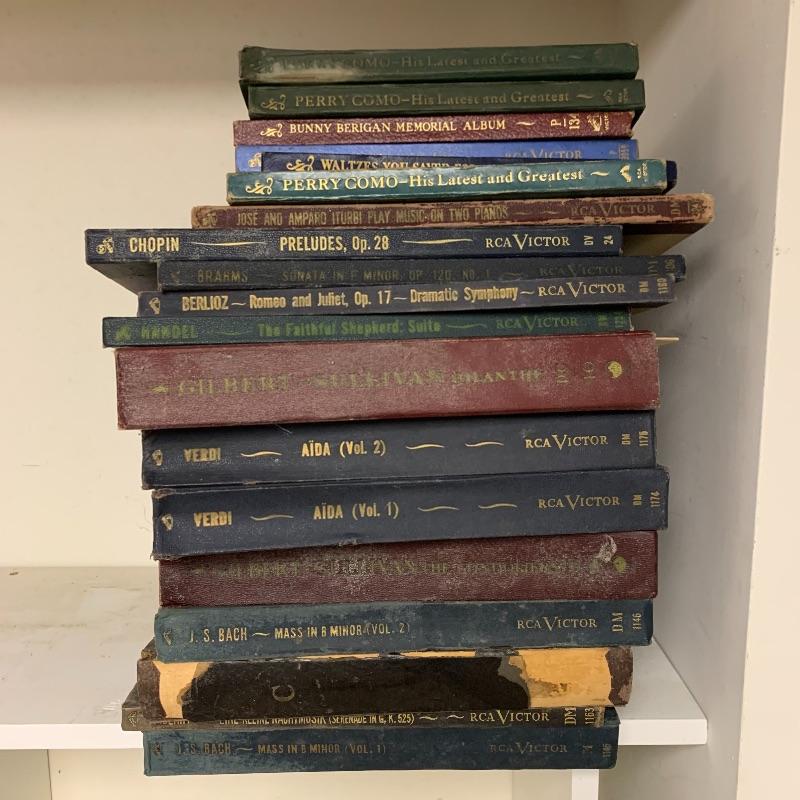 Collection of 10” and 12” RCA Victor vintage musical masterpiece sets. Includes: J.S. Bach Mass in B Minor, Mozart Eine Kleine Nachtmusik, Verdi Aida Vol. 1 & 2), Perry Como’s Latest and Greatest, Bunny averiguan Memorial Album, and more!
