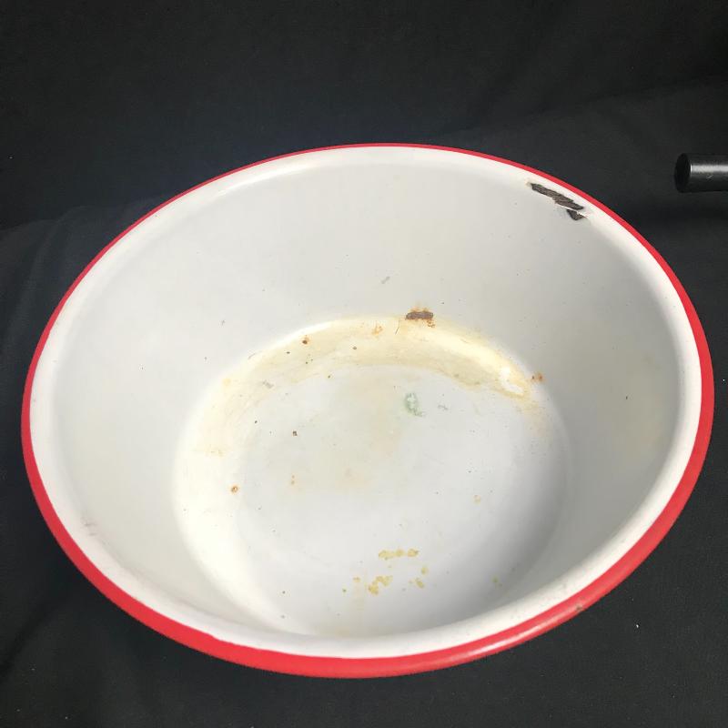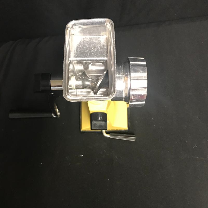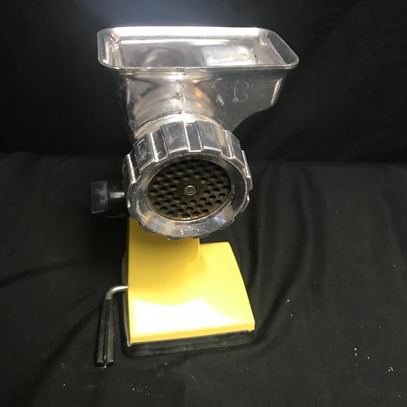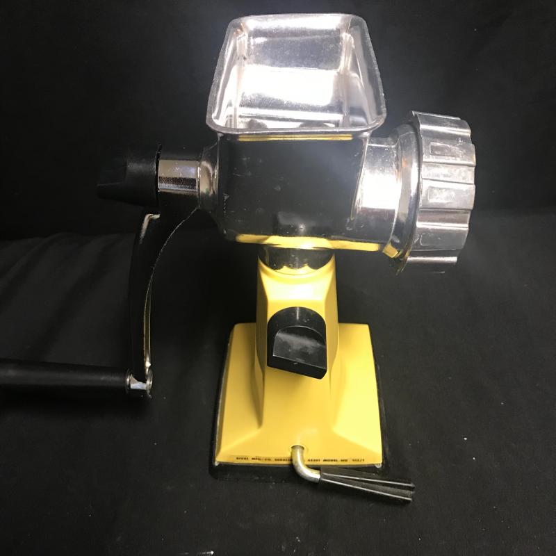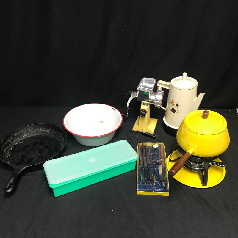 This lot includes a lodge cast iron skillet, an enamel bowl, a rival counter meat grinder, a plastic percolator, a Tupperware storage, and bright yellow fondue set with forks. Local pick up only.