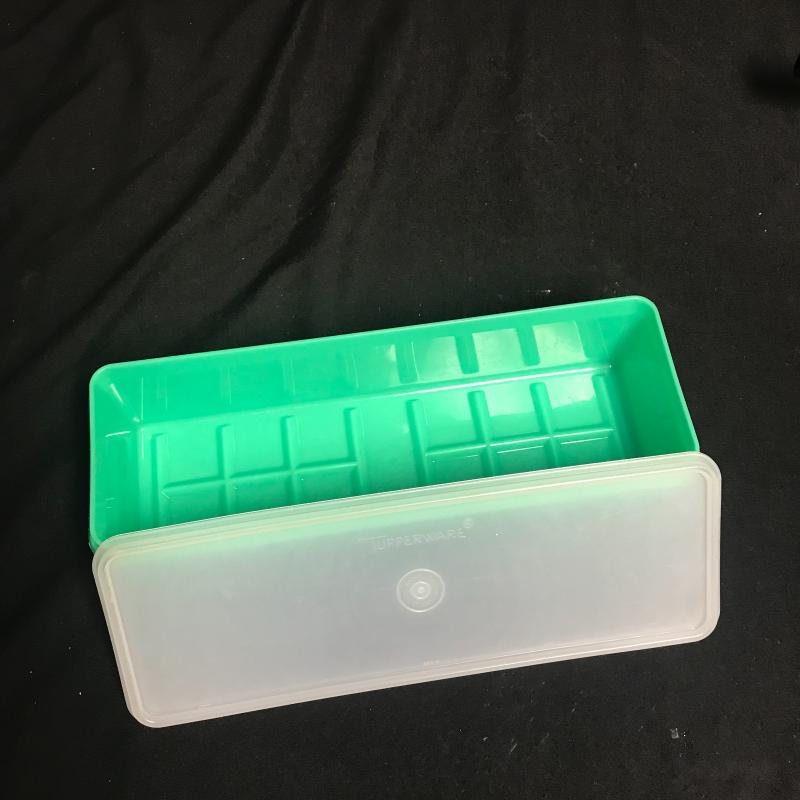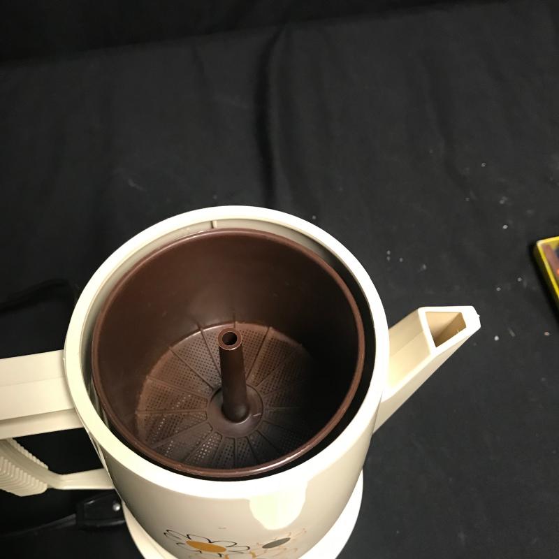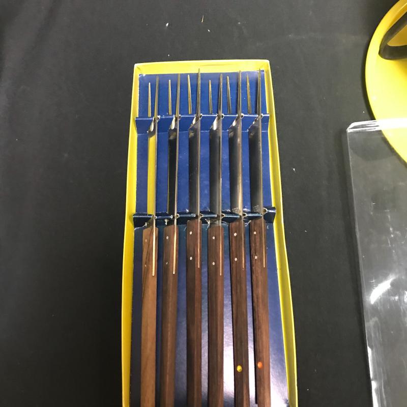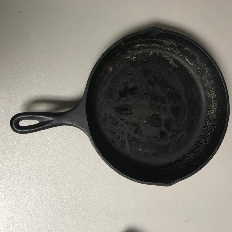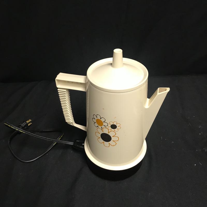 This lot includes a lodge cast iron skillet, an enamel bowl, a rival counter meat grinder, a plastic percolator, a Tupperware storage, and bright yellow fondue set with forks. Local pick up only.
