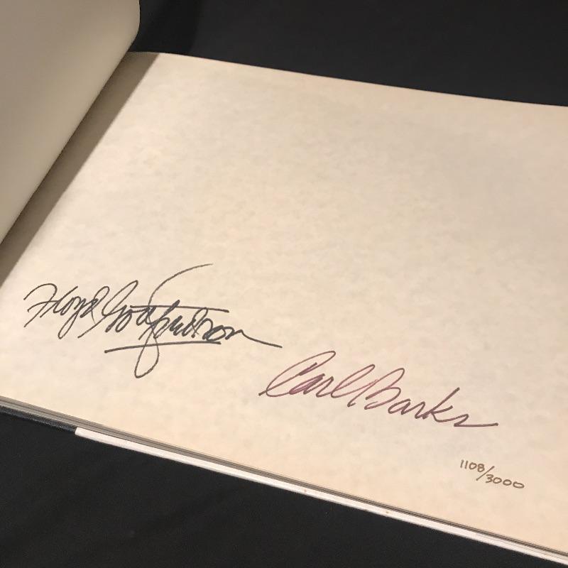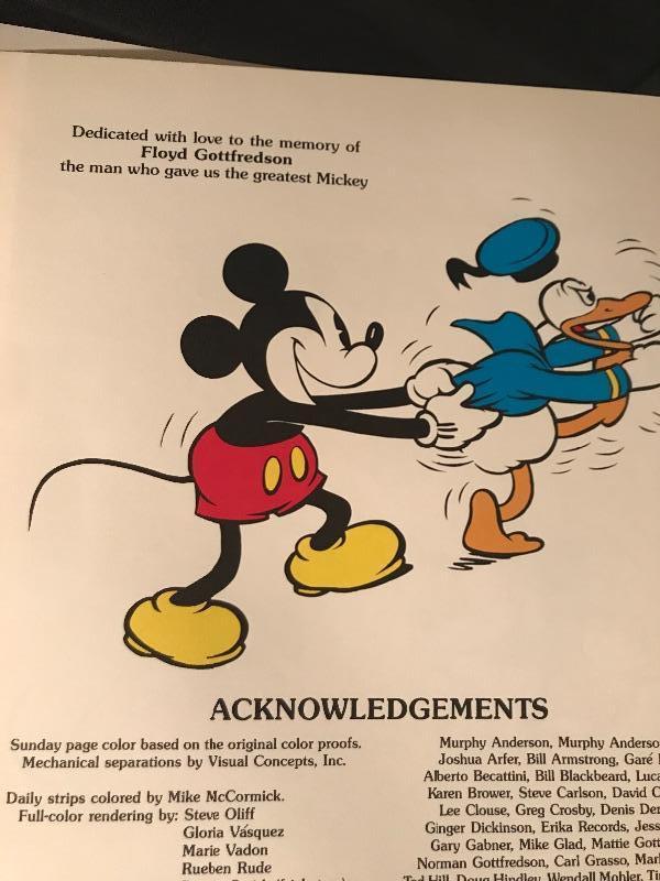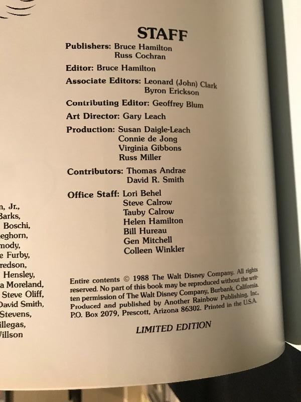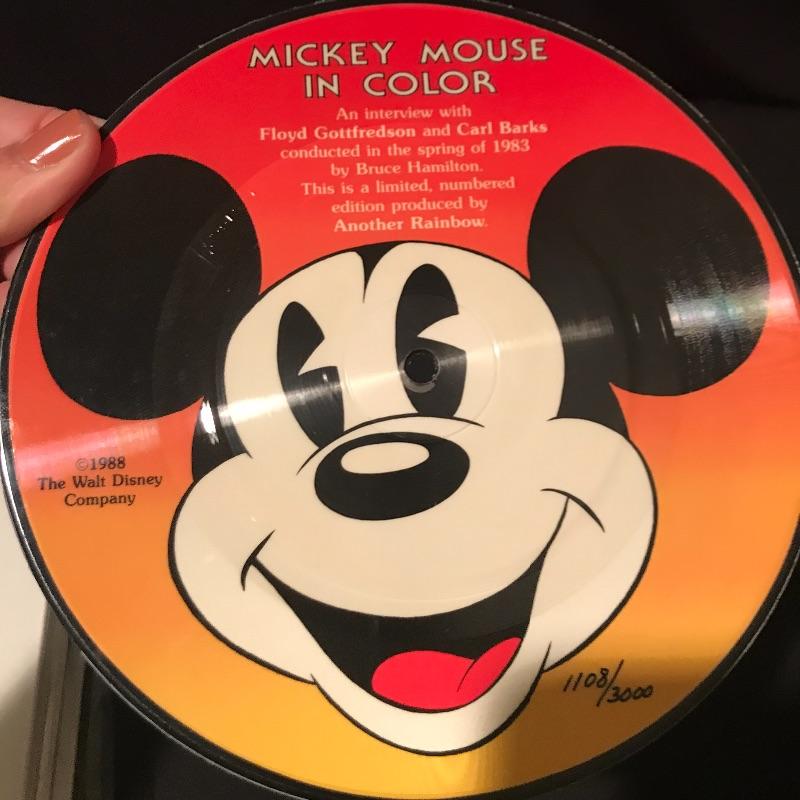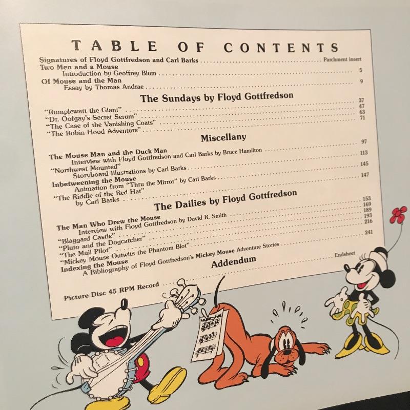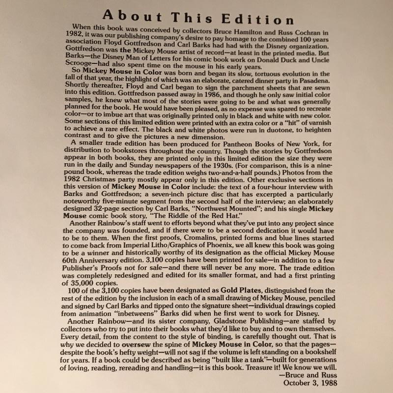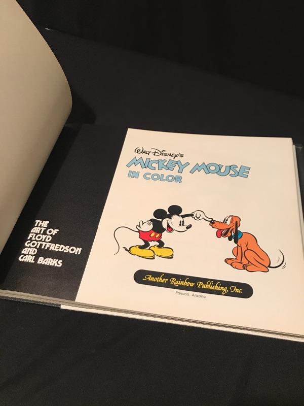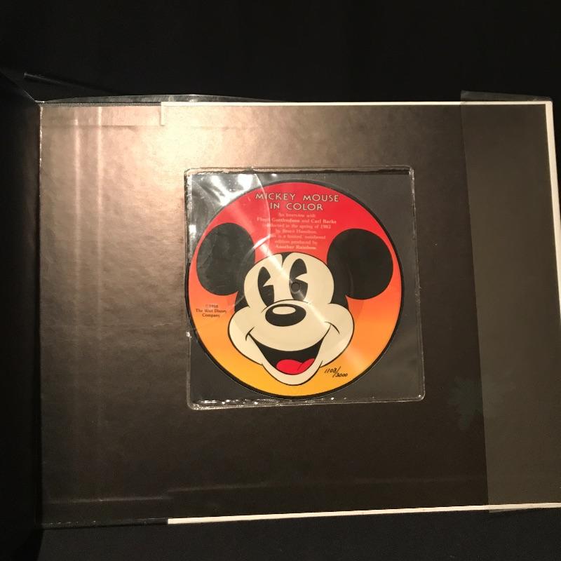 Walt Disney’s Mickey Mouse in Color Coffee Table Book is Signed by both illustrators. This historic limited edition book has both Floyd Gottfredson (Mickey Mouse creator) and Carl Barks (Donald Duck creator) signatures and is number 1108 of 3000. There is a sleeve on inside back cover with a 45 RPM Picture Disc. The protective plastic cover on this book has taken the brunt of the wear and tear but there is a small brown stain on the top of the back cover. See pic. This book weighs 19lbs! Shipping available.