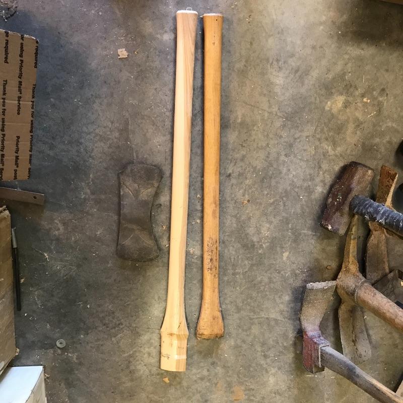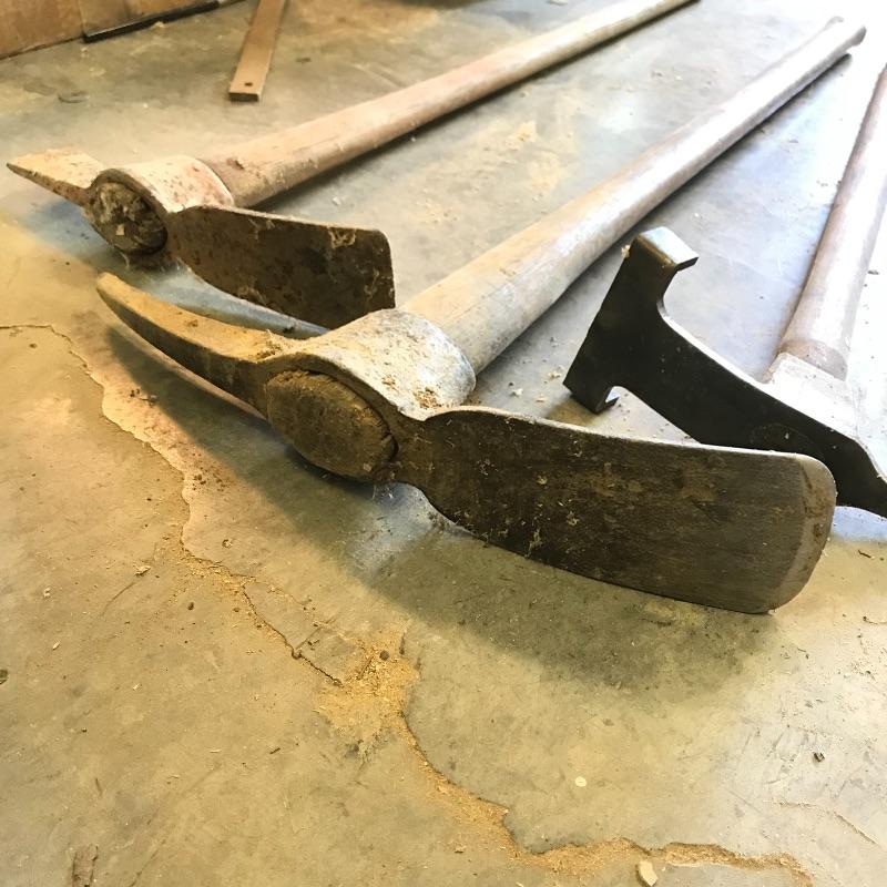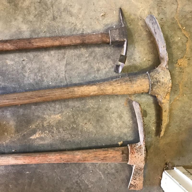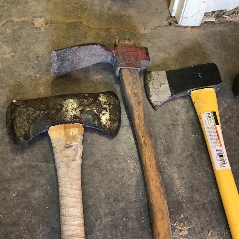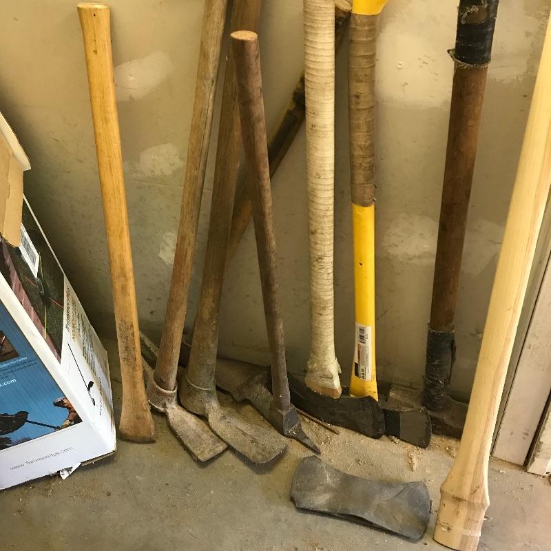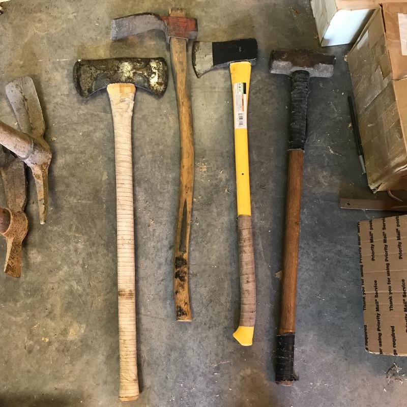 One sledgehammer and six various types of axes. Lot also contains one head and two extra handles. Of the lot, the smallest handle is 29” and the pick axe has the longest head at 17”. No shipping.