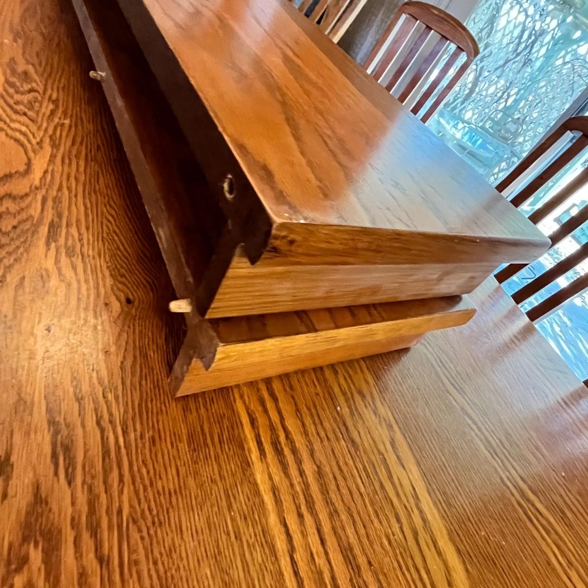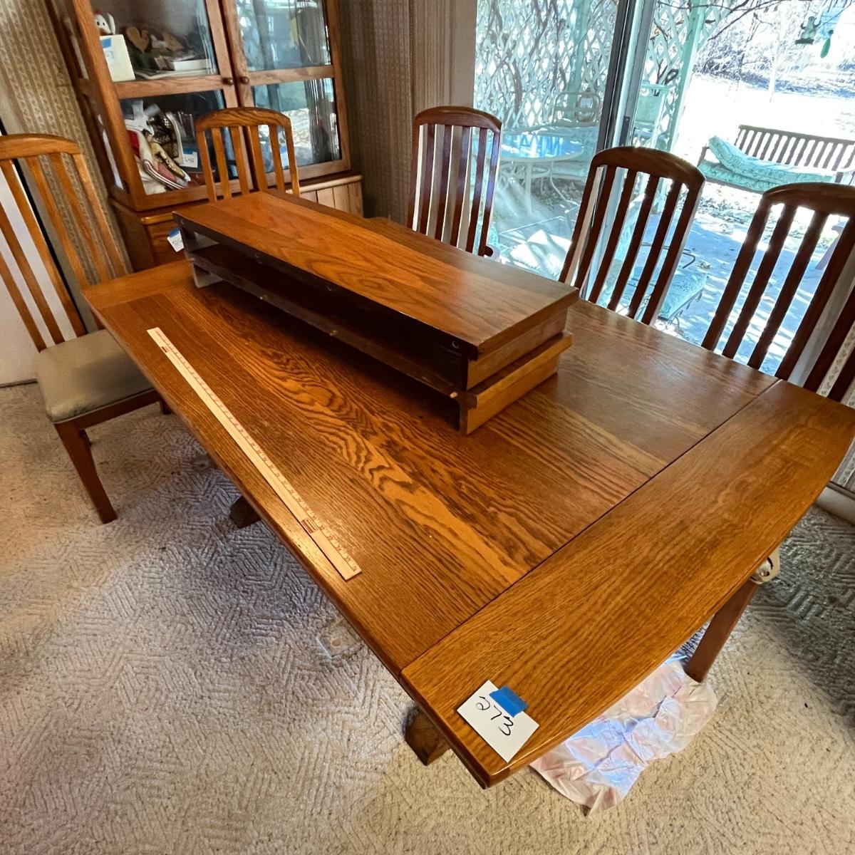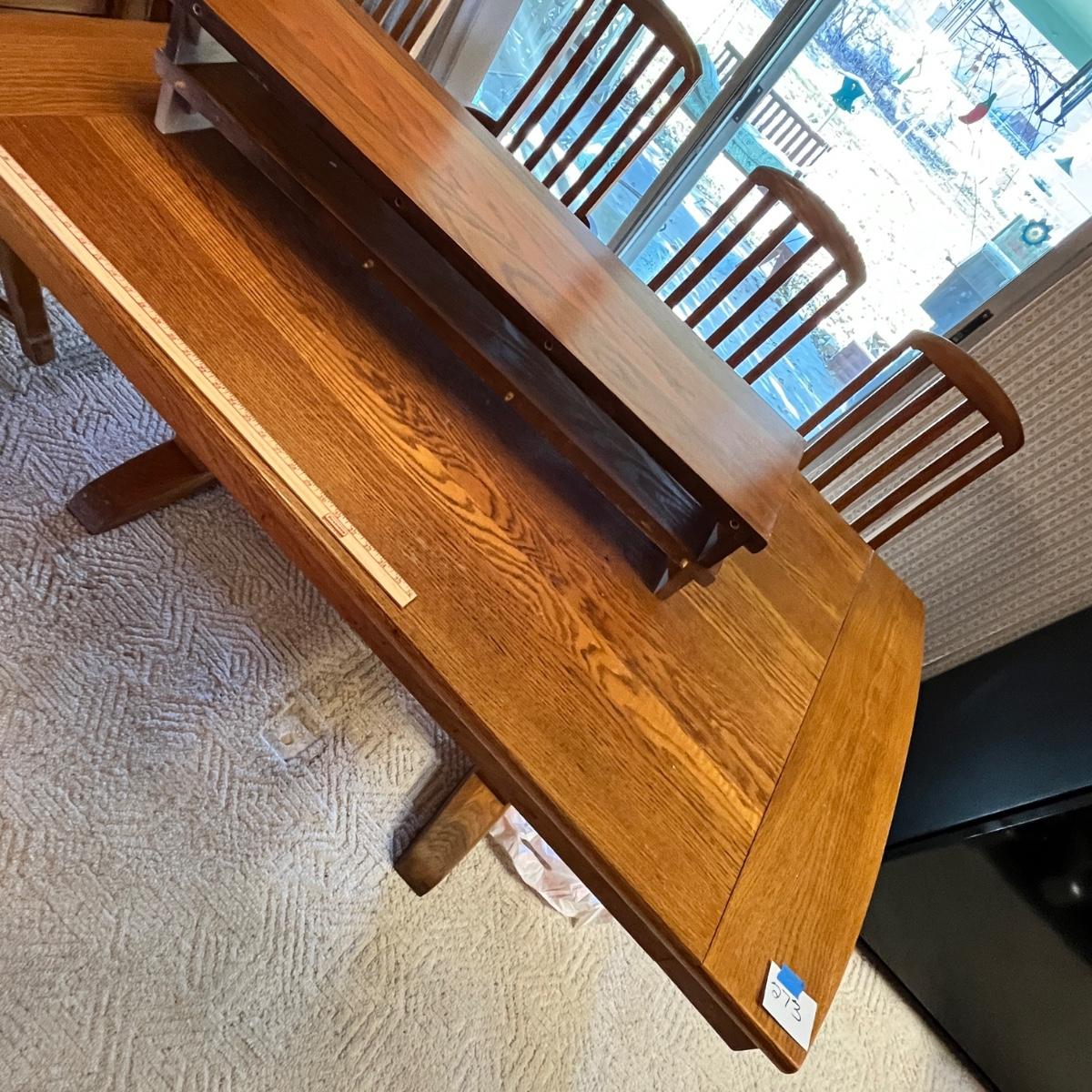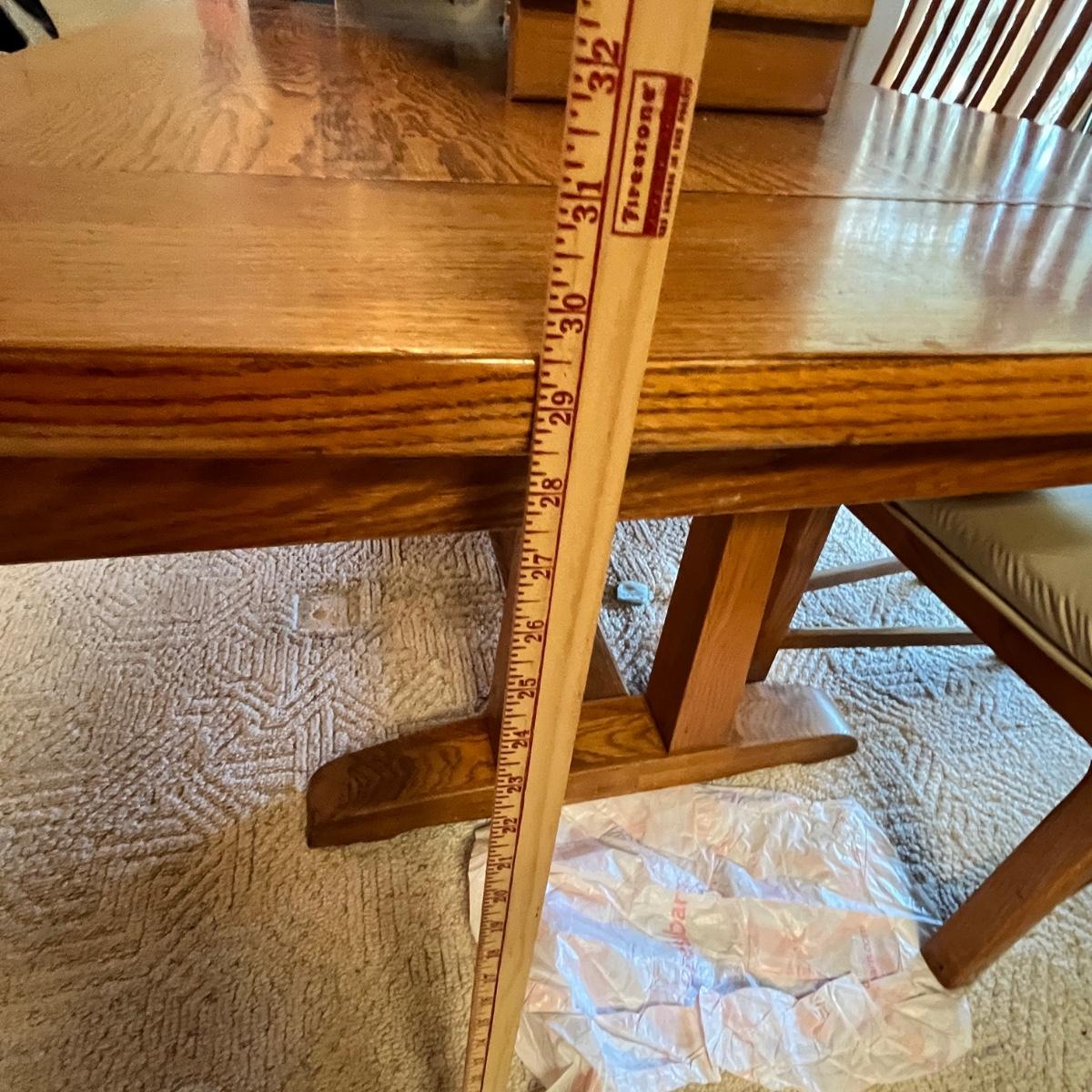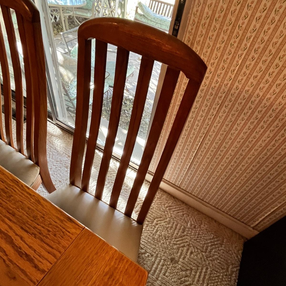 There are 5 chairs, 2 leaves. The vinyl seats need attention, they all have rips. Heavy duty table. Larger sized.