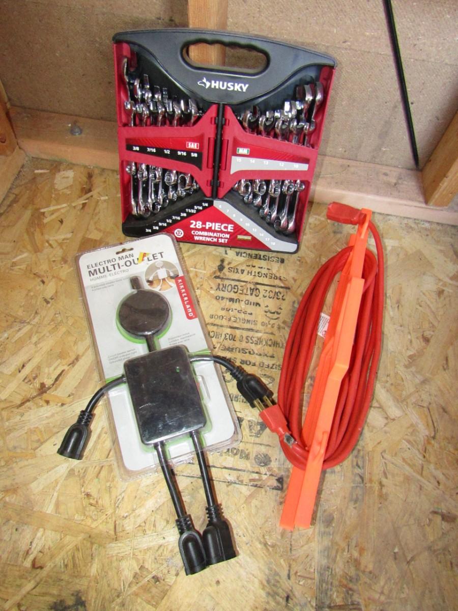 LOT 273 NEW HUSKEY 28 PC COMBO WRENCH SET, MULTI-OUTLET AND EXTENSION CORD