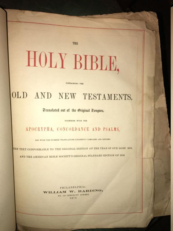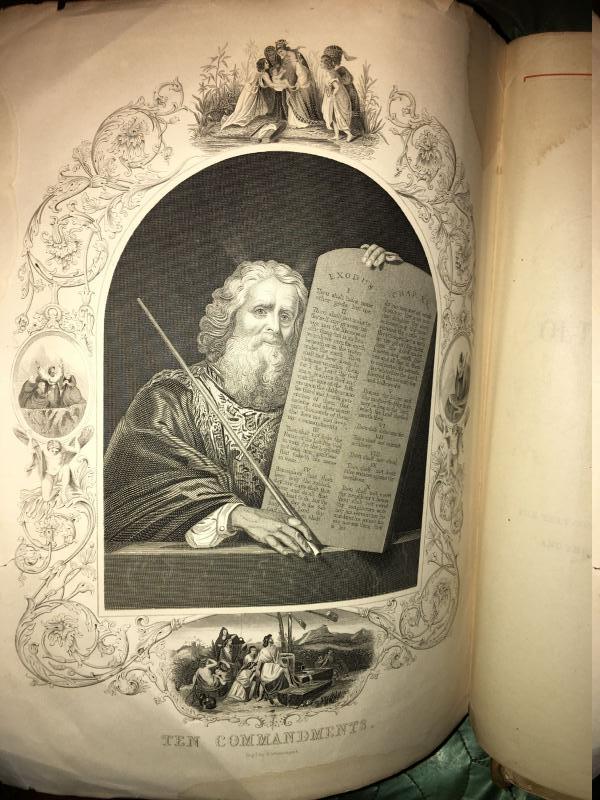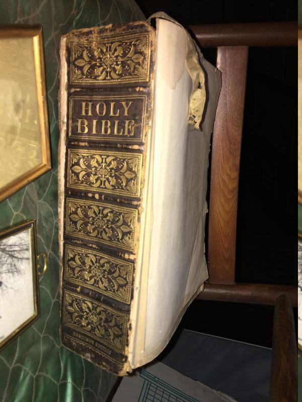 1870 illustrated bible w/ missing cover, chair has plastic cushion