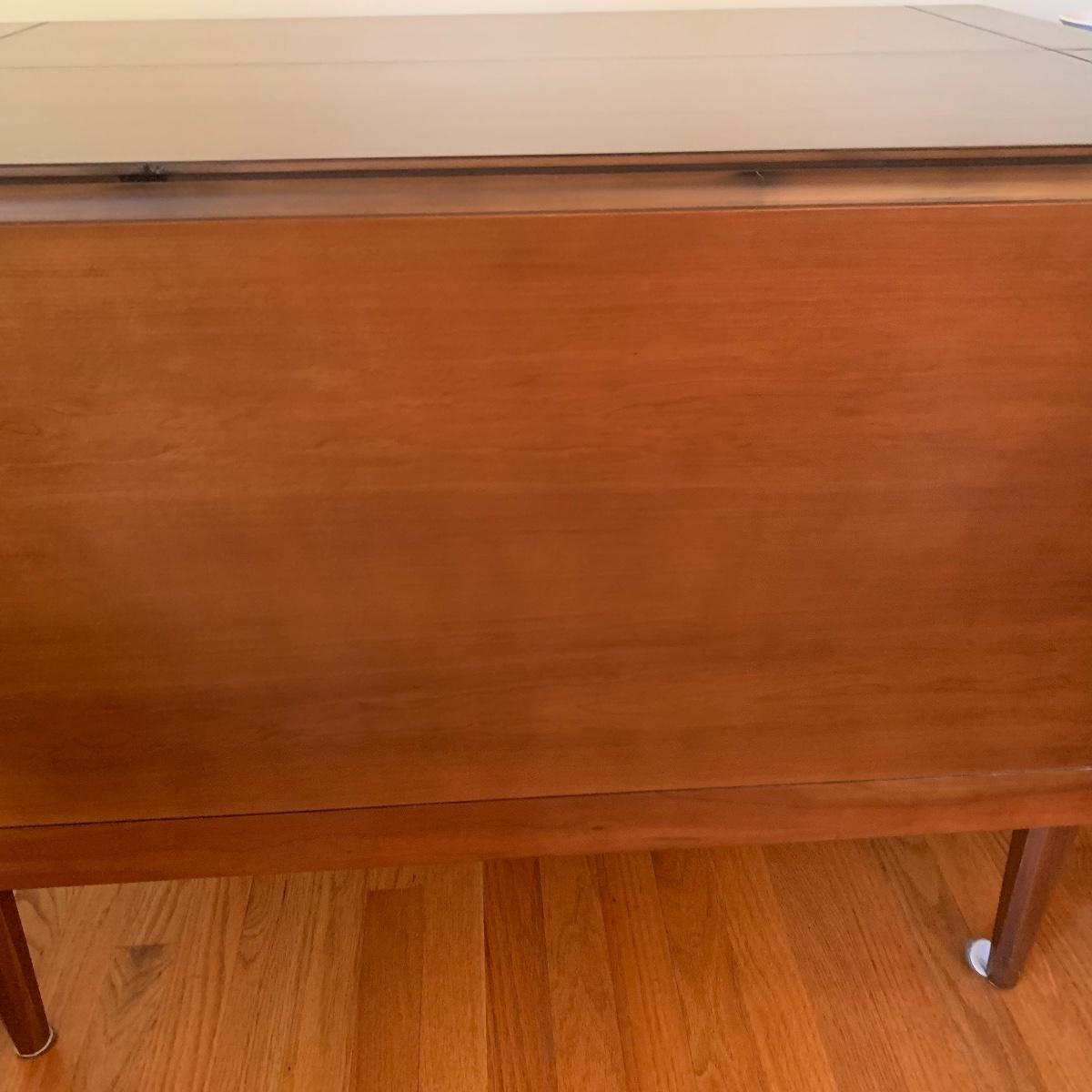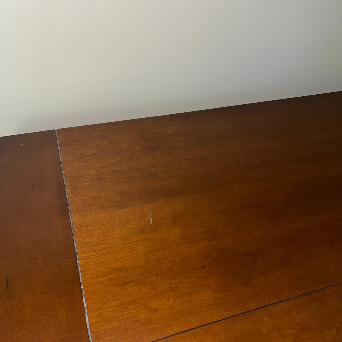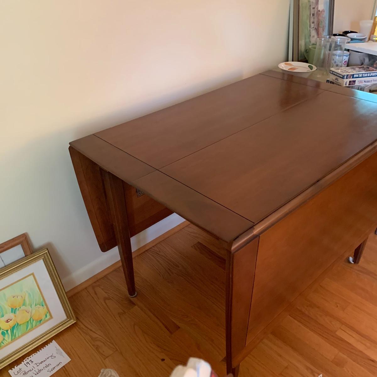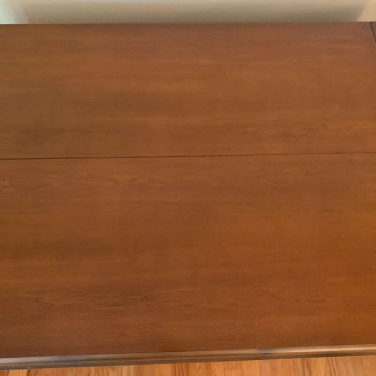 This gorgeous drop leaf table is ready for its new home. It features rounded edges, a routed decorative groove and a stunning finish. It is very easy to operate for quick conversion to a larger table. When the table is extended this piece measures 42” wide X 29” tall X 65” long. With the leaves down it is 28” long. This table has a few small scratches but is otherwise in good condition. Local pickup only.