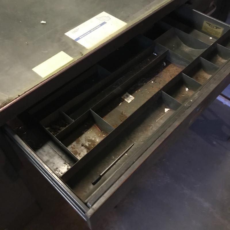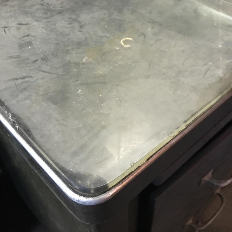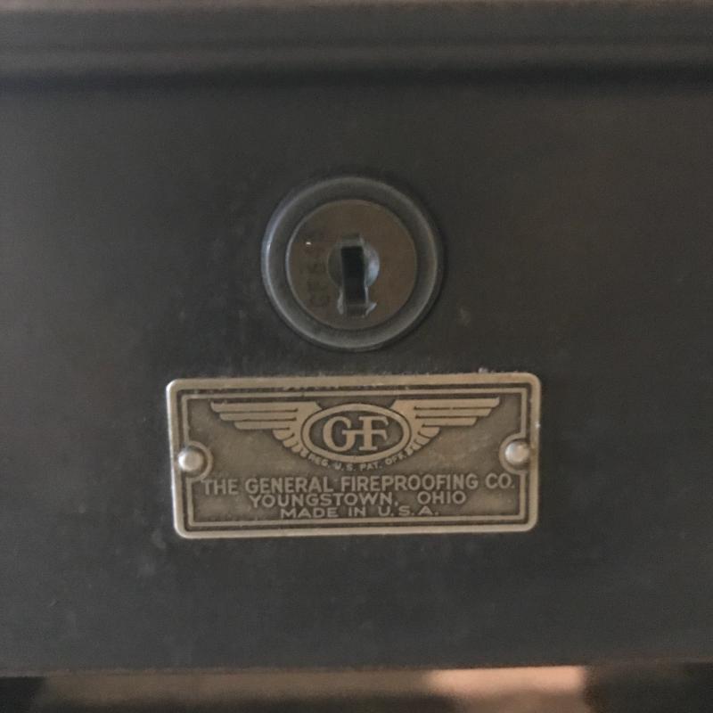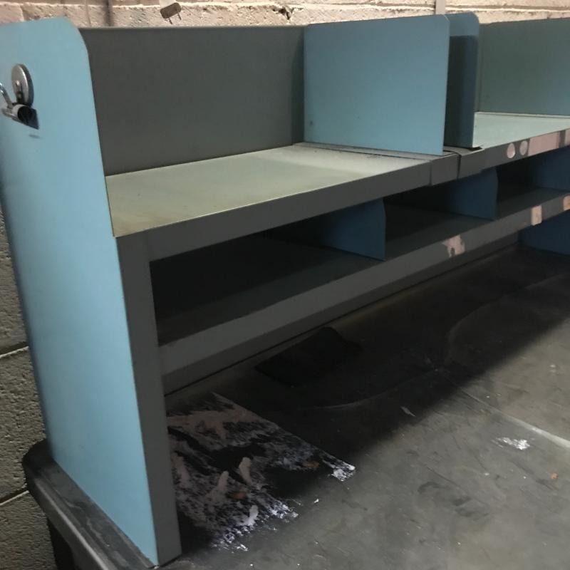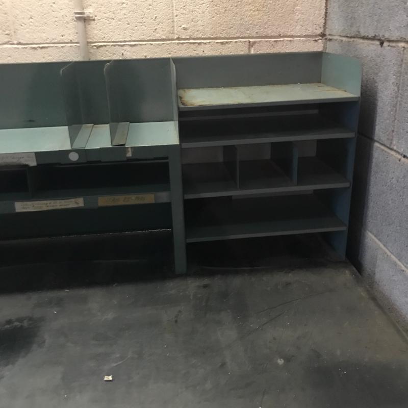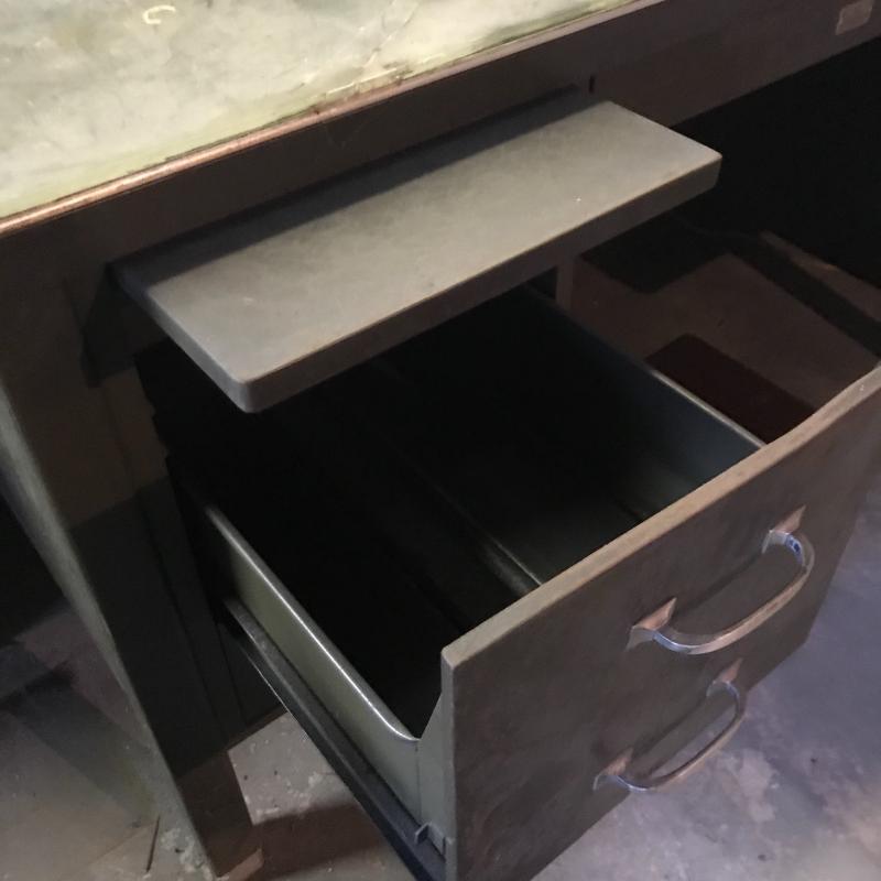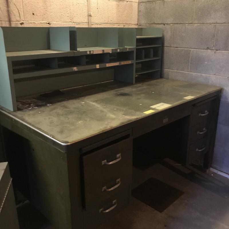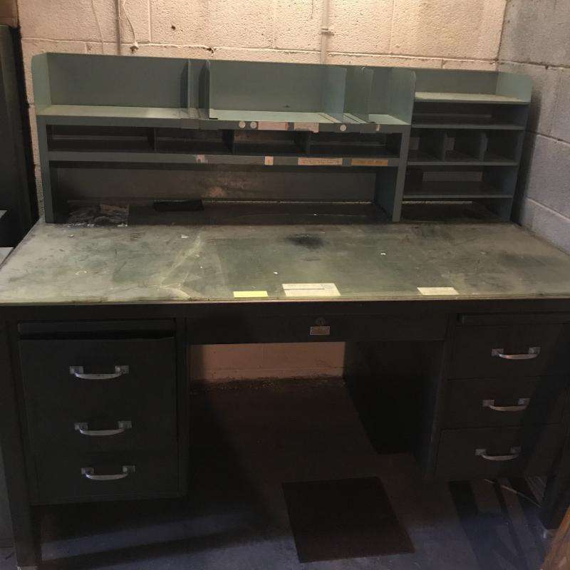 Large metal desk. Possible Fireproof? Has glass on top that is broken and probably best to replace or trash. Measures 60” x 34” x 30.5” Lot also include removable metal desktop file organizer that measures 58” x 9” x 18.5”h. This is a heavy desk. There is a small set of stairs to remove from basement through back yard(see pix). Bring help to load! No shipping