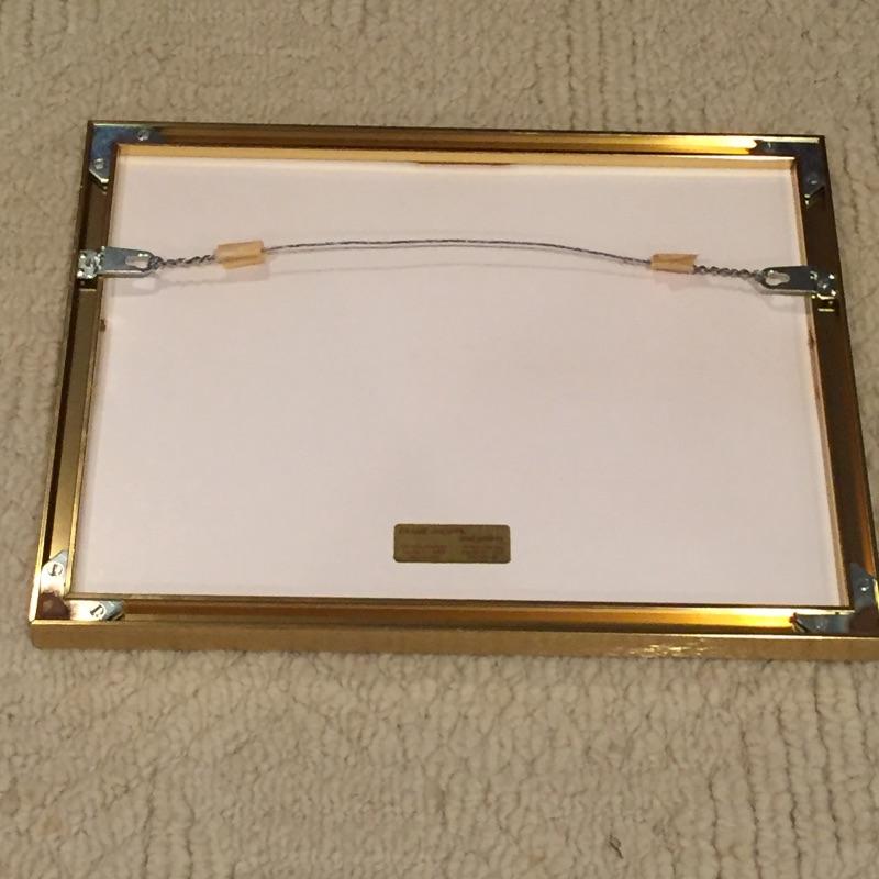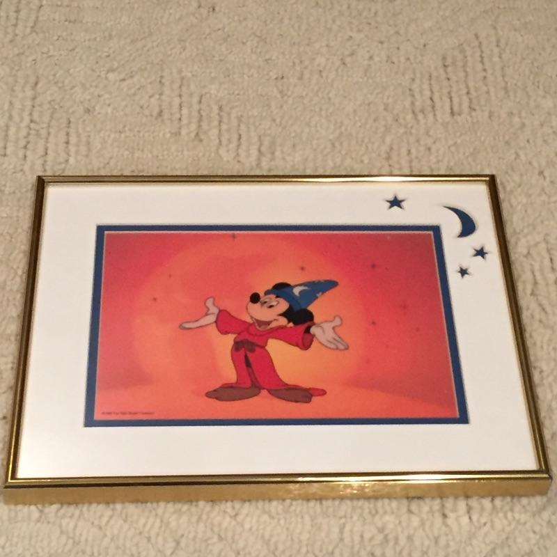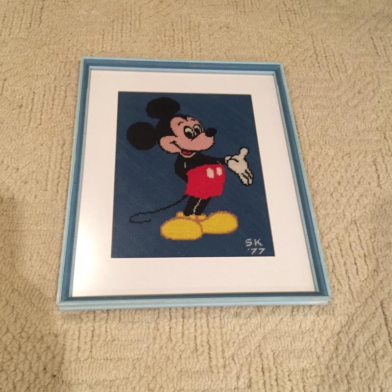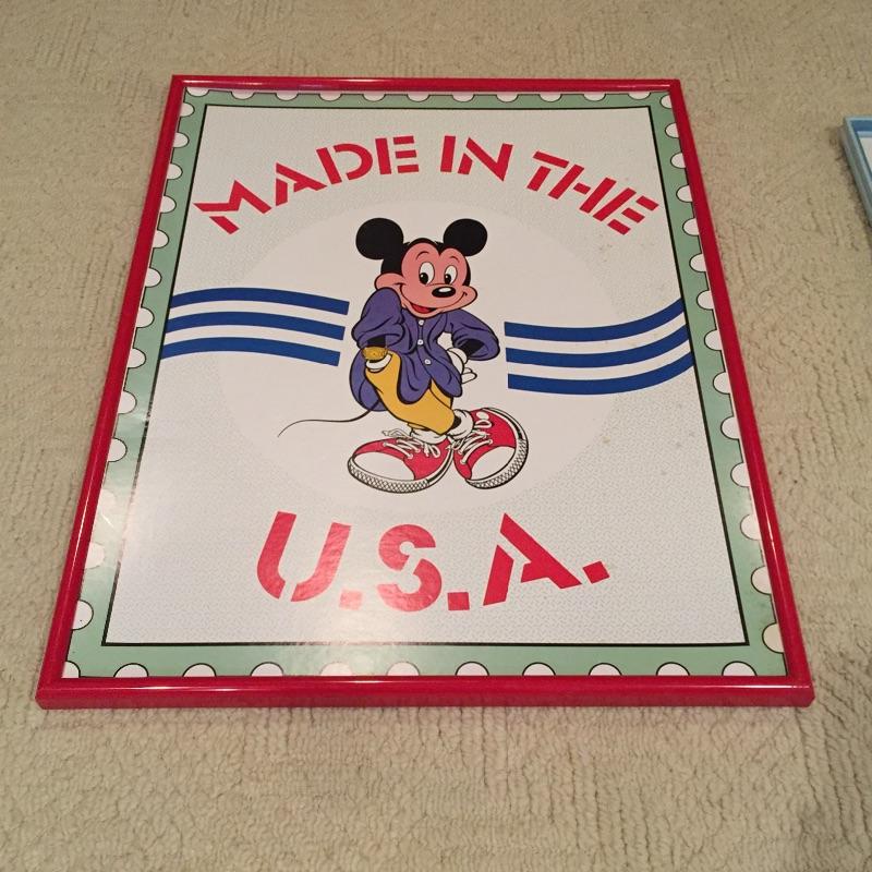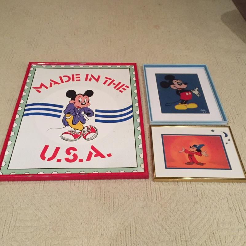 A great collection of Mickey Mouse framed art work for the Walt Disney fan. Mickey “Made in the U.S.A is the largest of the 3, measuring 28” x 23”, it is set in a red plastic poster frame. Next is a lovely tapestry of the mouse himself set in a matted blue wood frame on glass with initials and the year .77 sewn in the lower right and last but not least is Mickey as a wizard set in a matted, gold frame on glass, matt is doubled with moon and star details etched out in the top right.