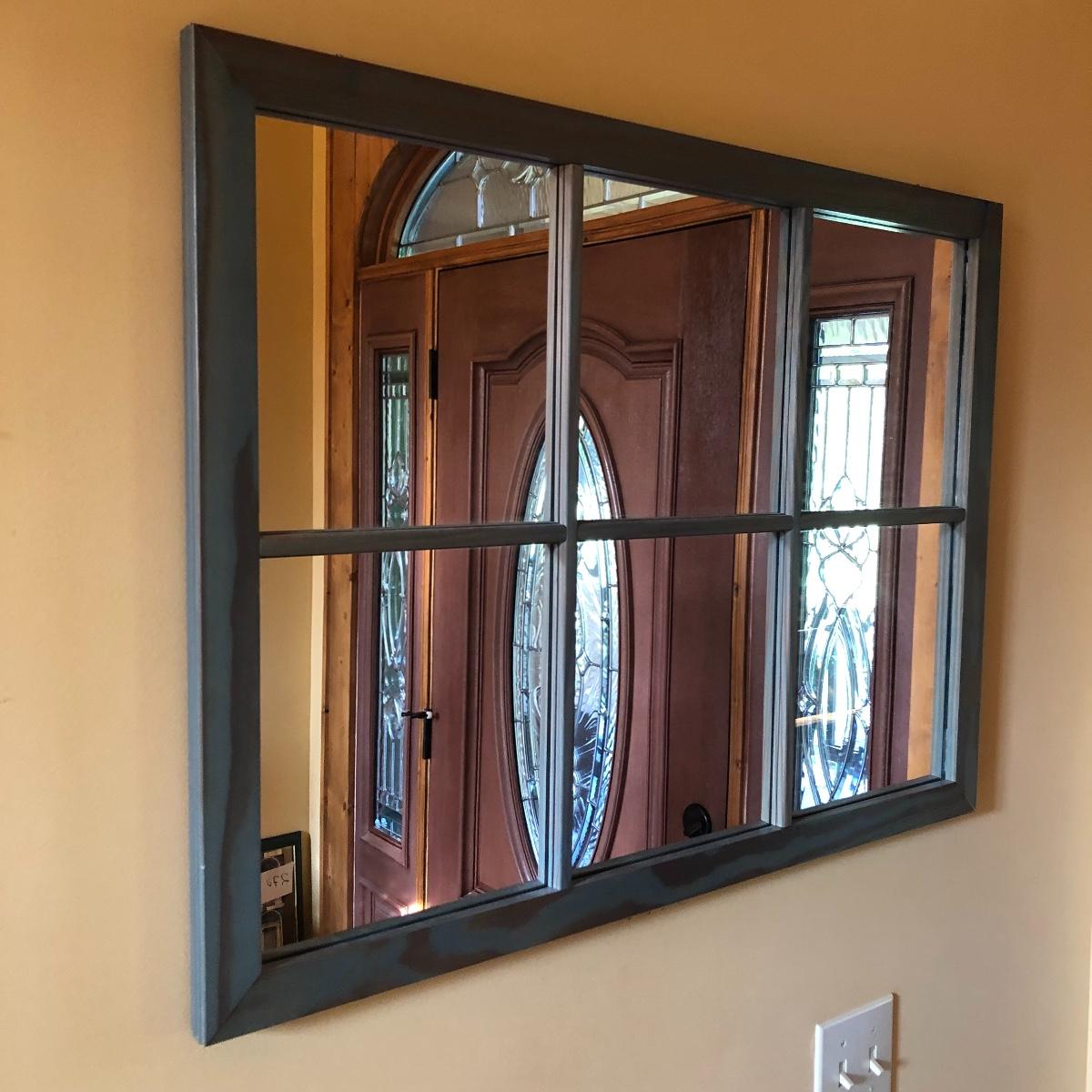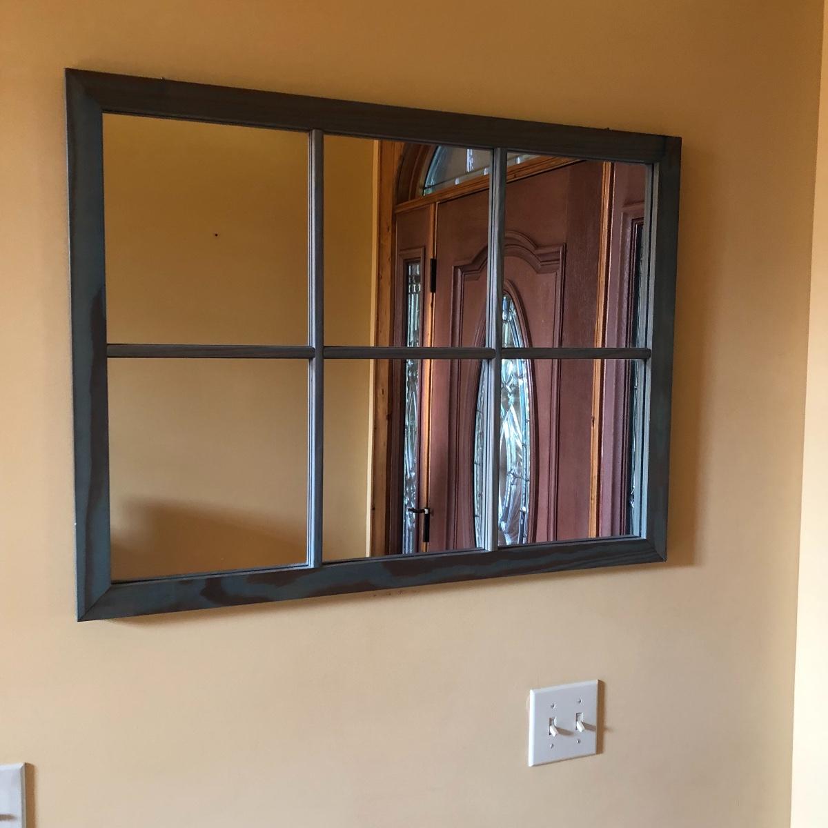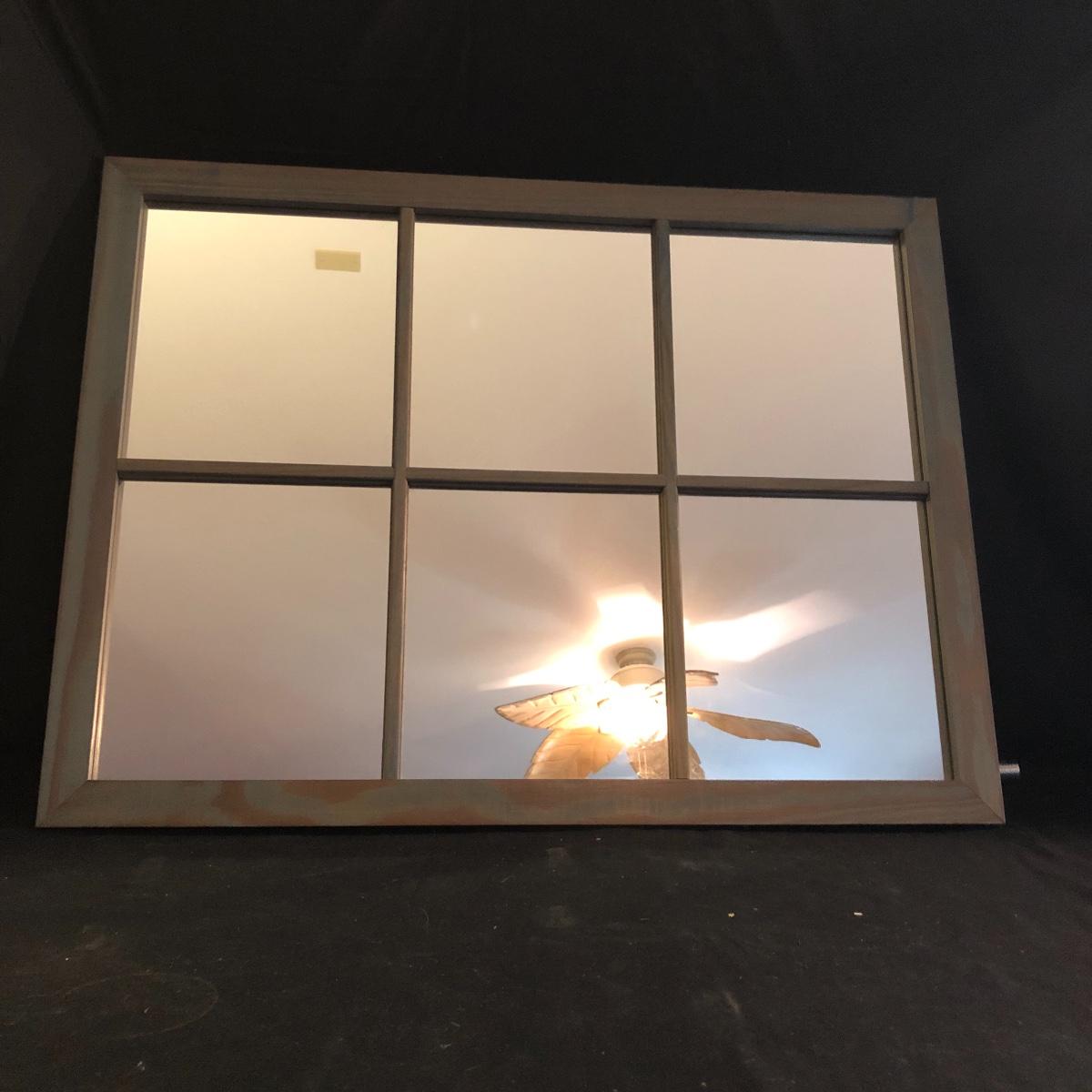 This wooden mirror is made to look like a window with its wooden grid. Mirror measures 24.5” x 32.5”.