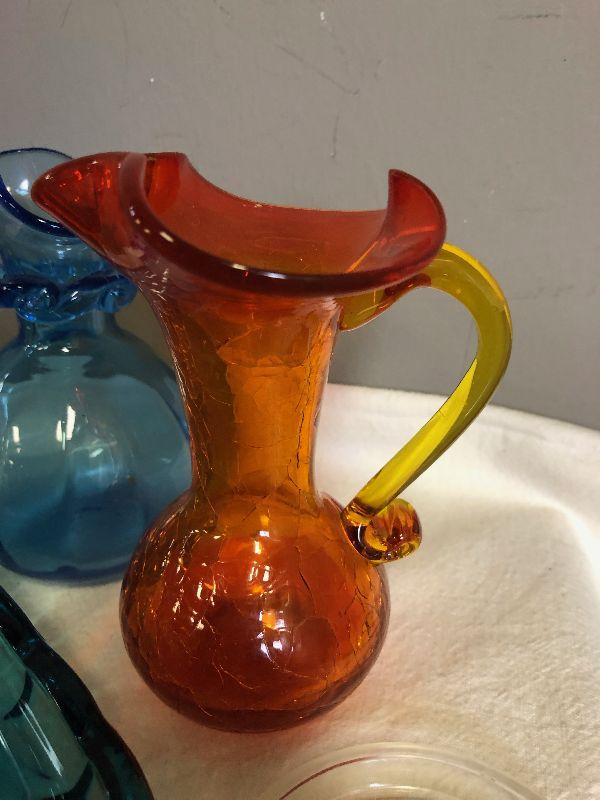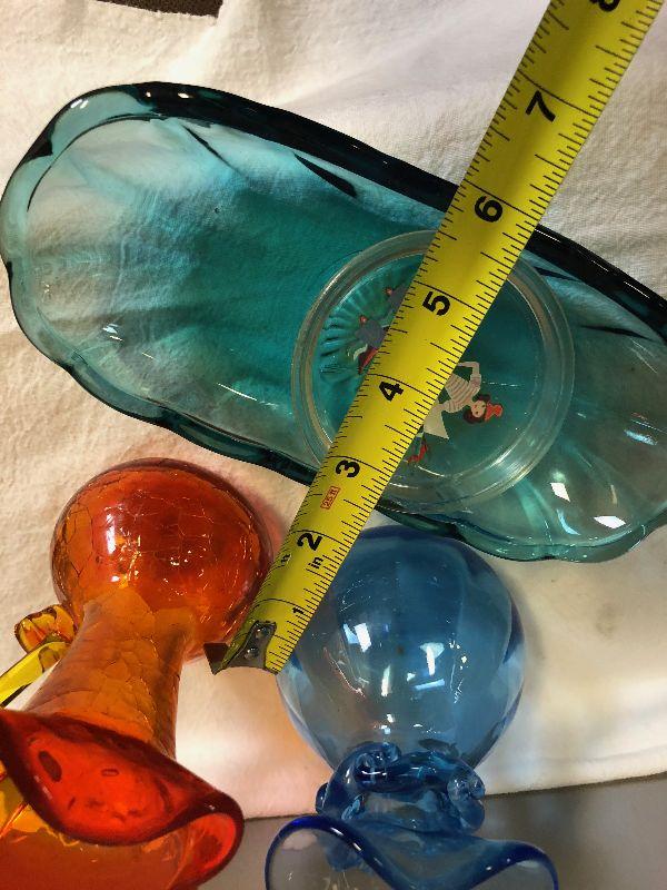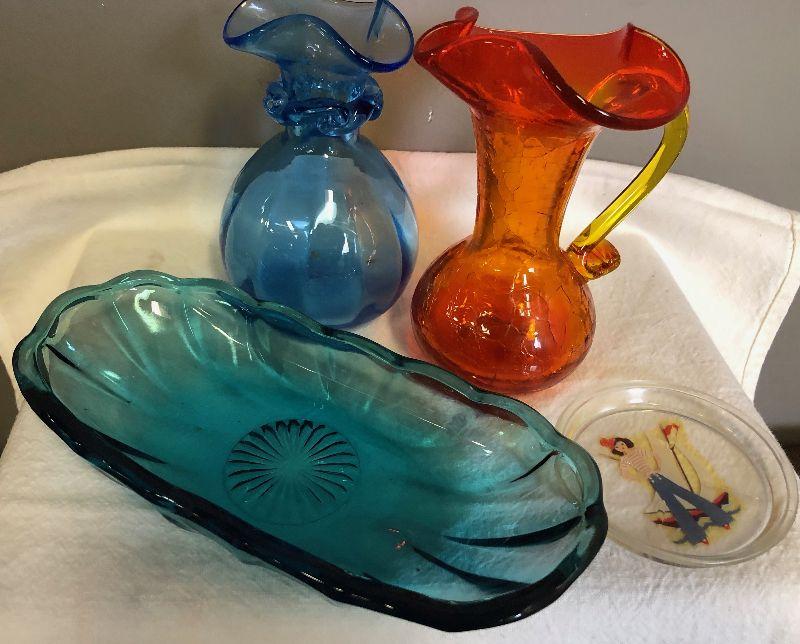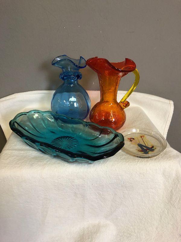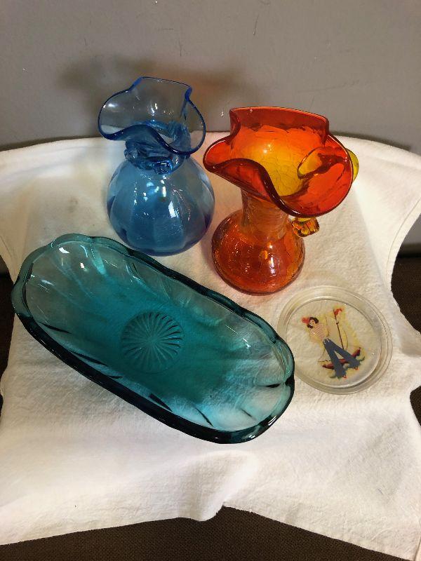 Lot #273 Orange crackle, blue Fluted Vase, Tray and coaster