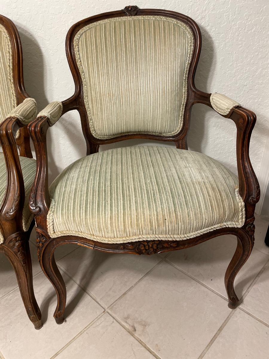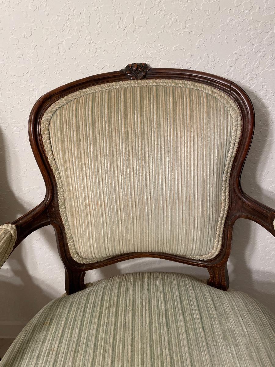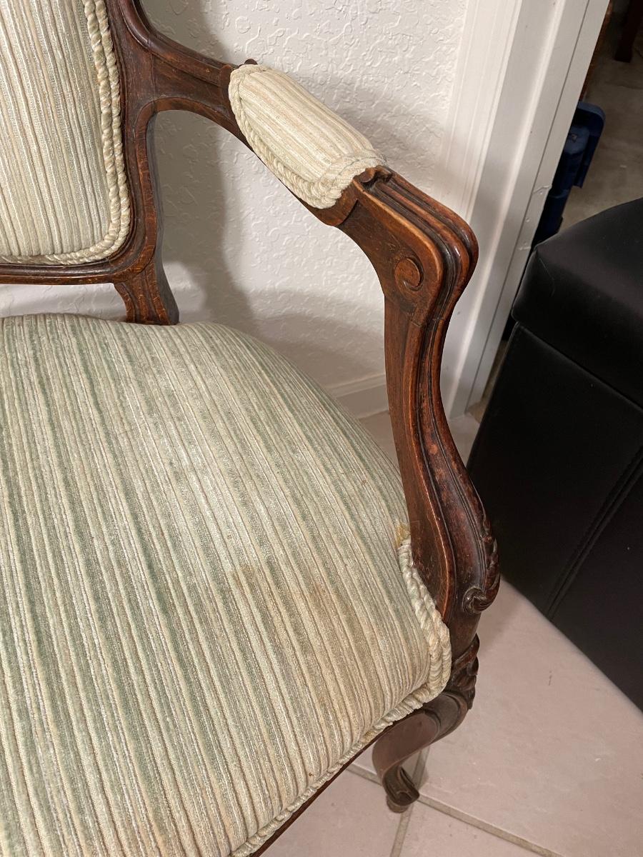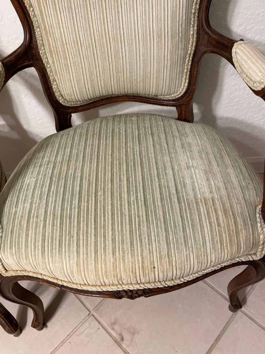 Fruitwood frame and foam is in excellent condition but fabric is a little worn.