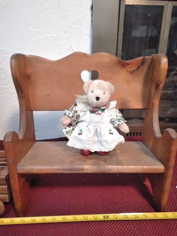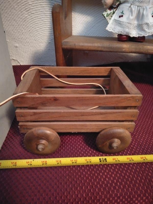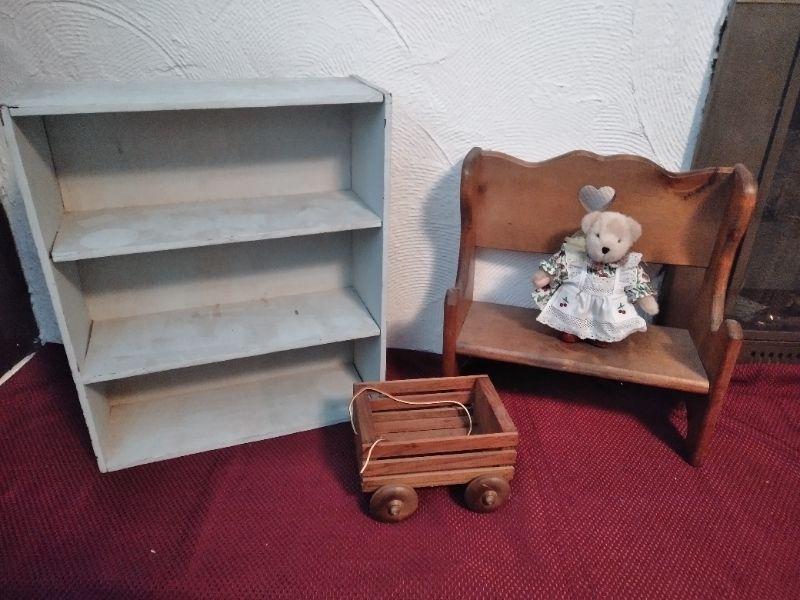 SMALL DECORATIVE SHELF, WOOD WAGON, AND SMALL WOODEN BENCH.