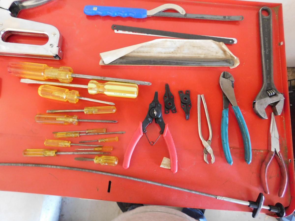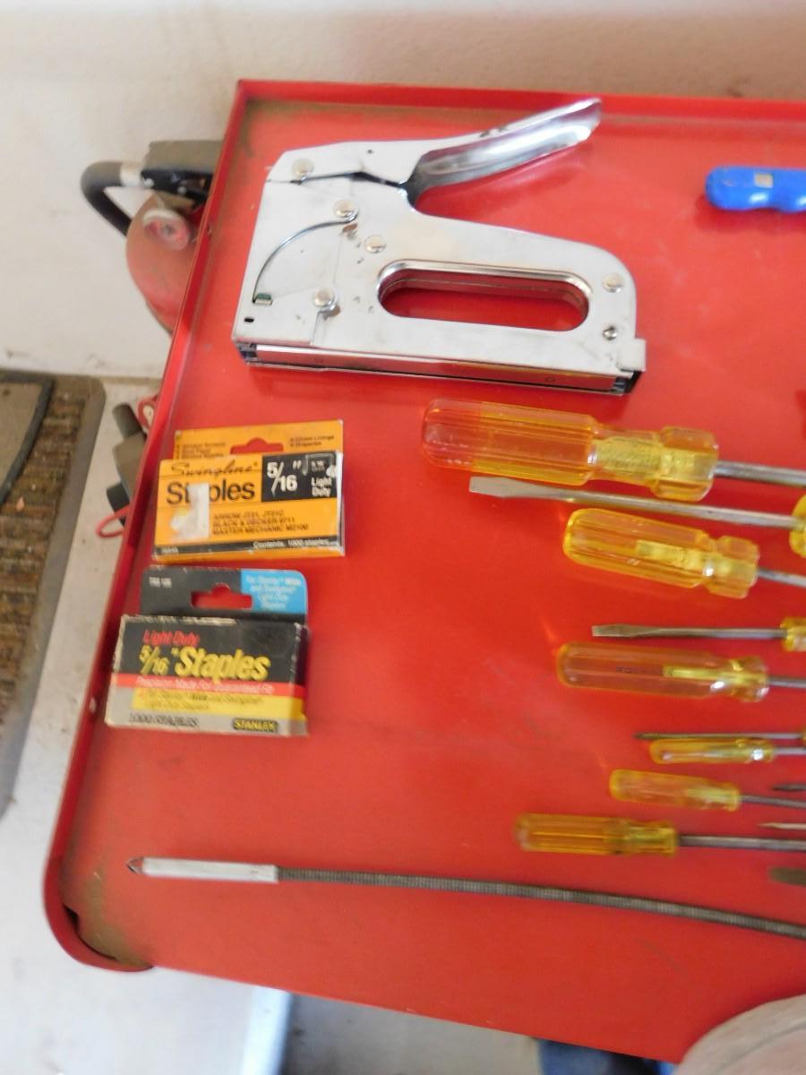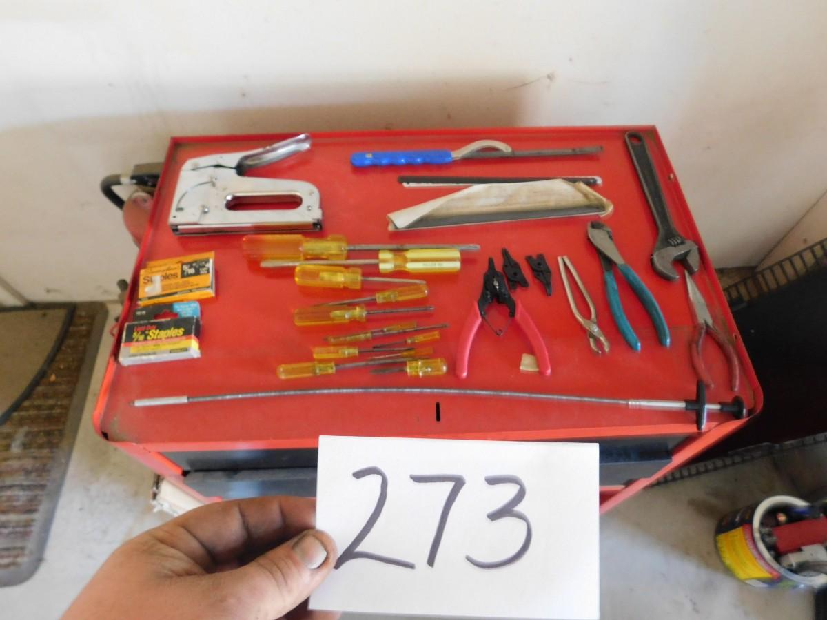 LOT 273 STANLEY STAPLER, STAPLES, HAND SAW W/ BLADES SCREW DRIVERS, CRESCENT WRENCH, NEEDLE NOSE, SIDE CUTTER, SNAP RING PLIERS