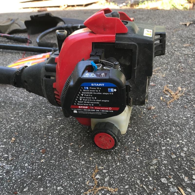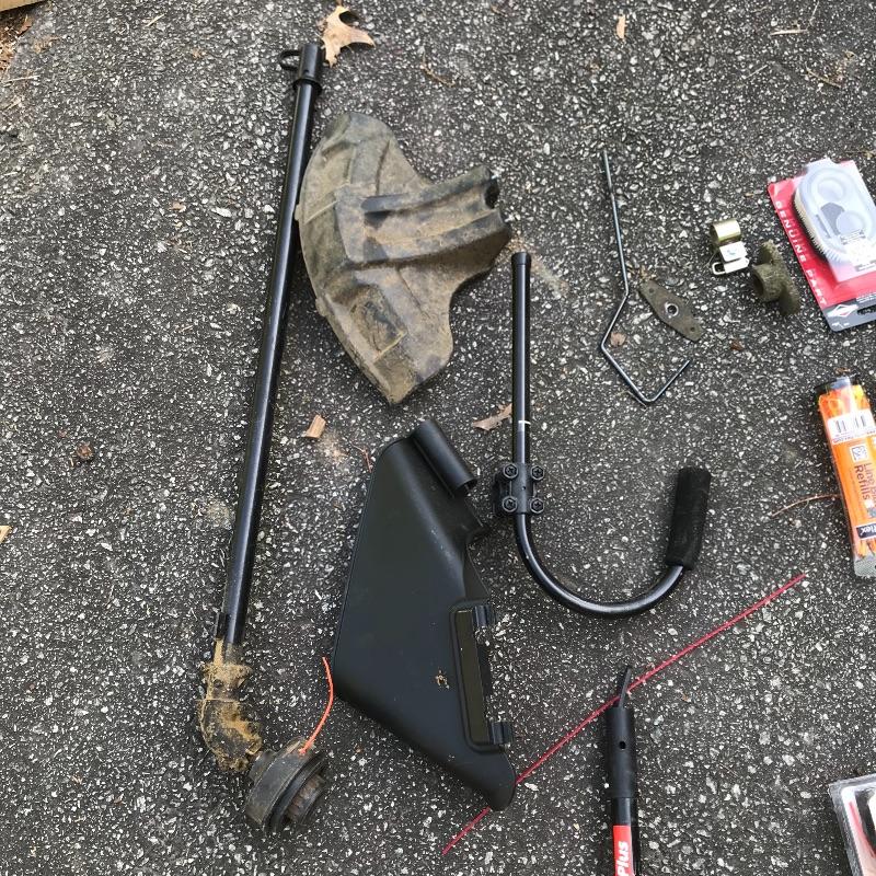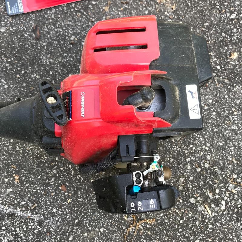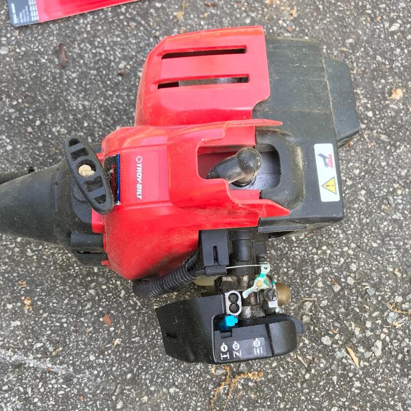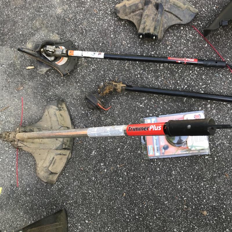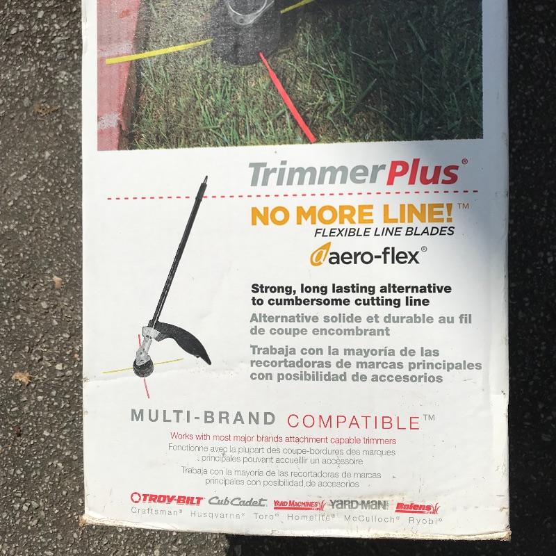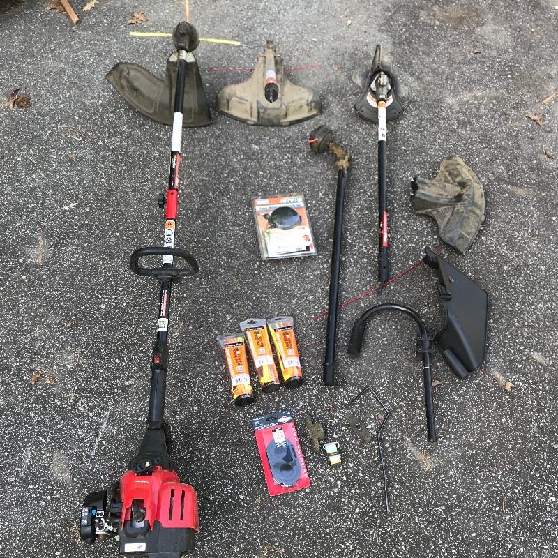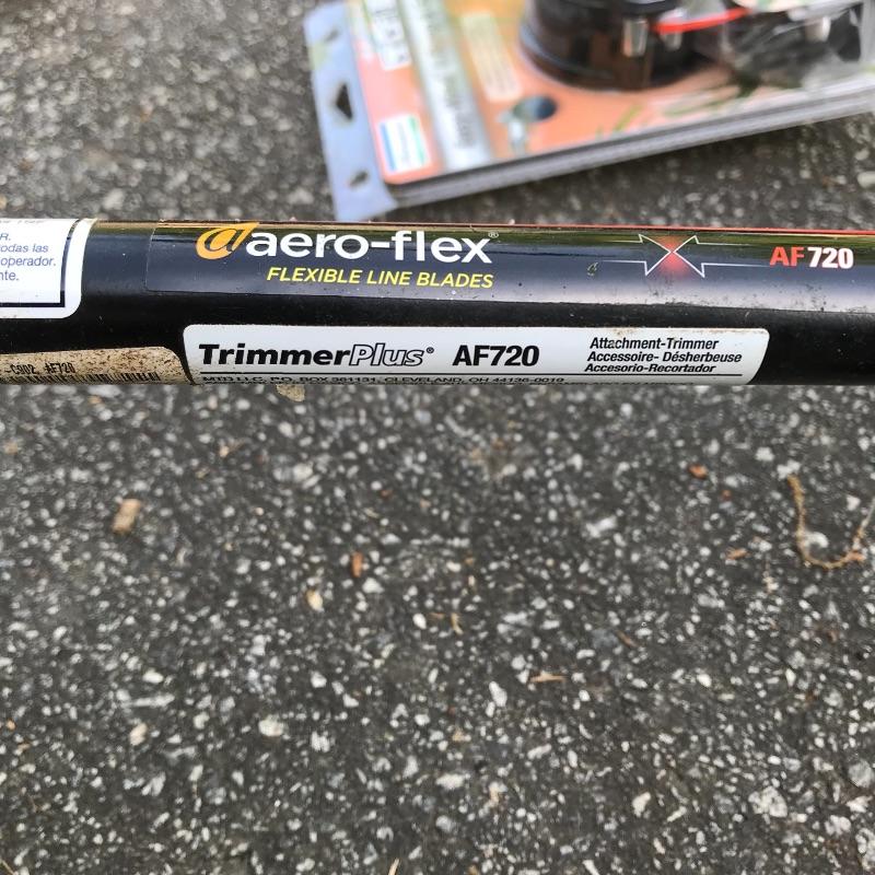 Trimmer Plus Aero-Flex AF720 with Troy-Bilt gasoline motor has flexible line blades and more than two refill kits. Cord moves freely, but ST team was unable to start motor. Trimmer Plus BC-720 and AS-720 appear to connect with motor for all your trimming needs. Lot also includes Briggs and Stratton air filter, Easy-Wind II Bump & Go and other parts/instruments. See photos. No shipping.