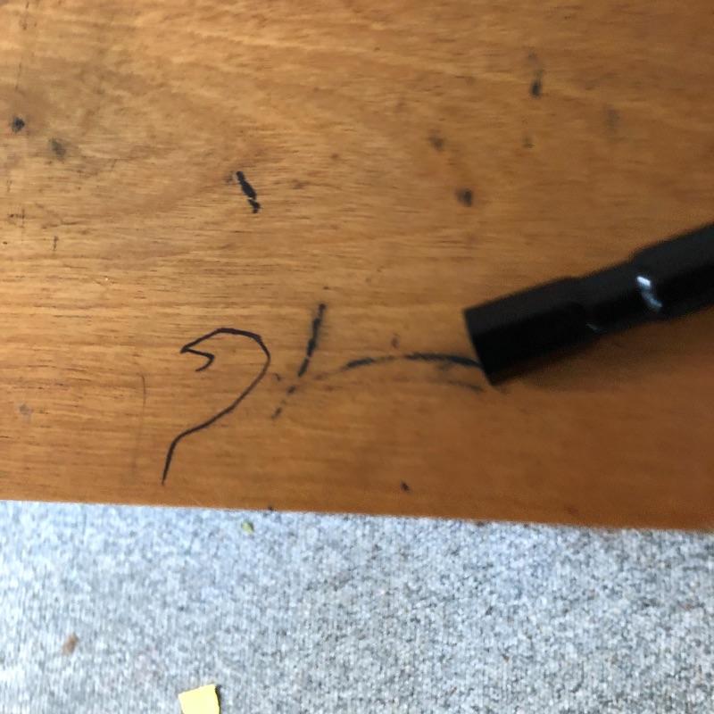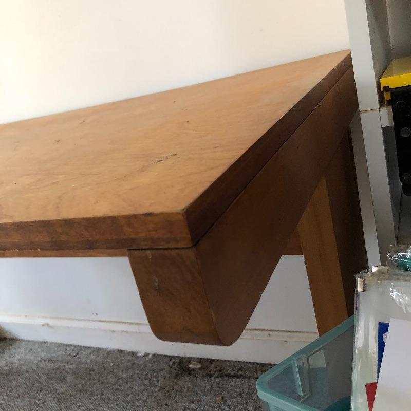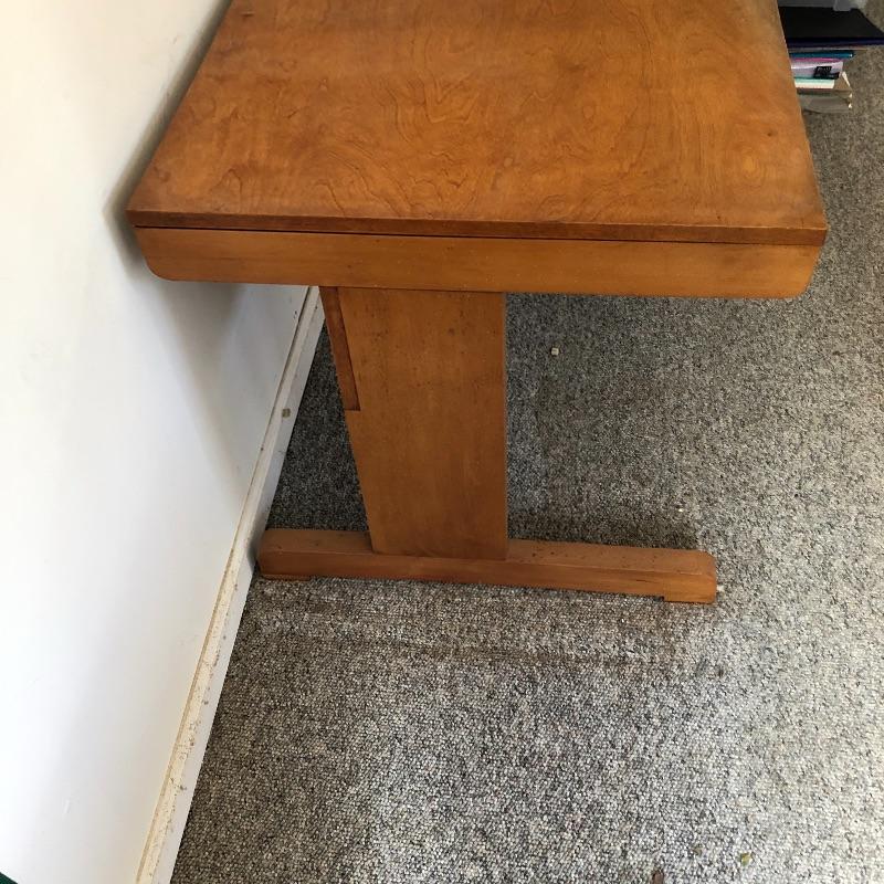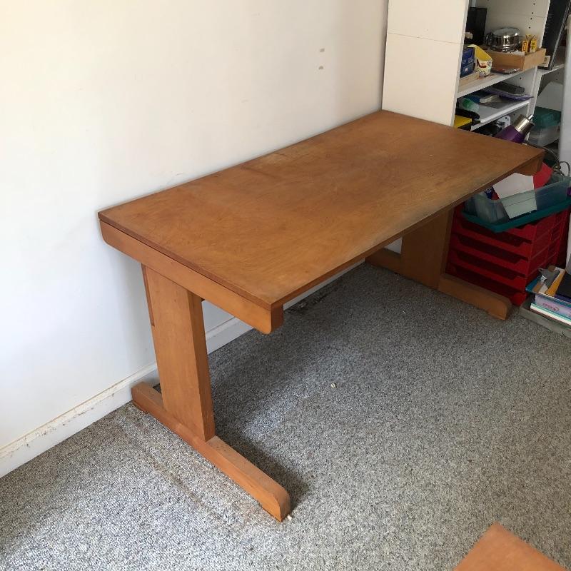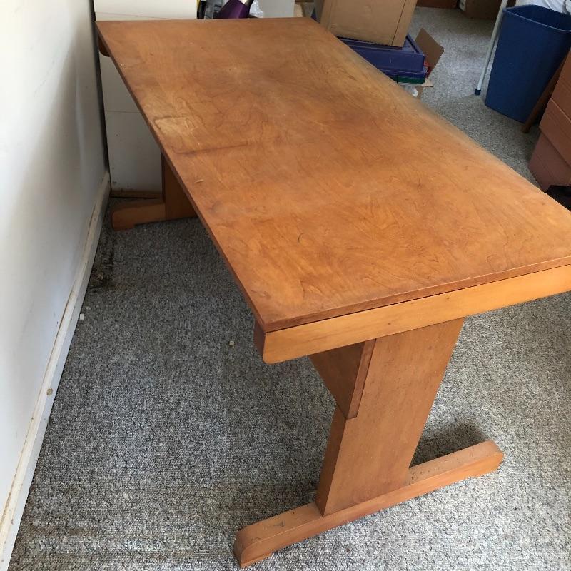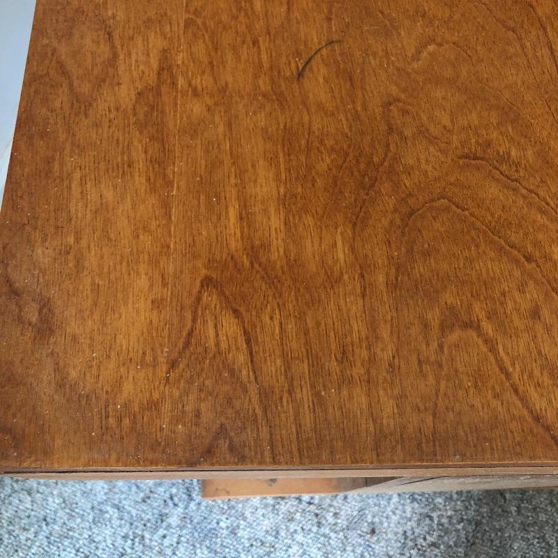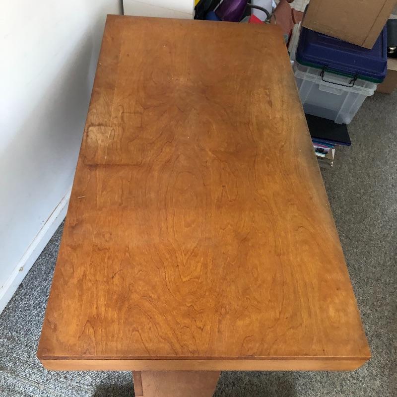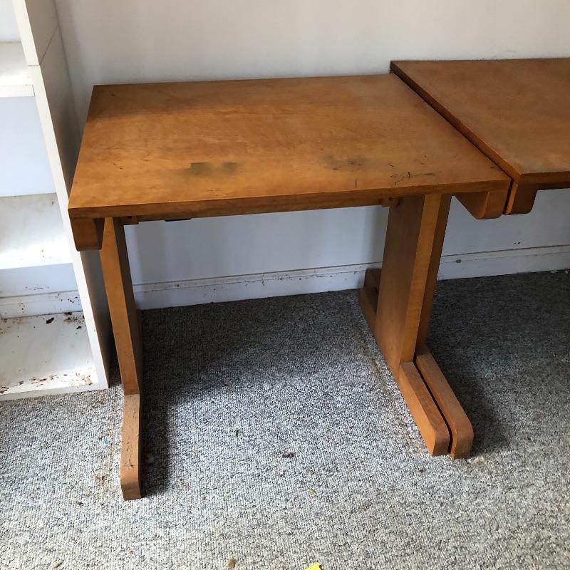 This desk and side table are matching wood pieces. The desk is a hair shorter and less deep and has a few pen marks shown in an image.