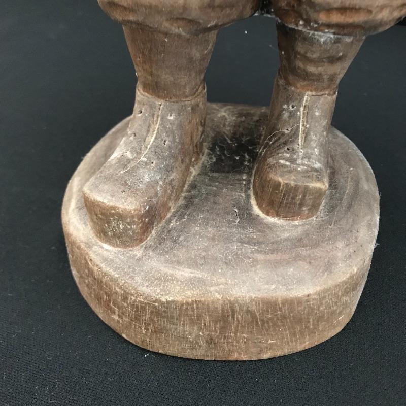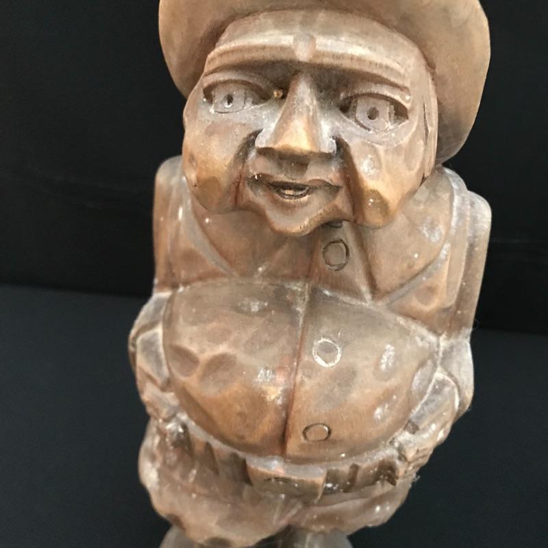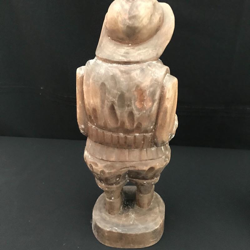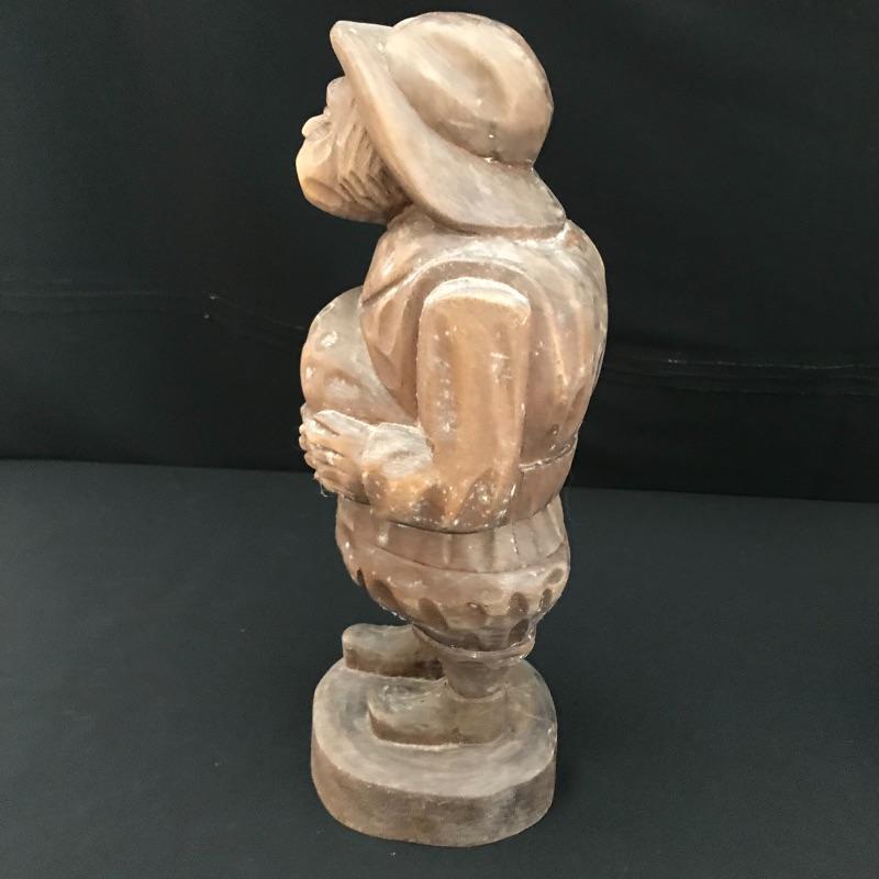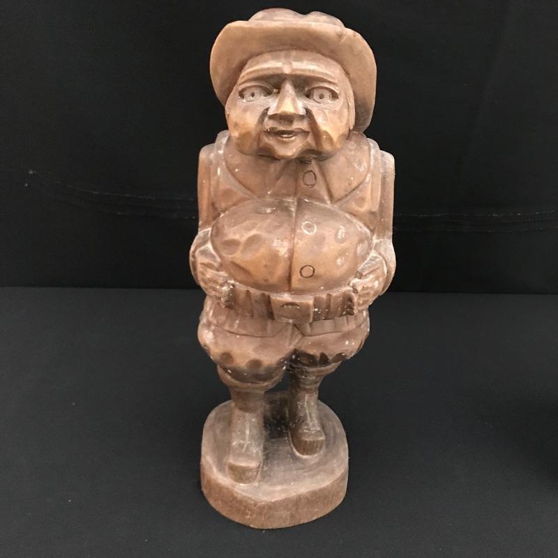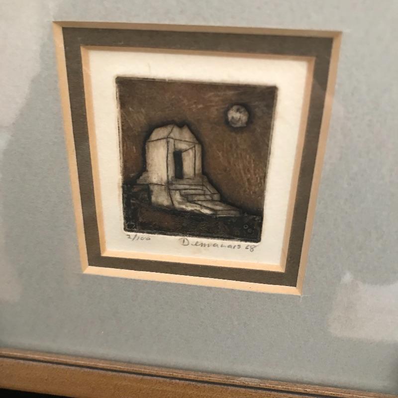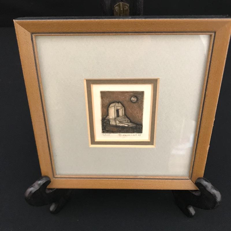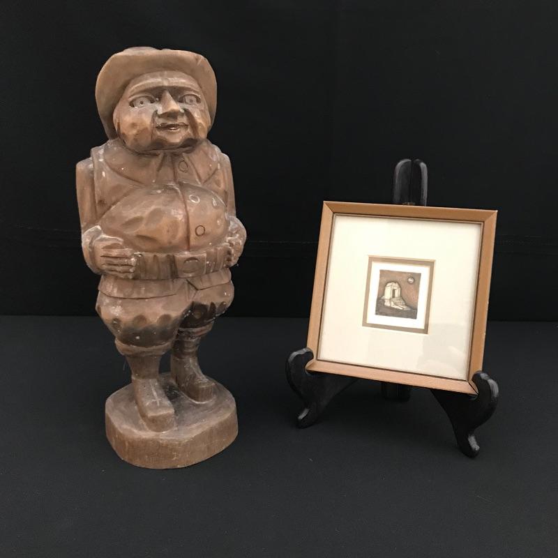 Lot includes jovial wood statue of big-bellied man (approx. 14” tall). Also included in lot is a sweet limited addition piece of artwork with a temple and moon. Reads “2/100 Demanais “68.”