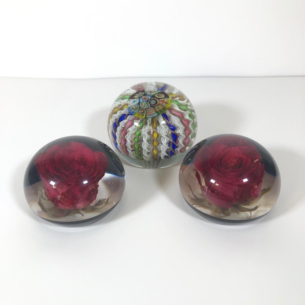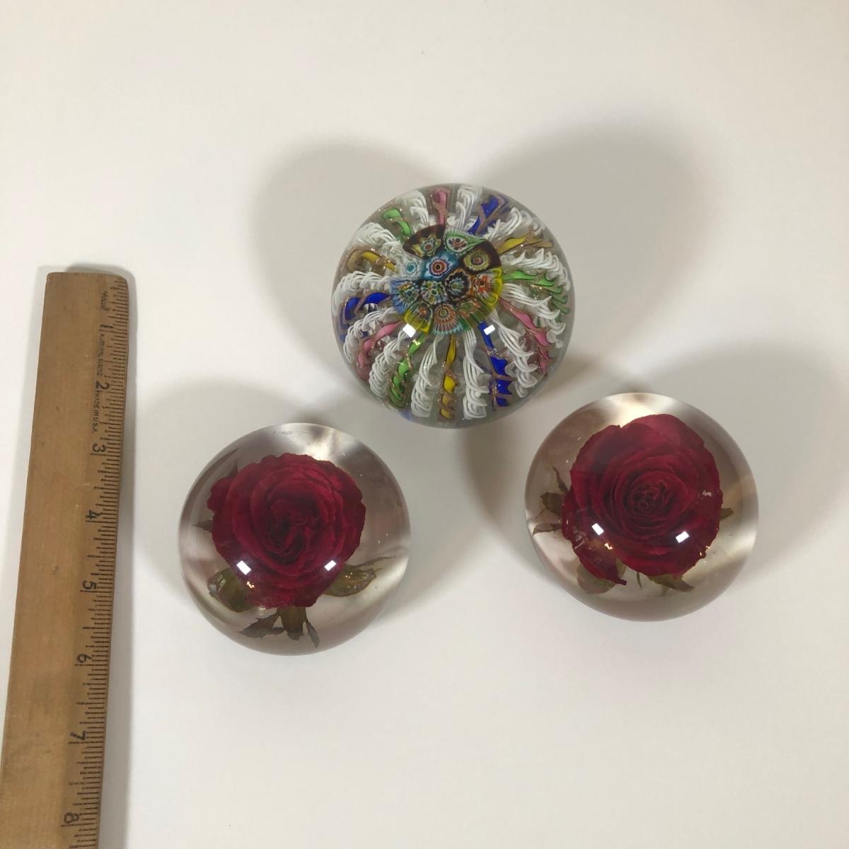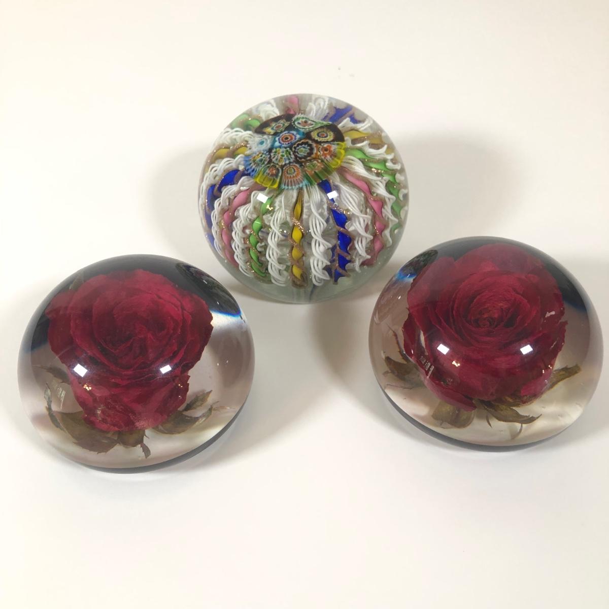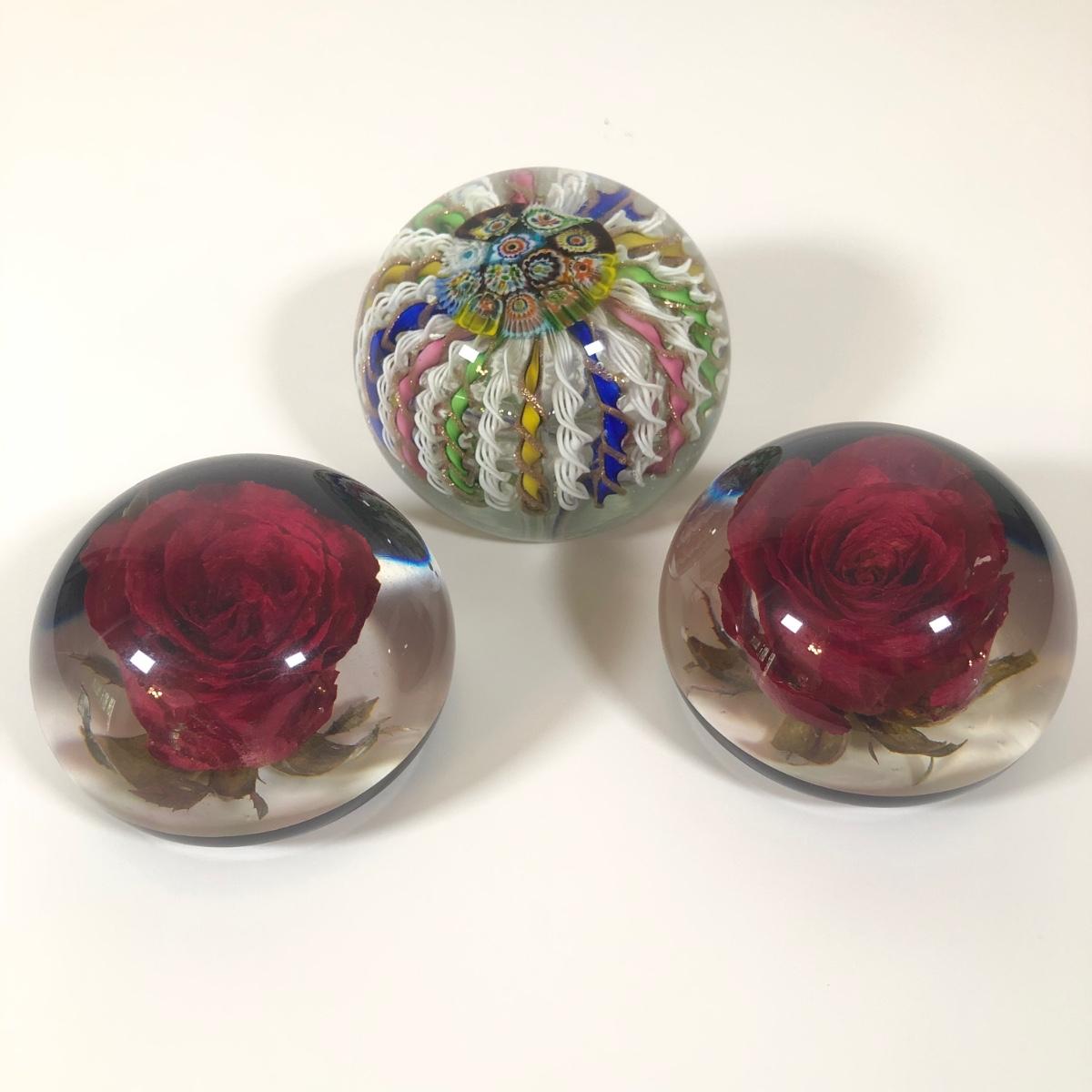 LOT 273L: Glass Millefiori Paperweight & 2 Encased Rose Paperweights