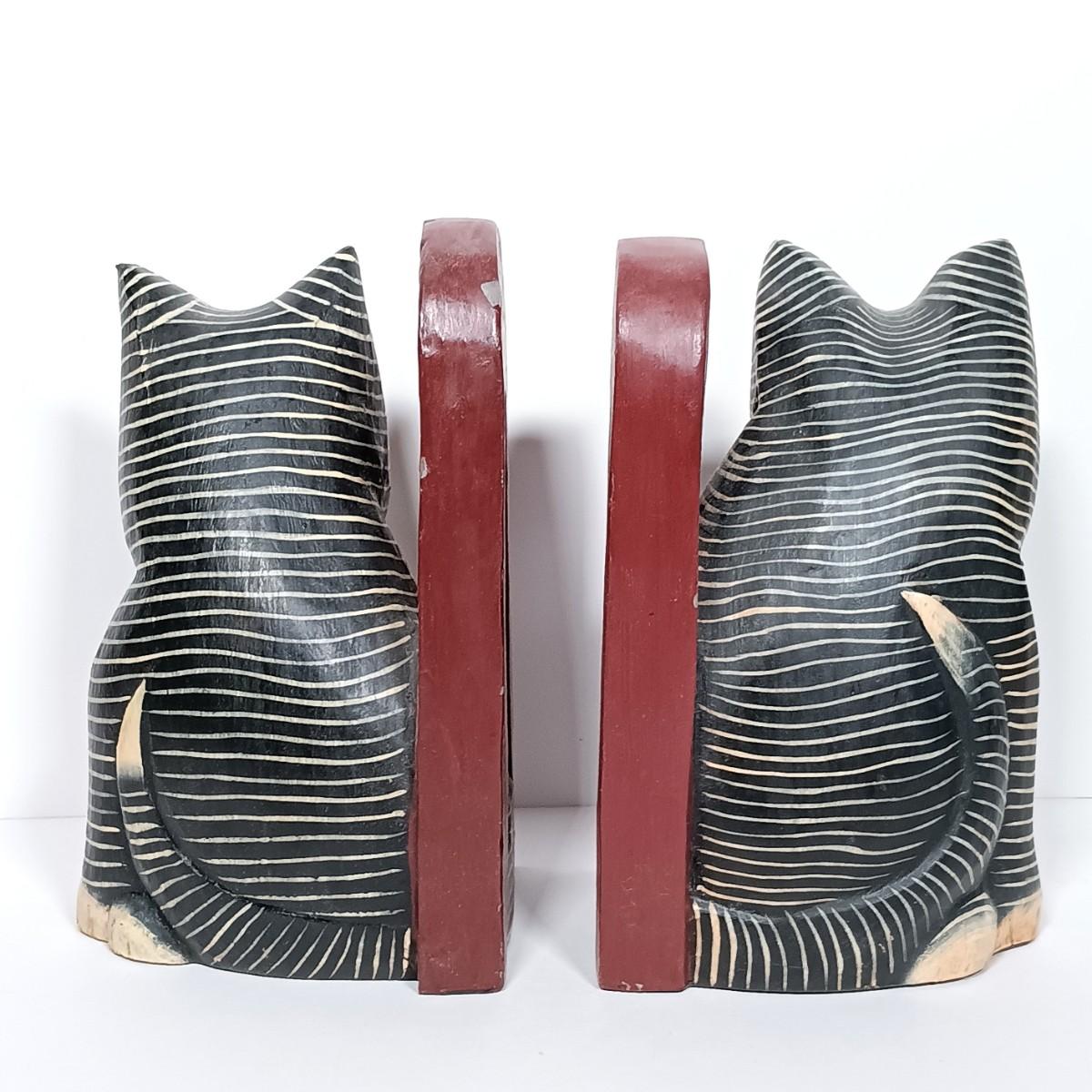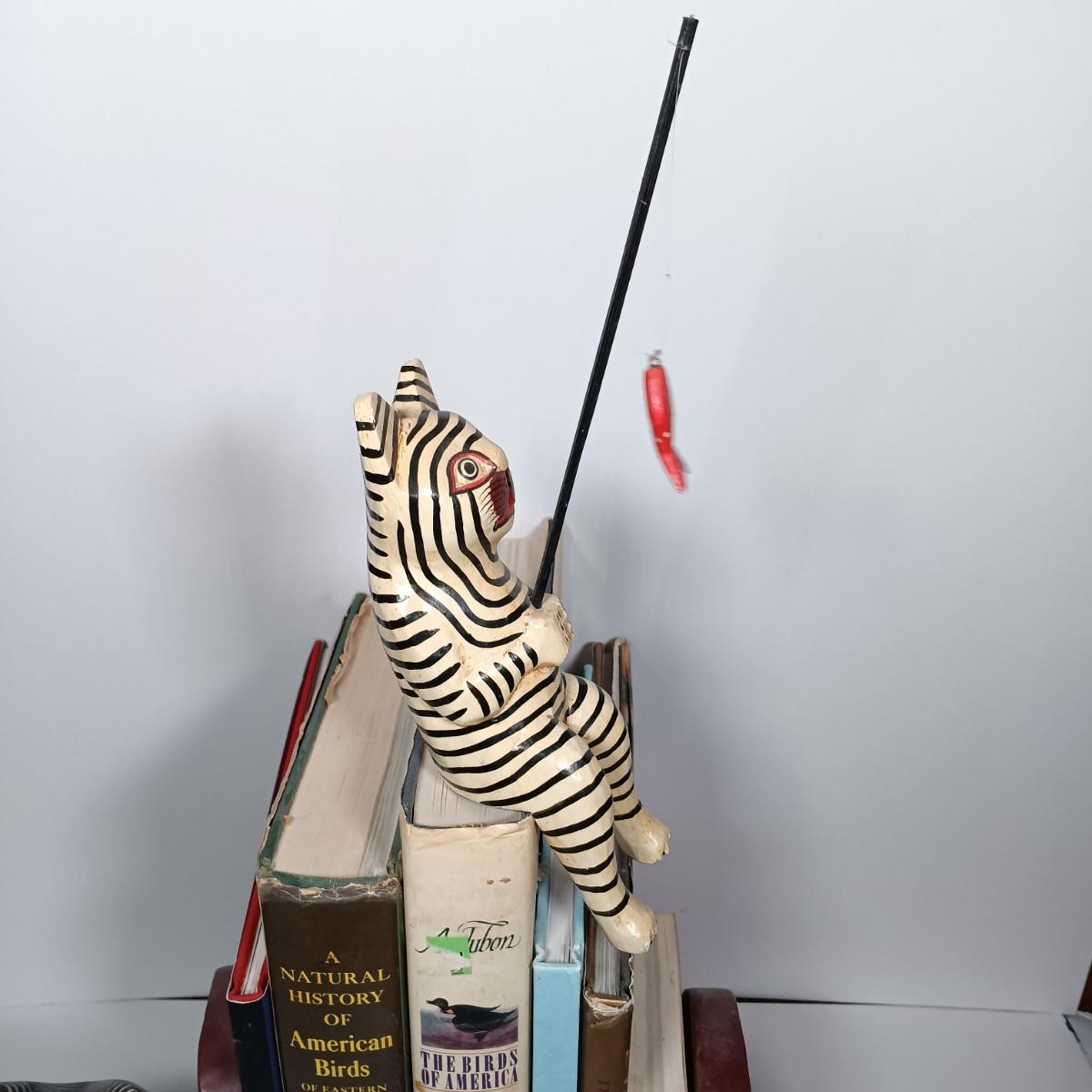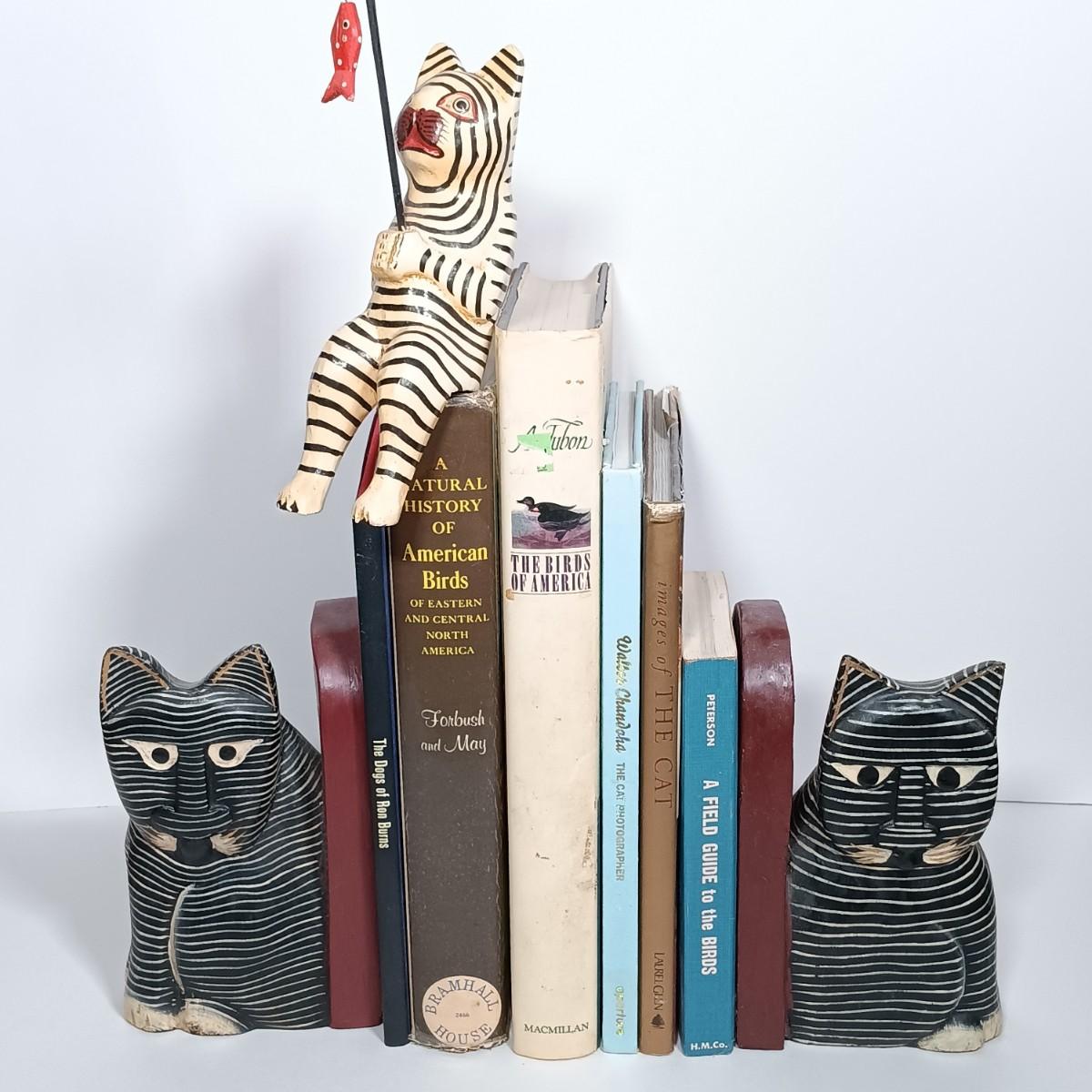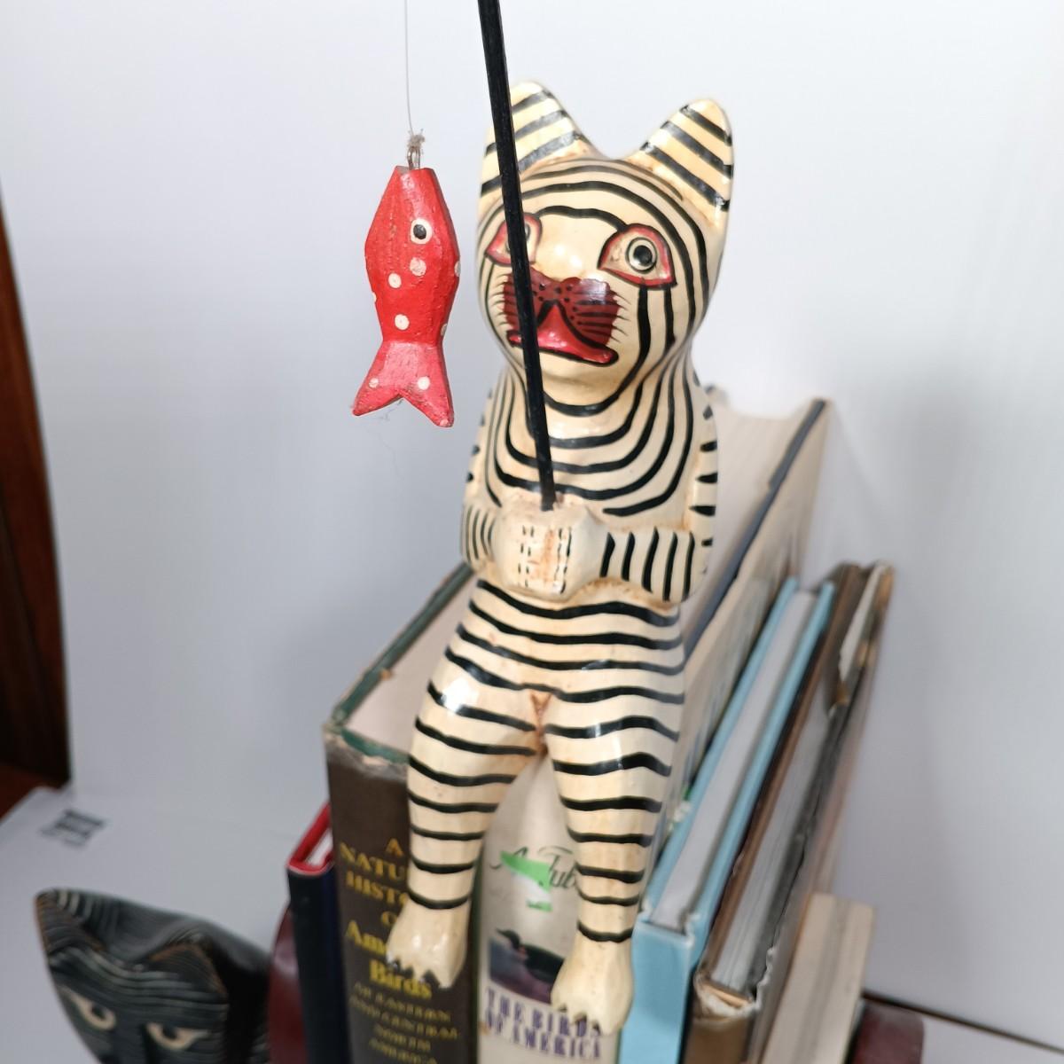 LOT 274: Carved Wood Fishing Cat and Cat Bookends with Books