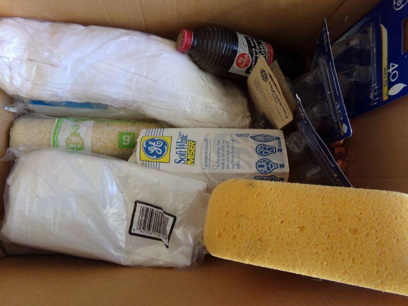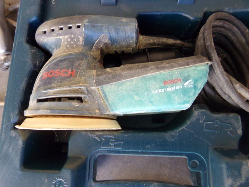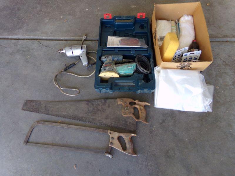 HACK & HAND SAW, SHOP-CRAFT DRILL, BOSCH SANDER, BOX: VARIOUS LIGHTS, SPONGE, DROP CLOTH/PLASTIC