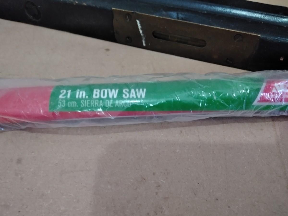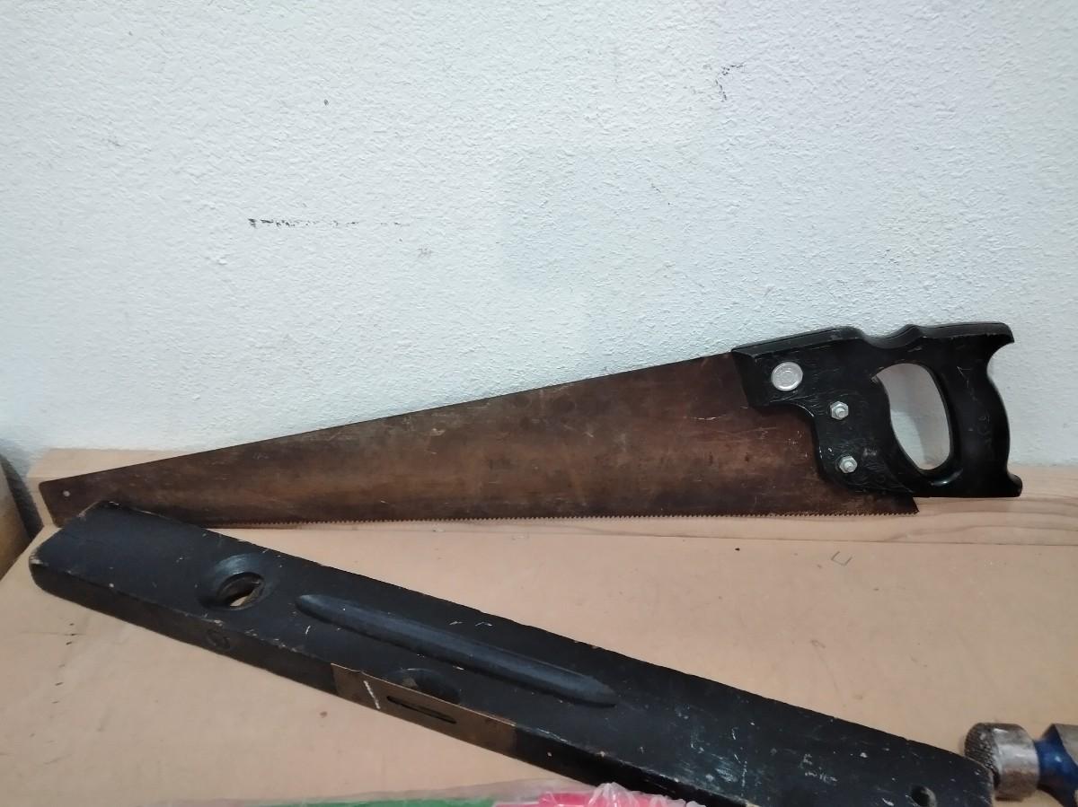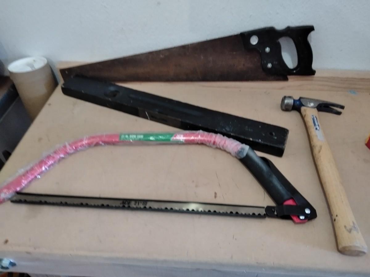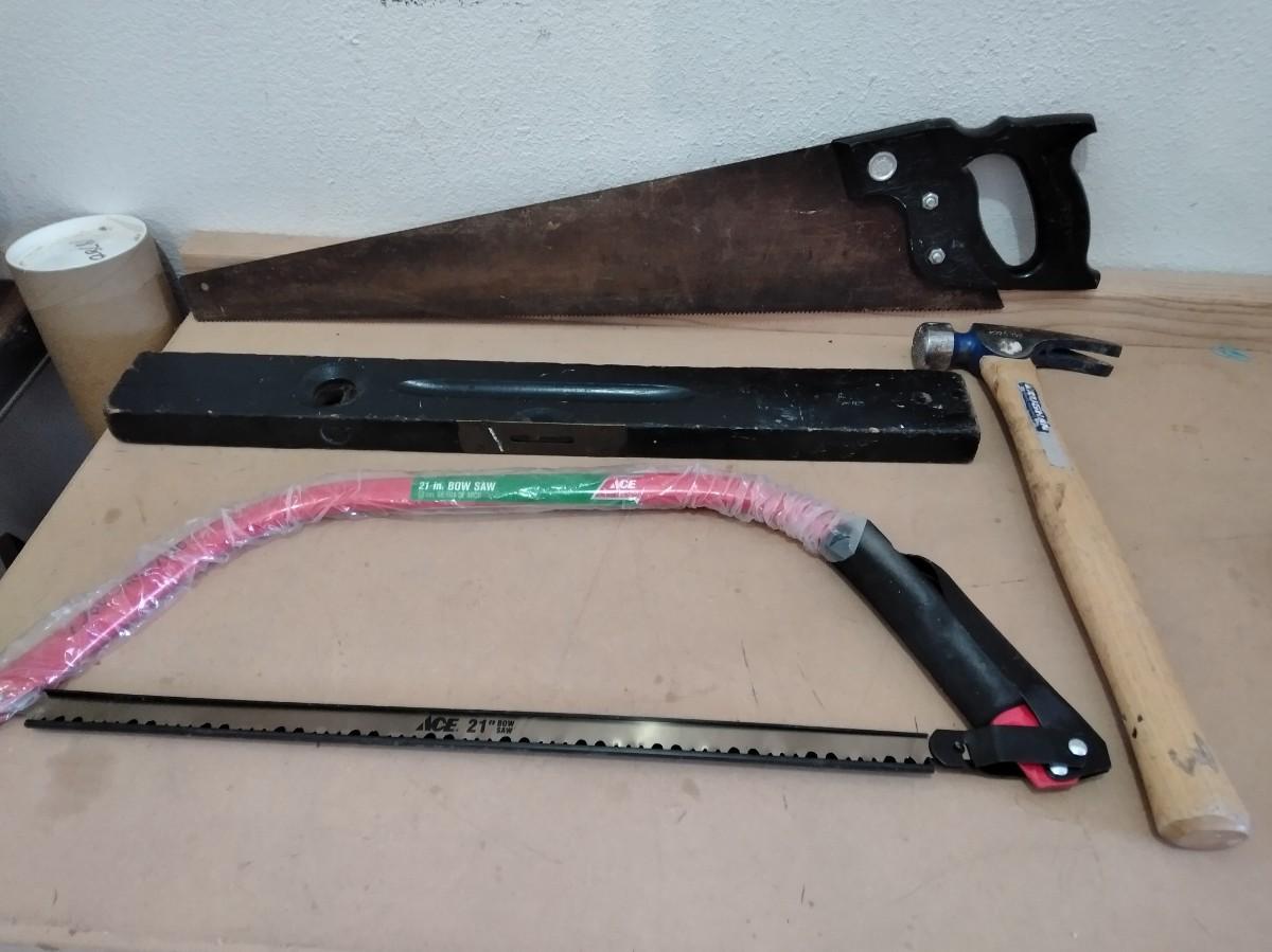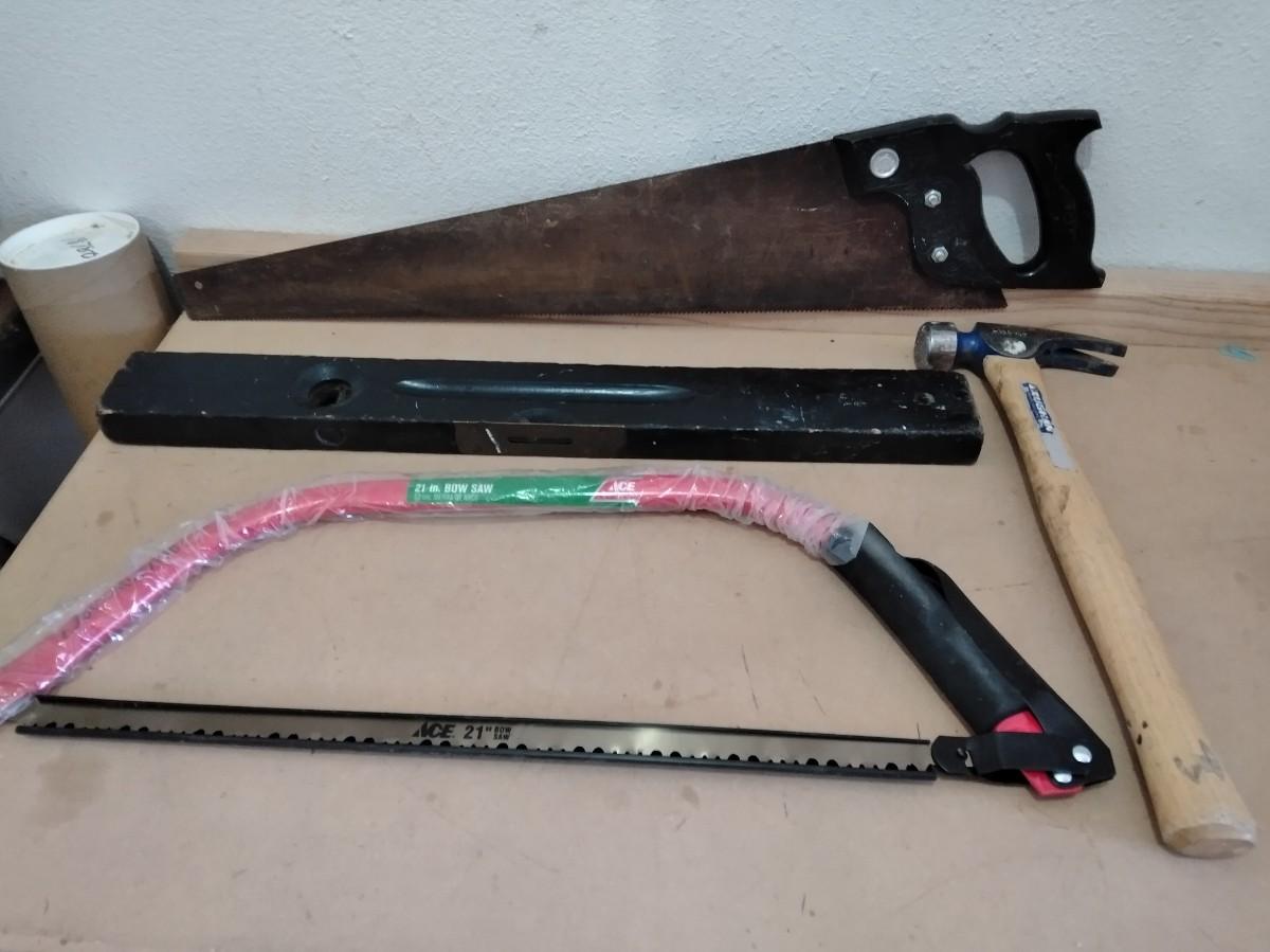 WOOD SAW WITH PLASTIC HANDLE, OLD WOODEN LEVEL, HAMMER, AND A NEW BOW SAW.