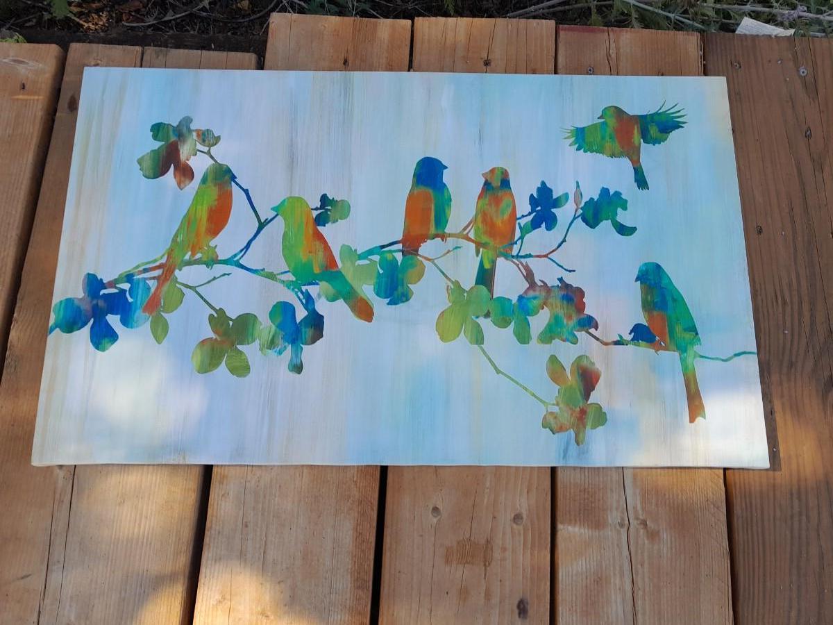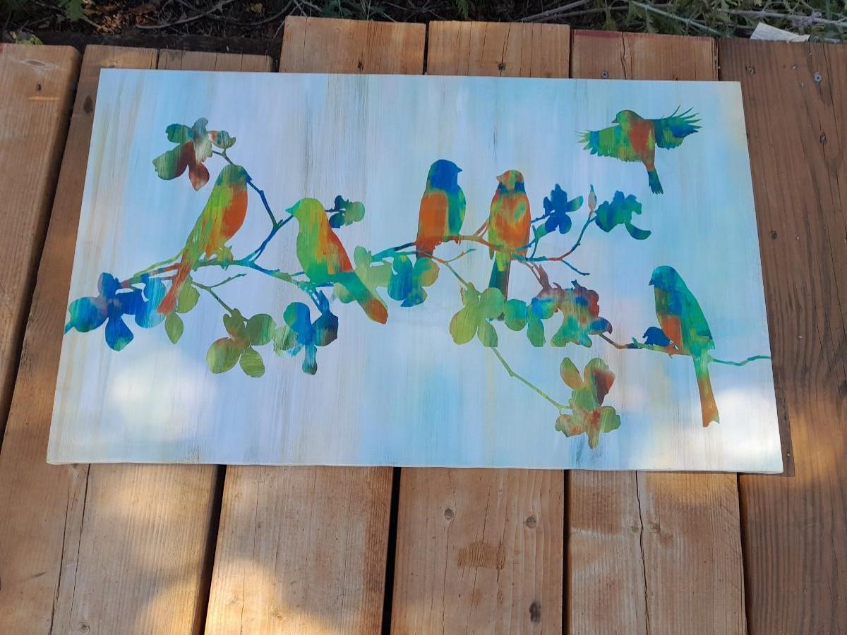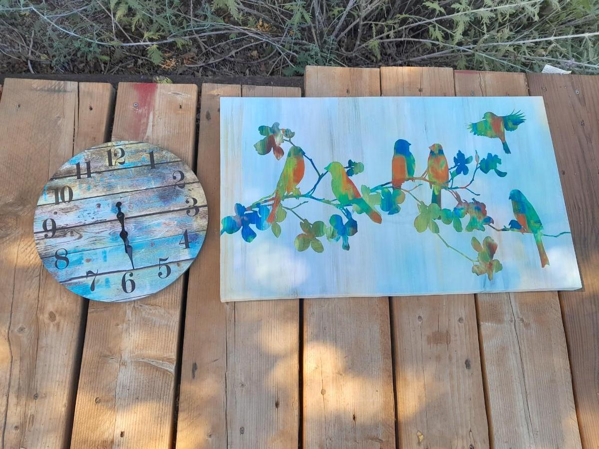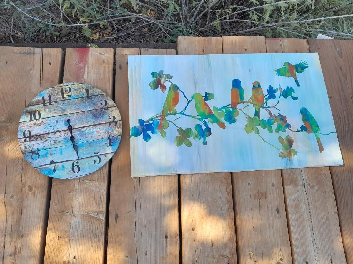 CANVAS WALL ART WITH BIRDS 30" X 18" AND RUSTIC WALL CLOCK 14"