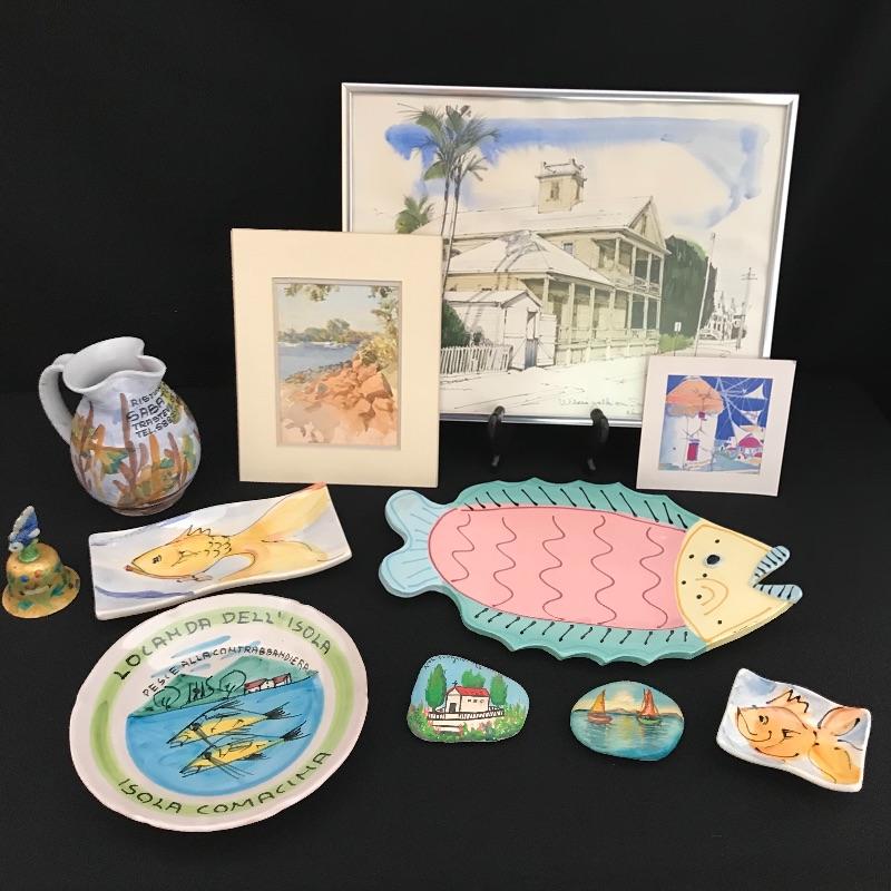Bring the beach and all that you love about it to your home with this lovely collection of beach inspired home-ware. Lot includes beach-themed artwork, ceramics, and more. The largest painting is signed by the artist and reads “Widow’s Walk on Southend Street, Keywest.” The artist’s name appears to be Dorems and it is 16.5” x 12.5”. The large fish platter is approx. 14” x 9”. See images for details.