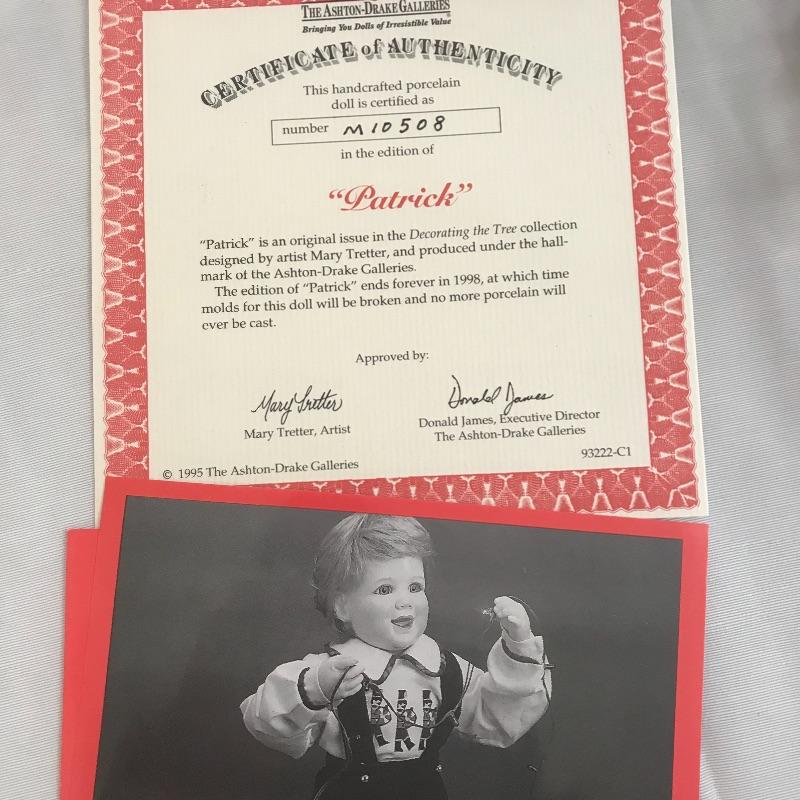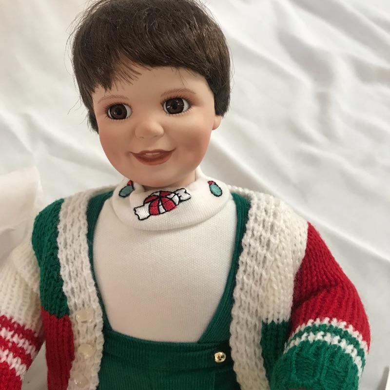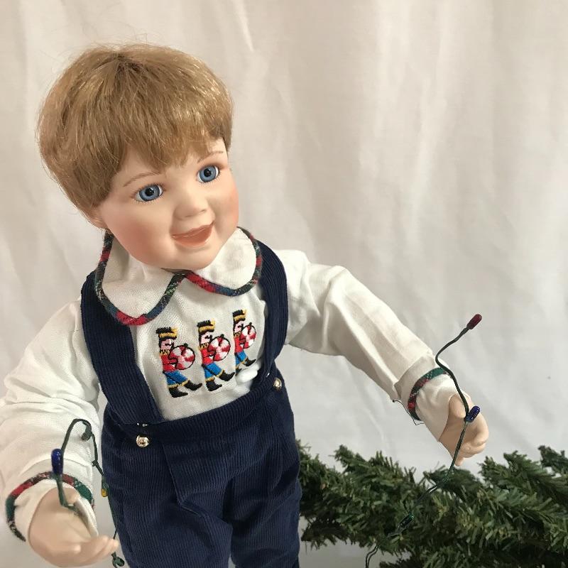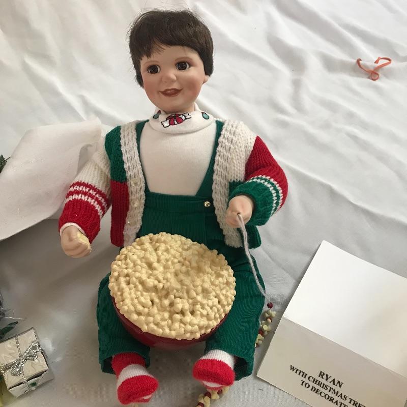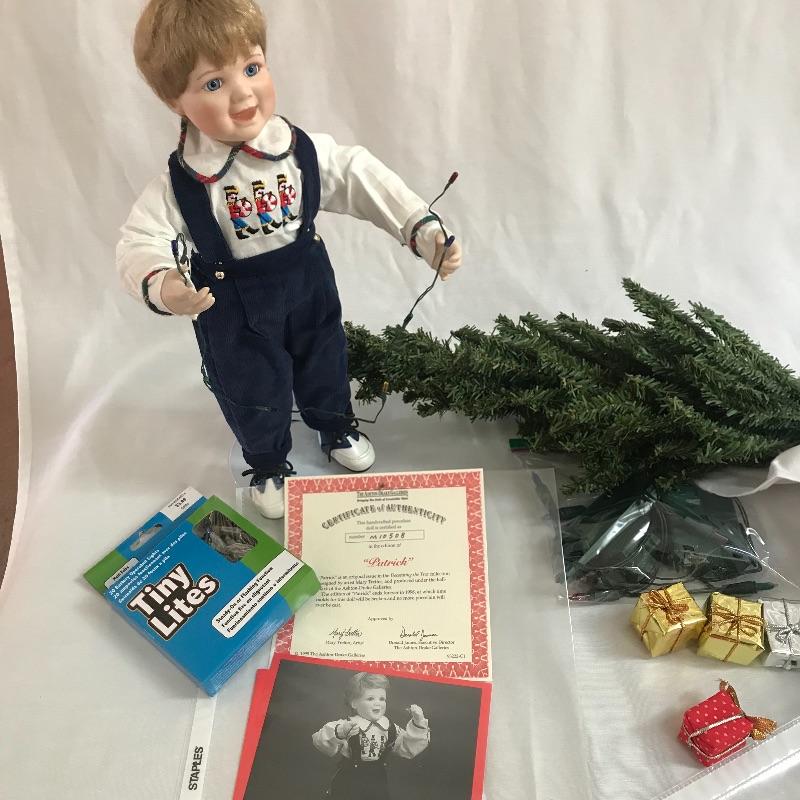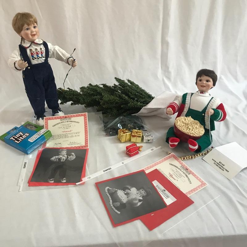 Two dolls from Ashton- Drake, Patrick - With Christmas Tree lights and Ryan stringing popcorn for Christmas tree. Both have COAs and there is an artificial tree with lights and packages that the owner added from her display. These dolls are in good condition and in their original boxes. Shipping available.