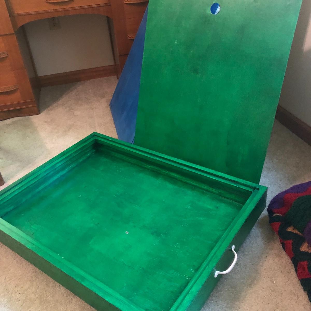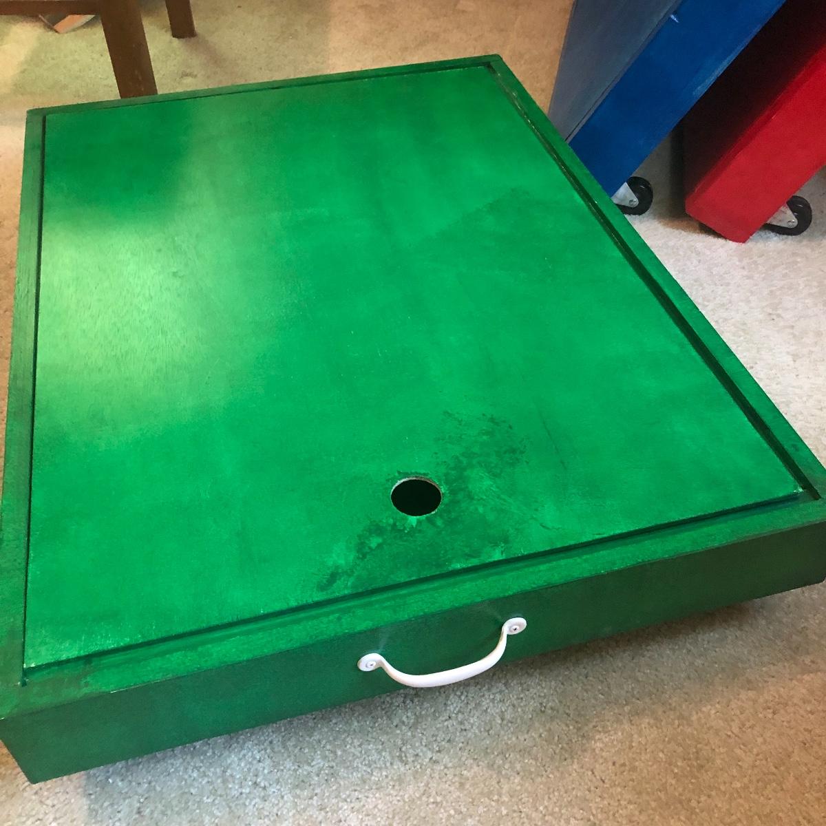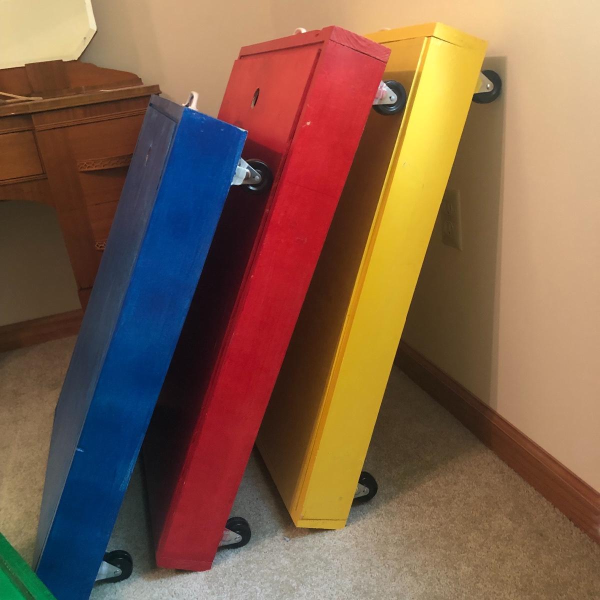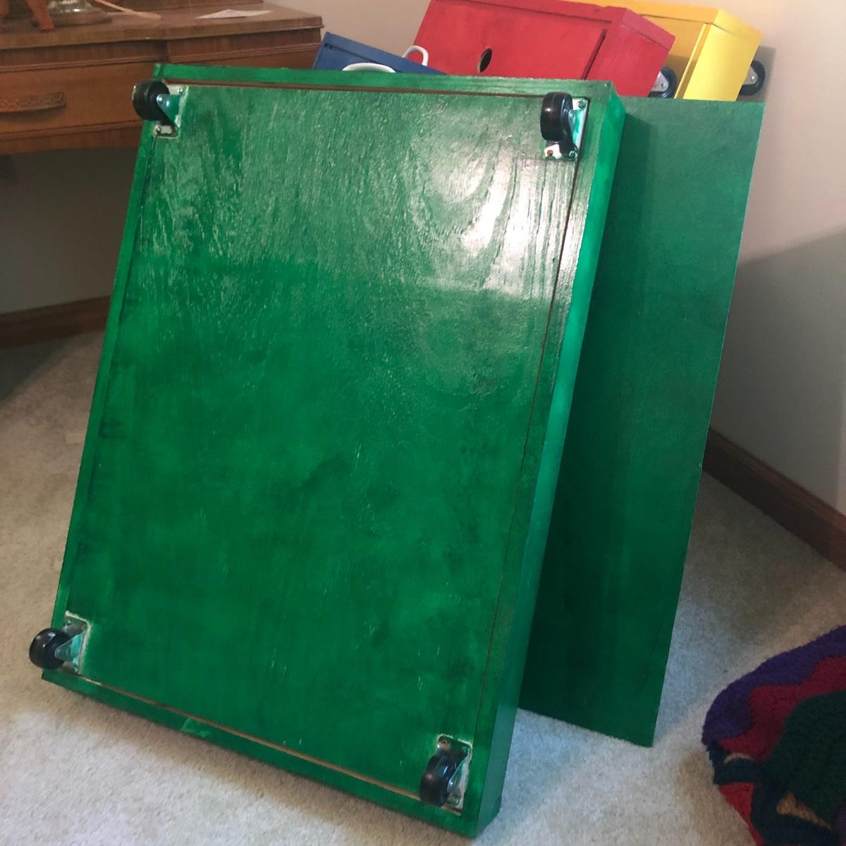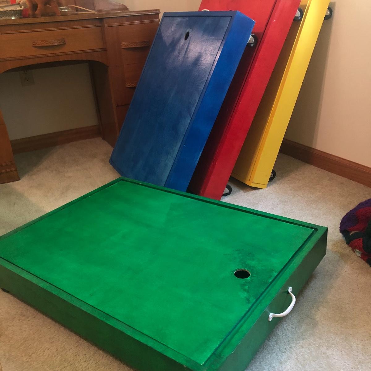 These four heavy duty, home made bins are made of wood and all have wheels for easy mobility. Store your treasures and slide them under the bed! Each bin measures 24” x 32” and each bin has a removable lid. Local pick up only.