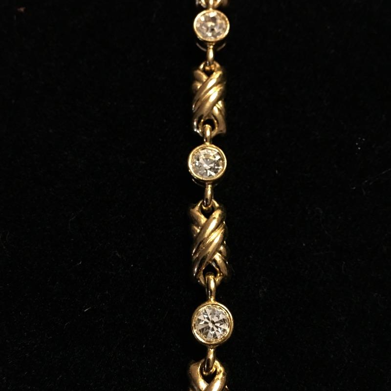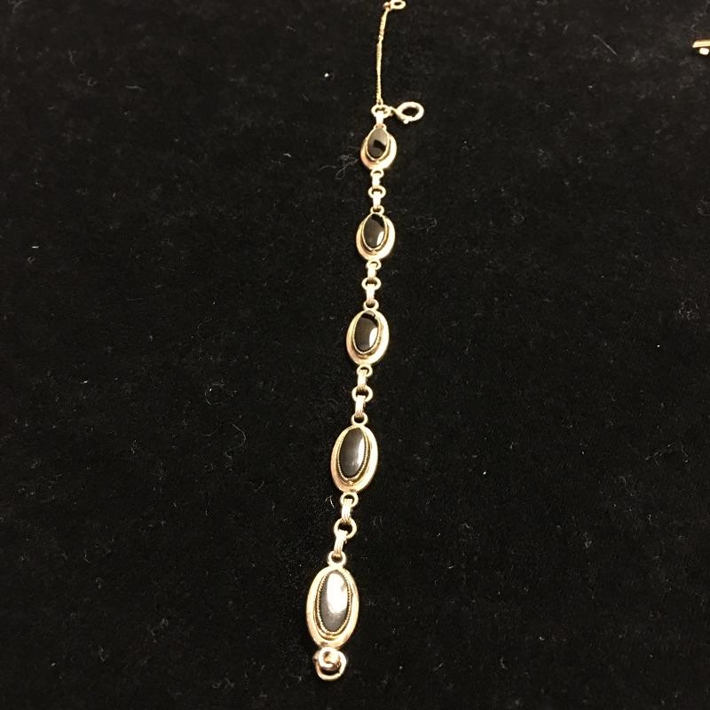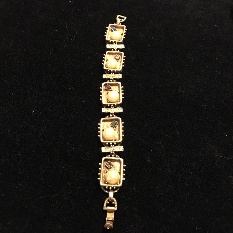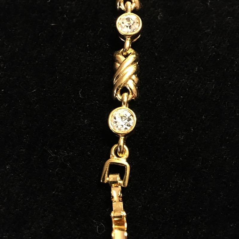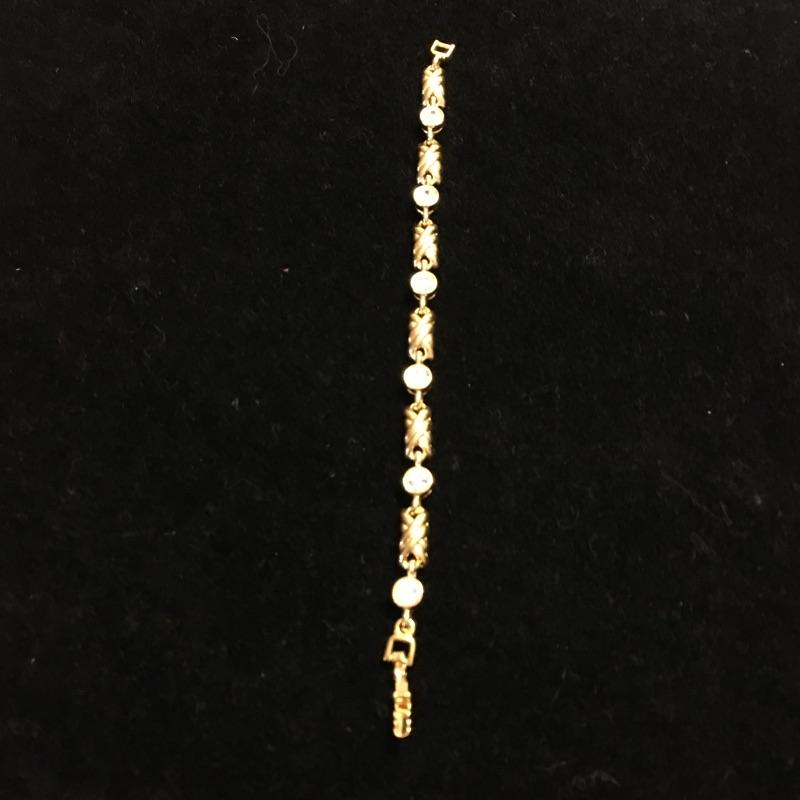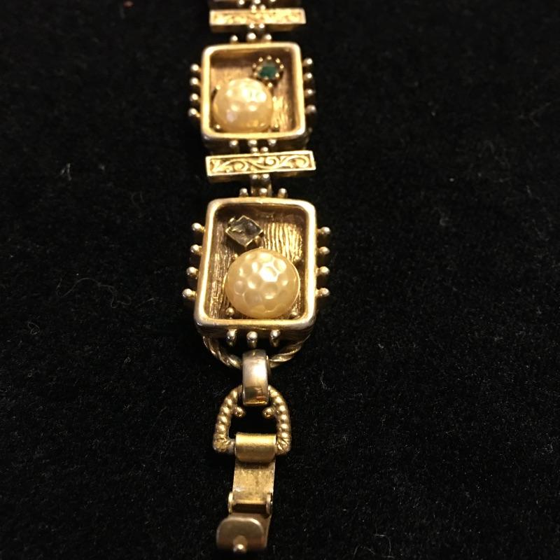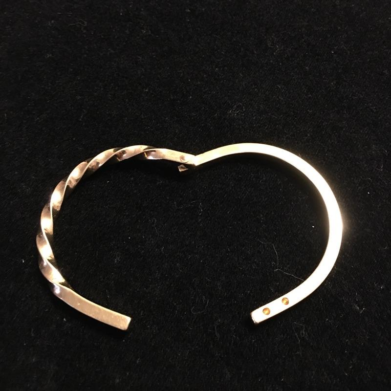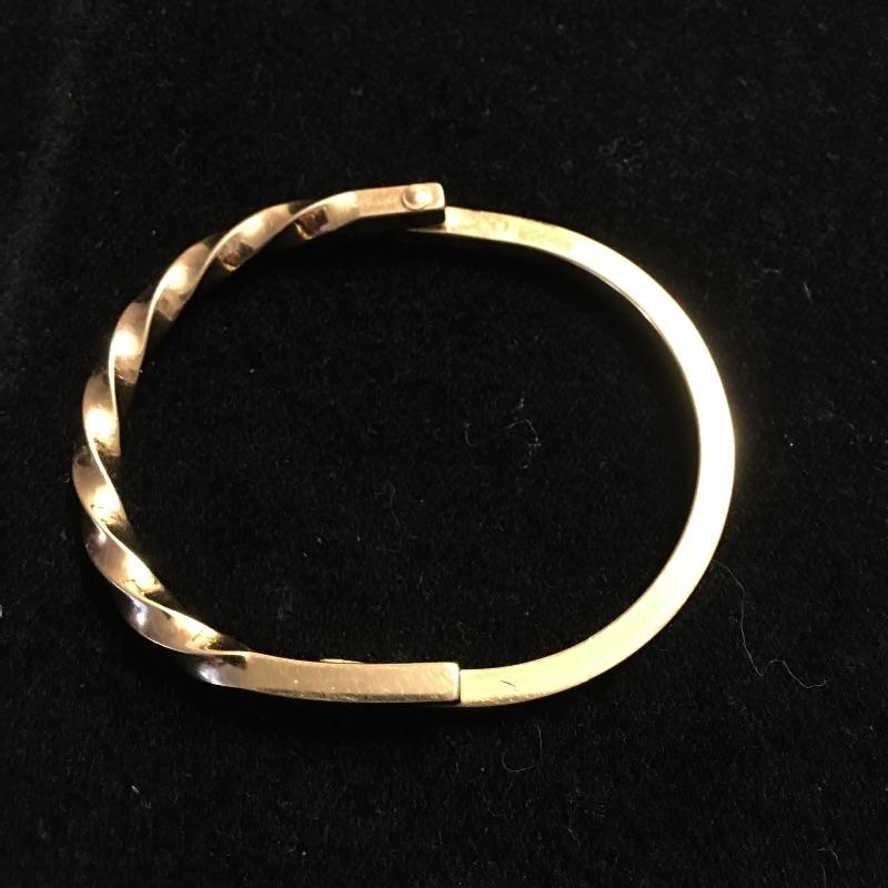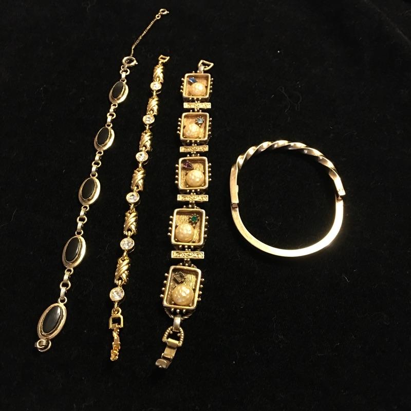Golden bracelets includes four gold colored bracelets in a variety of styles and textures. All bracelets are unmarked. Add a little variety to your look with these four unique pieces.