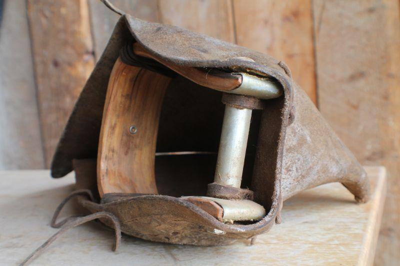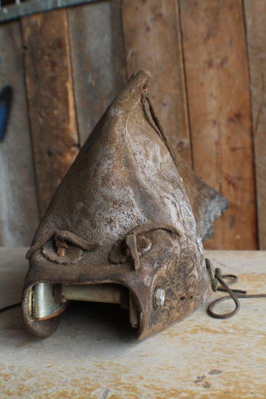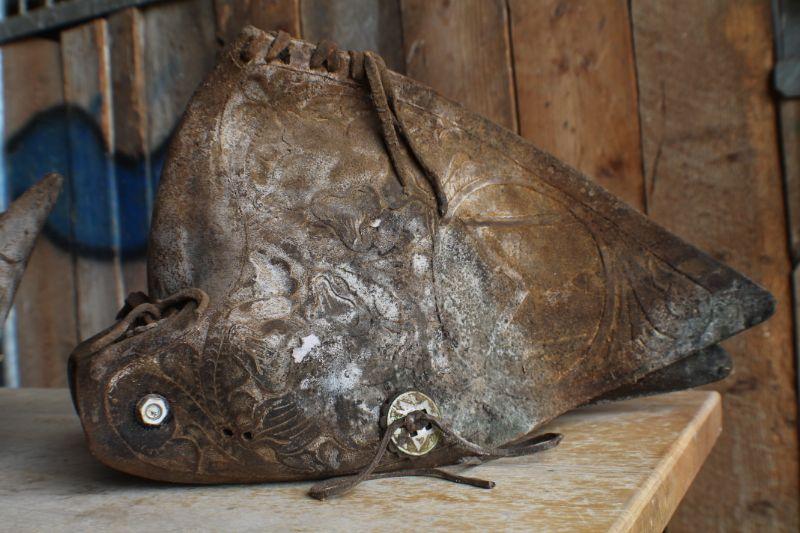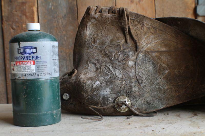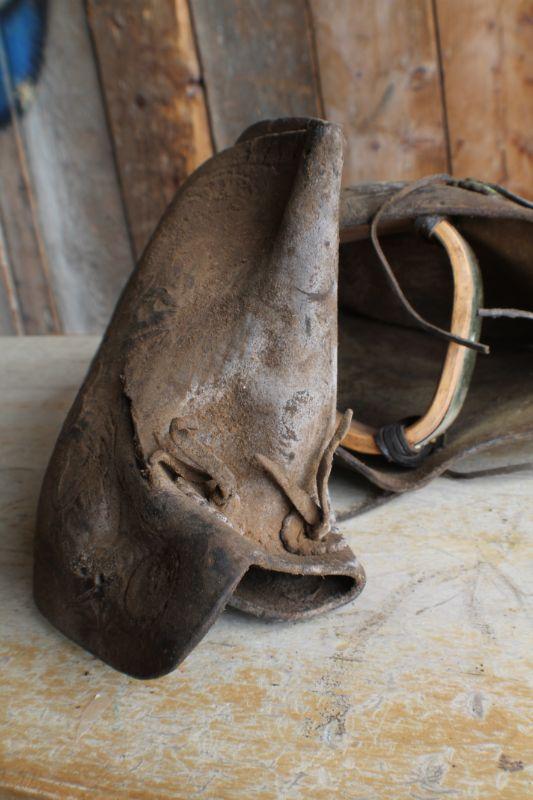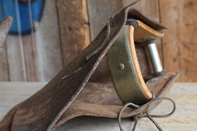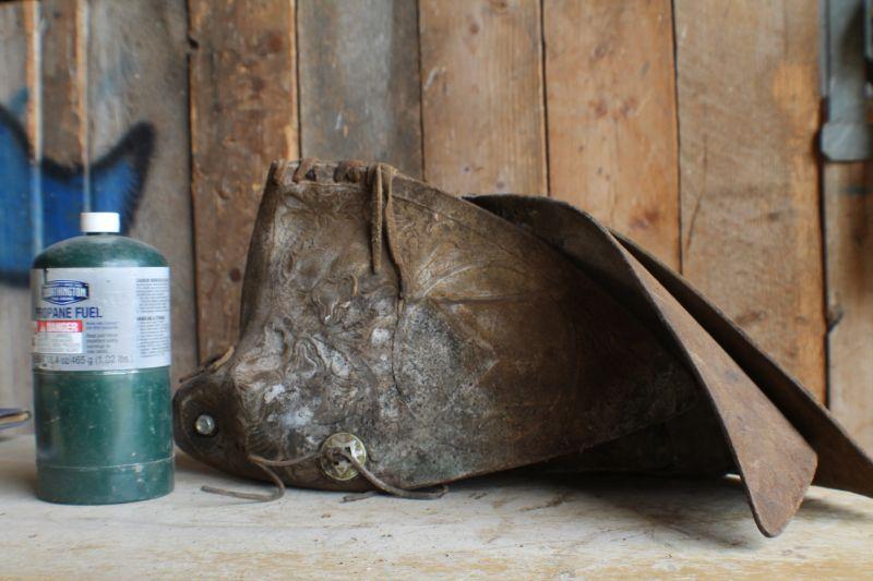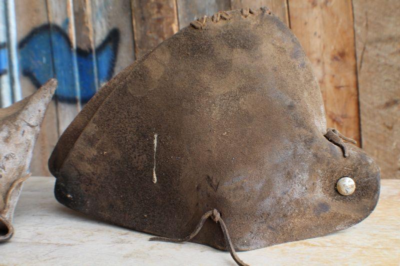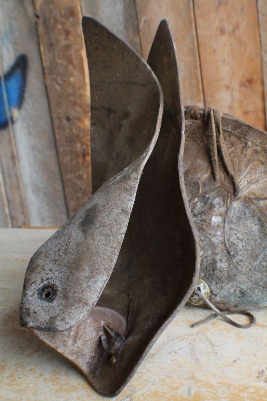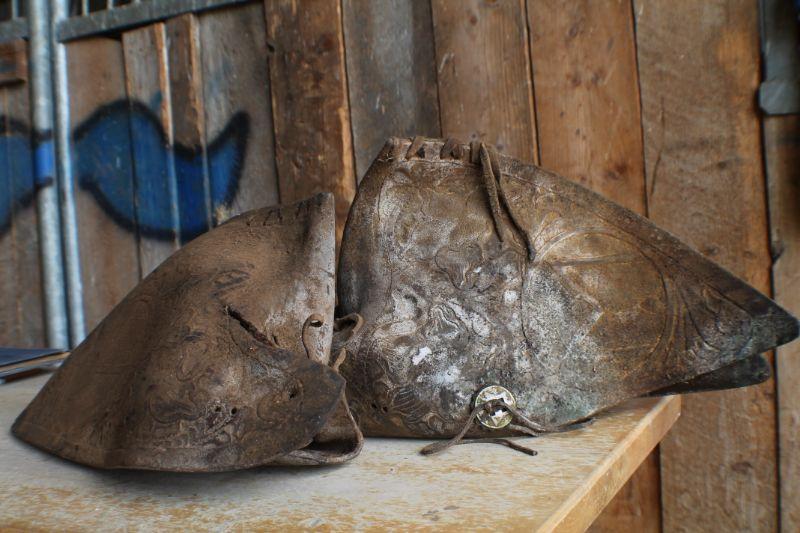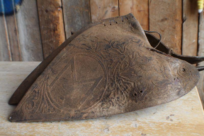 Lot #274: Vintage Hand Tooled Set of "M" Monogrammed Thick Leather Stirrup Covers (one has original stirrup inside)