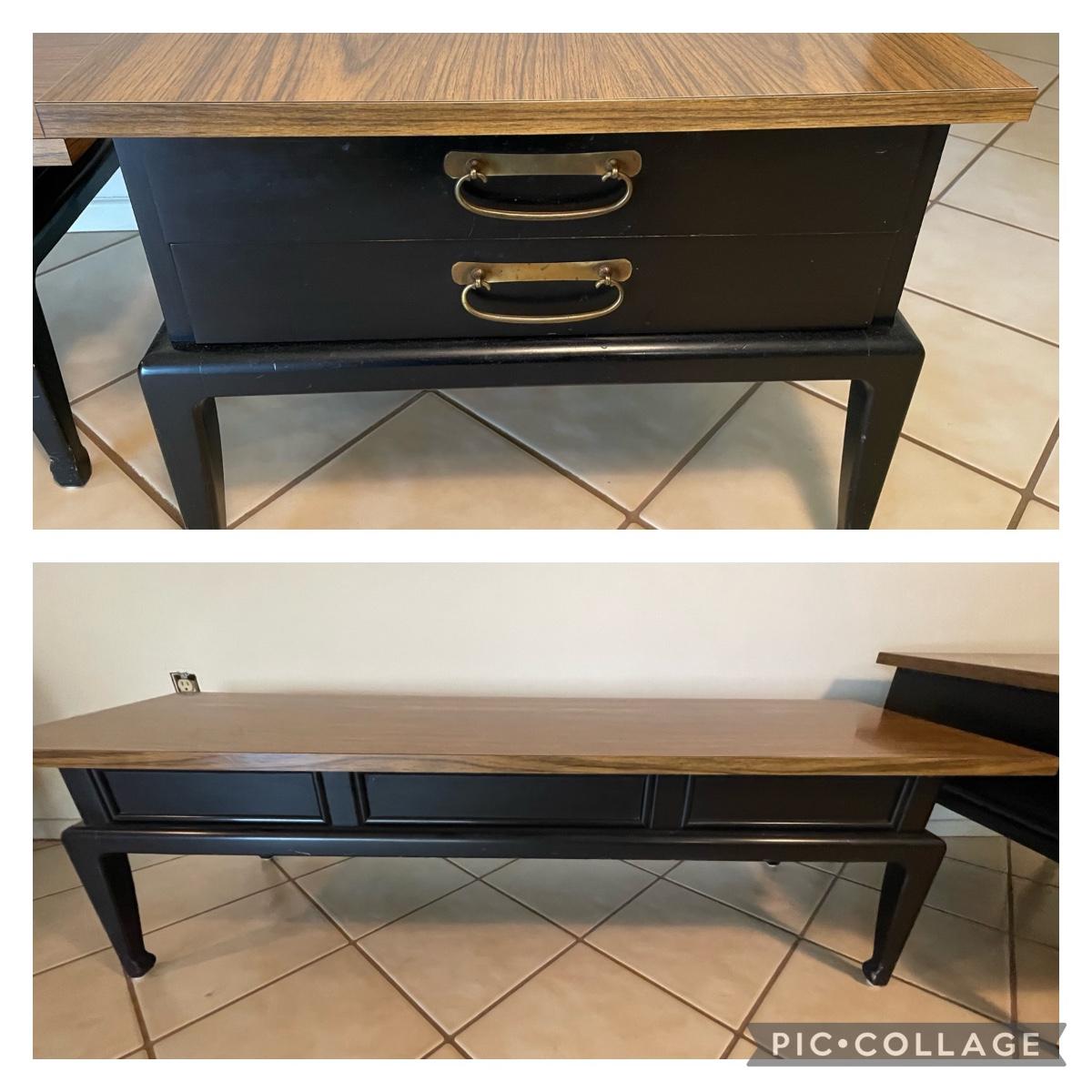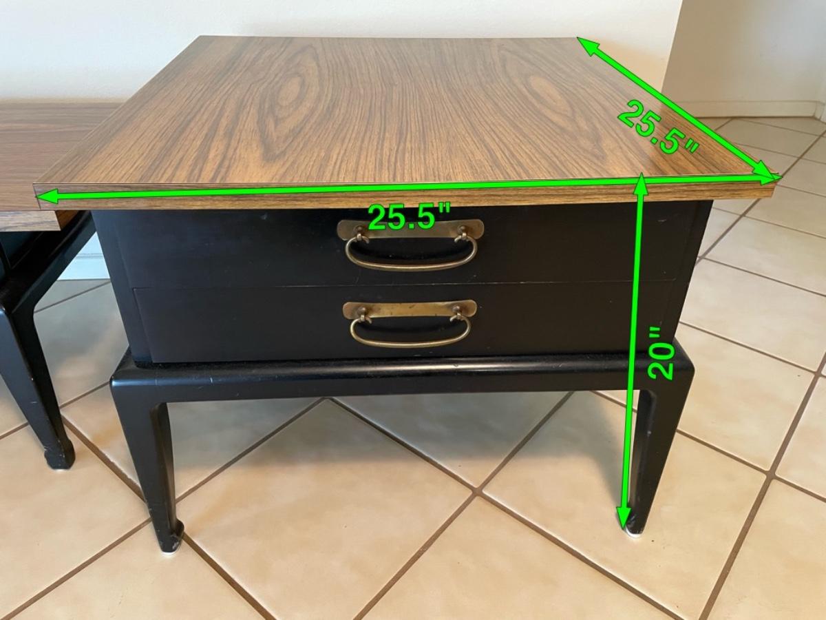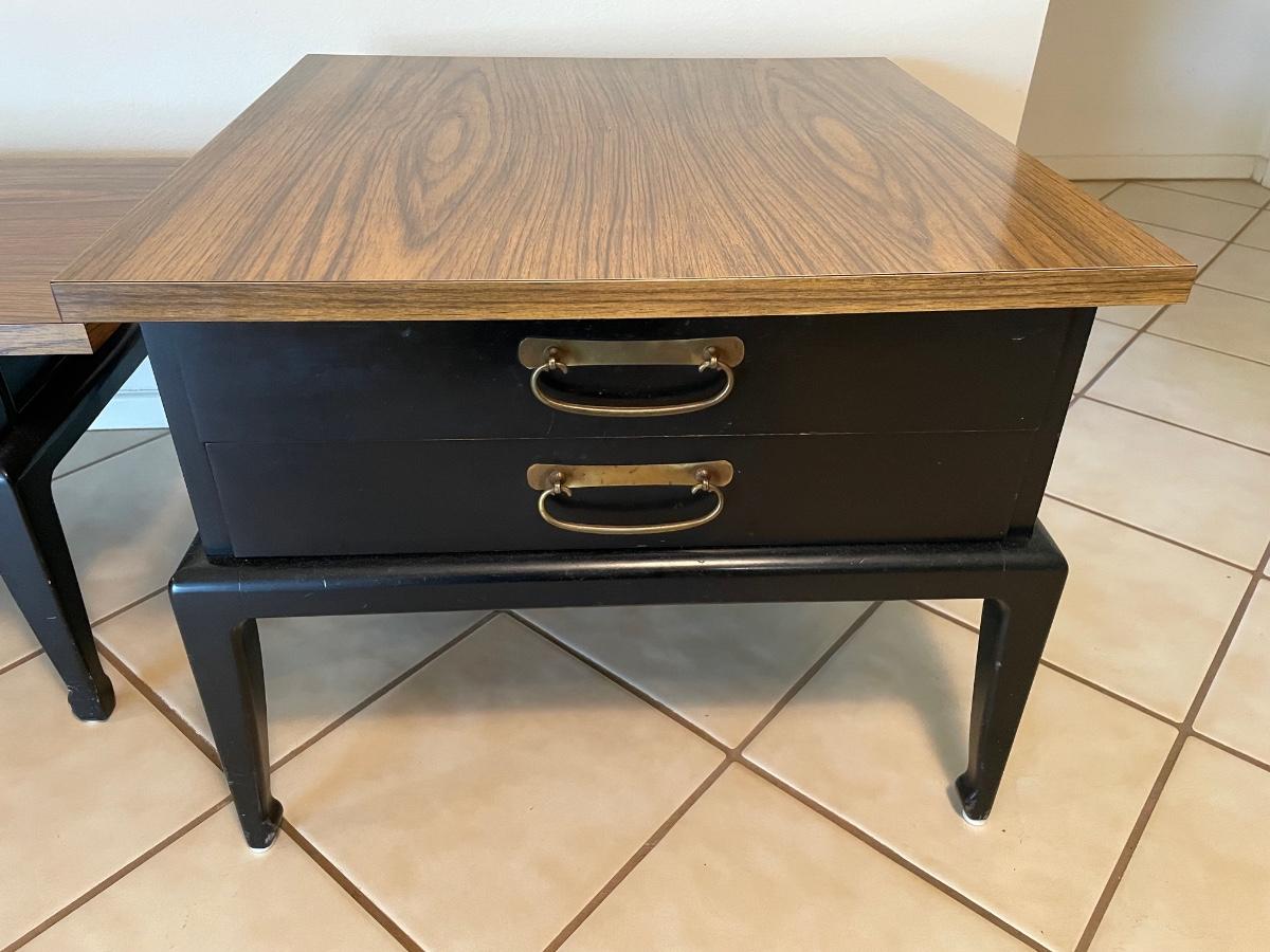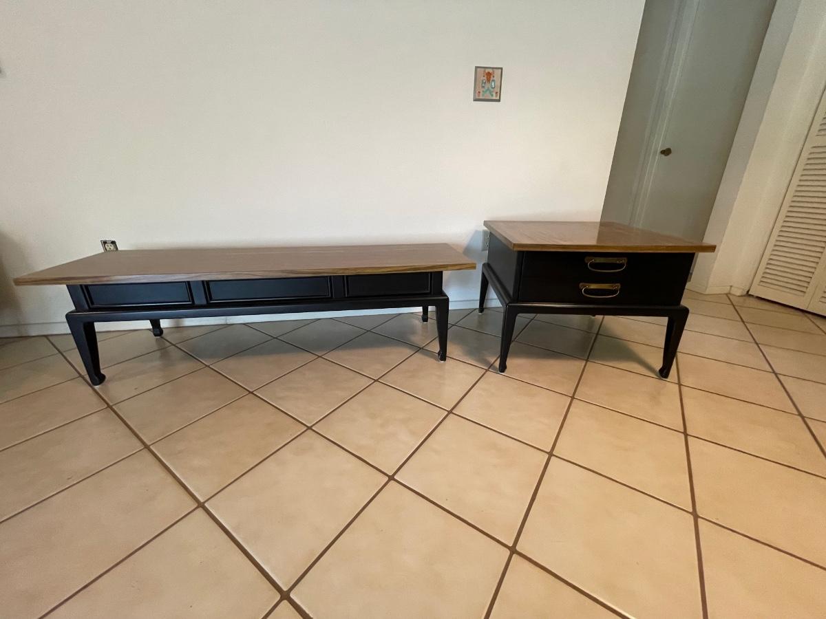 Coffee table and end table. Black painted wood base with woodgrain laminate top. Very good condition. Measurements are in the photos