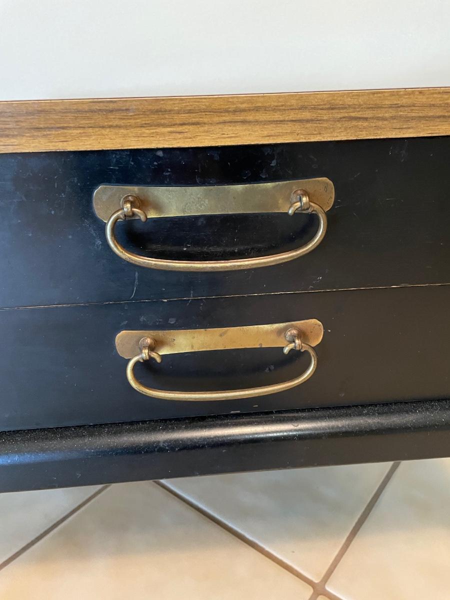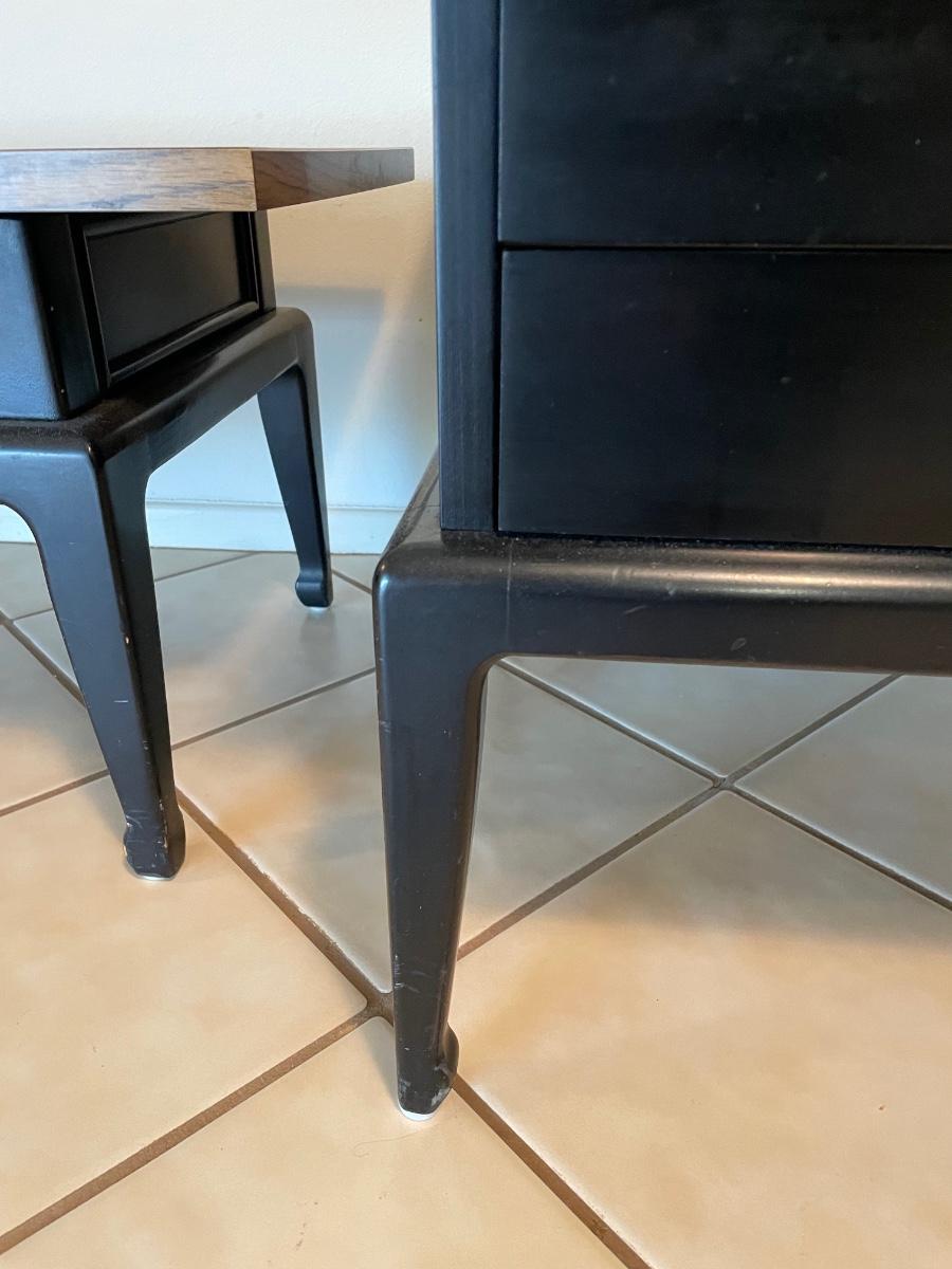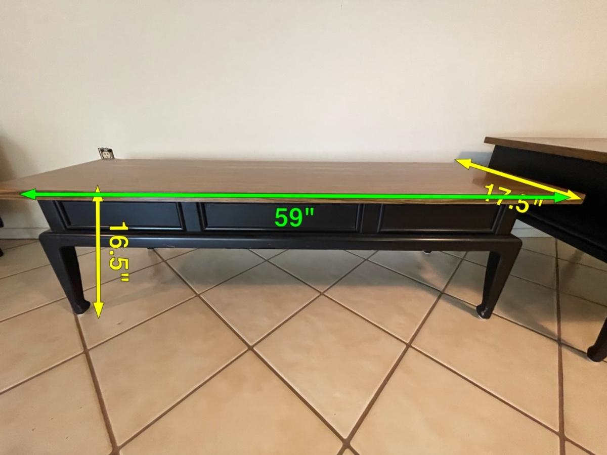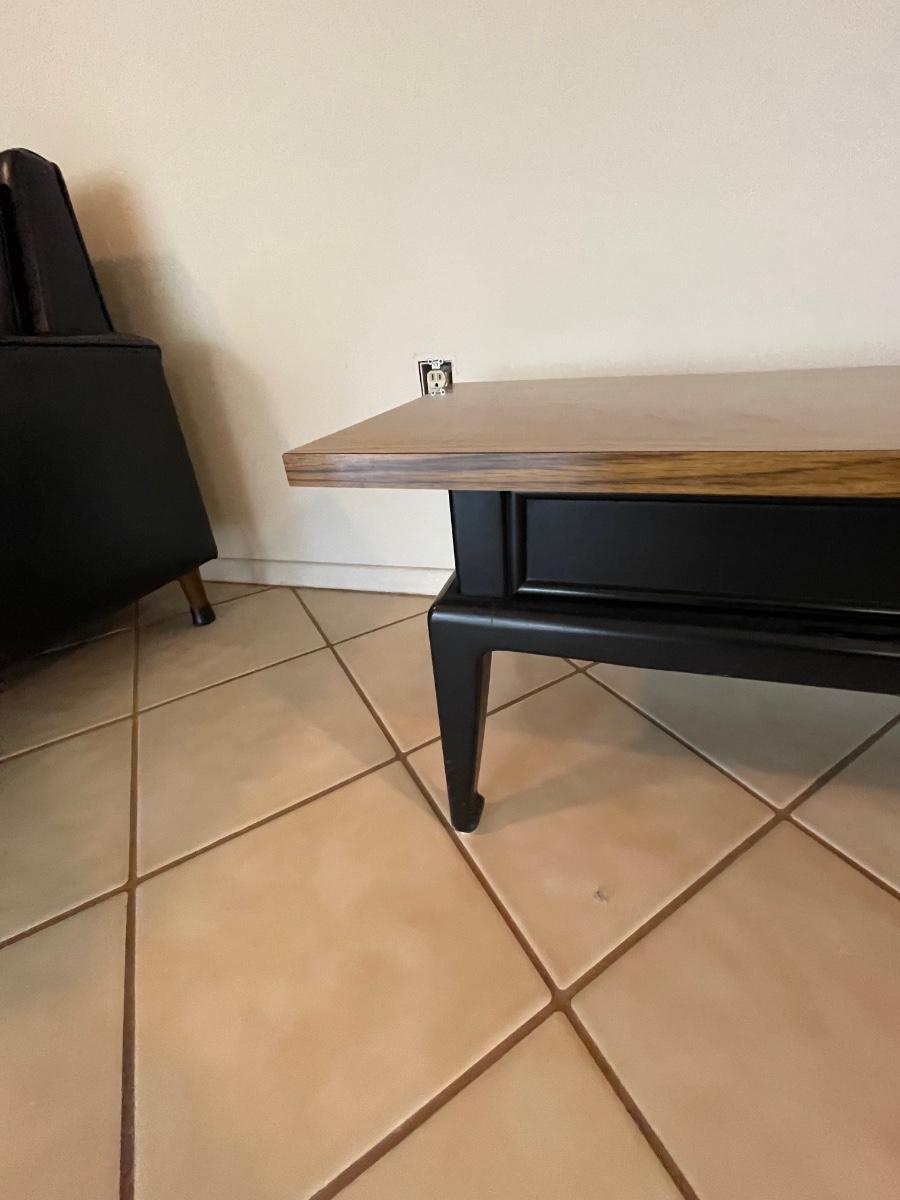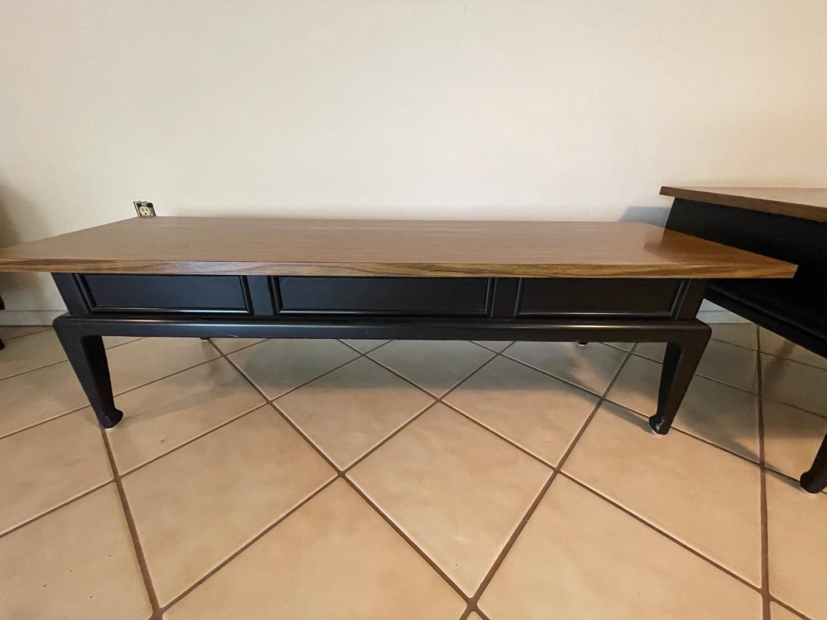 Coffee table and end table. Black painted wood base with woodgrain laminate top. Very good condition. Measurements are in the photos