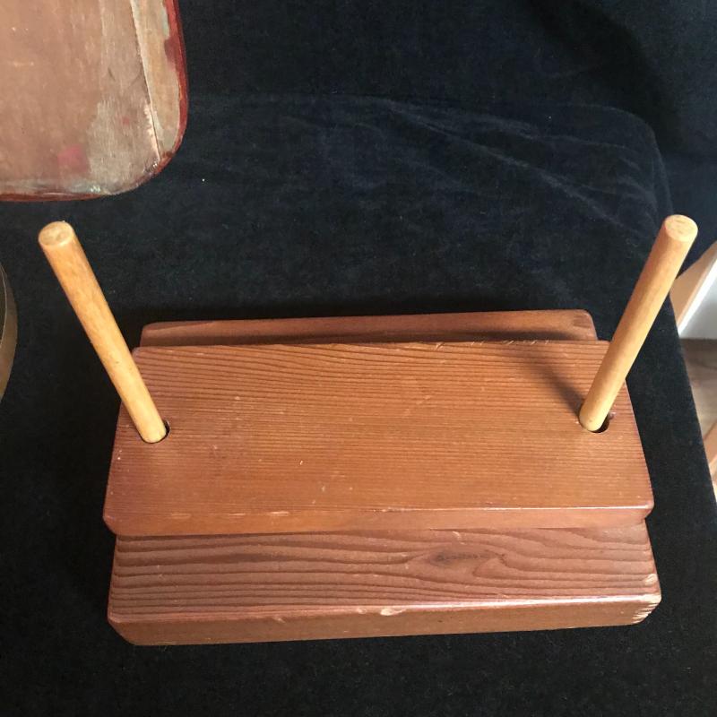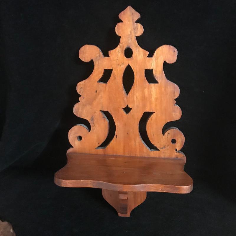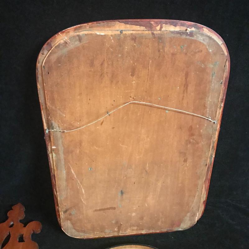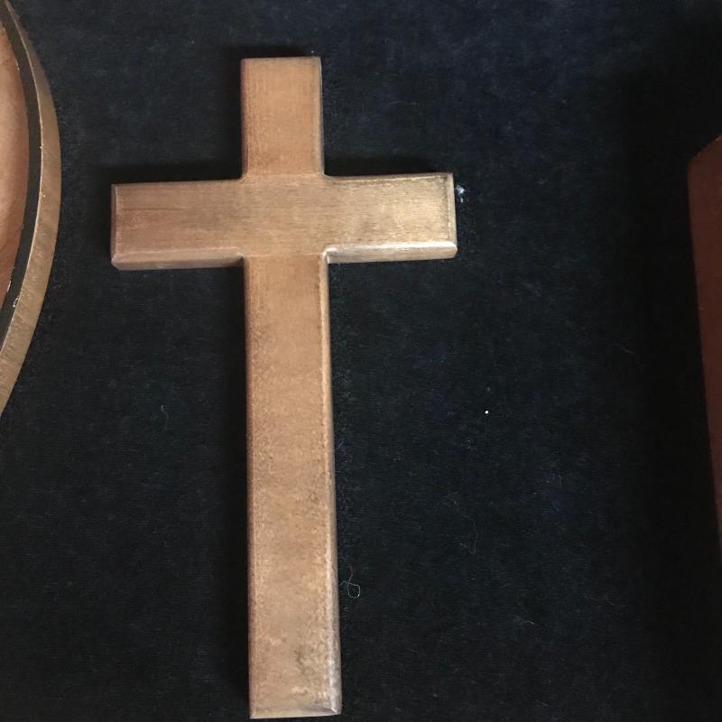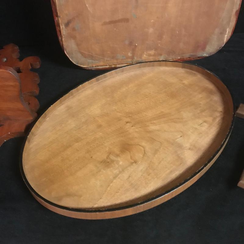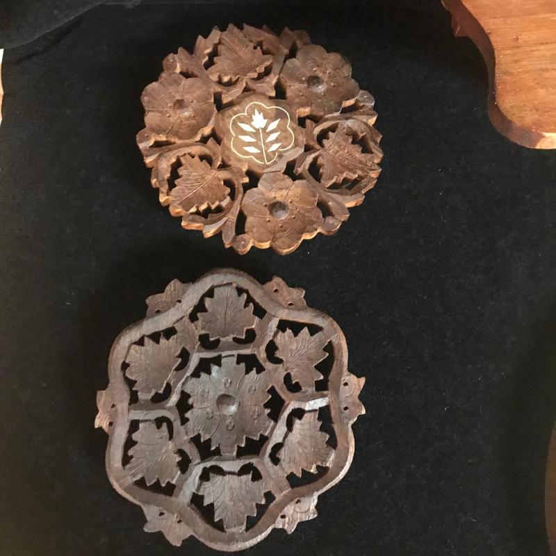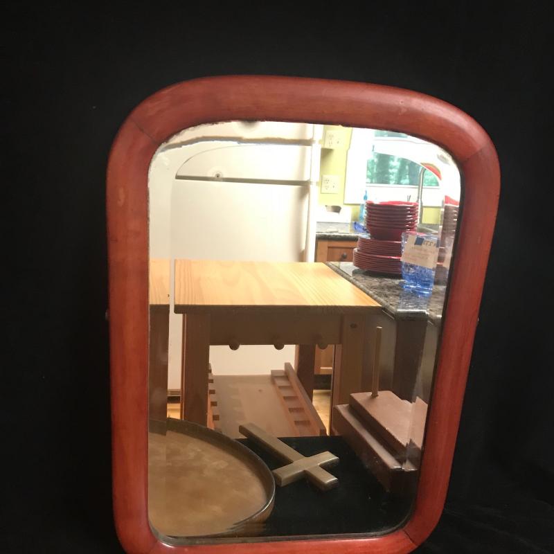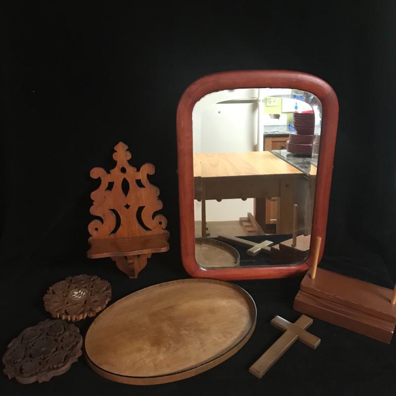 This lot has many items made of wood, including a Napkin holder, two carved trivets, beautiful wood cross, wall shelf, mirror that measures 20” x14” and lucite tray with wood top finish. Local pick up only.