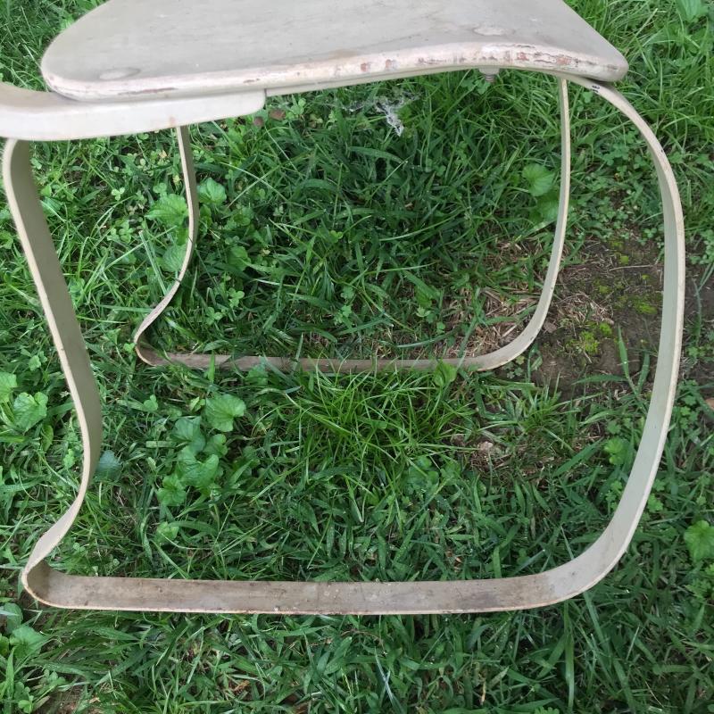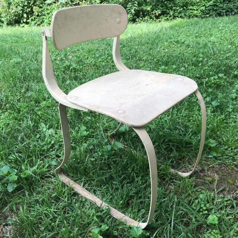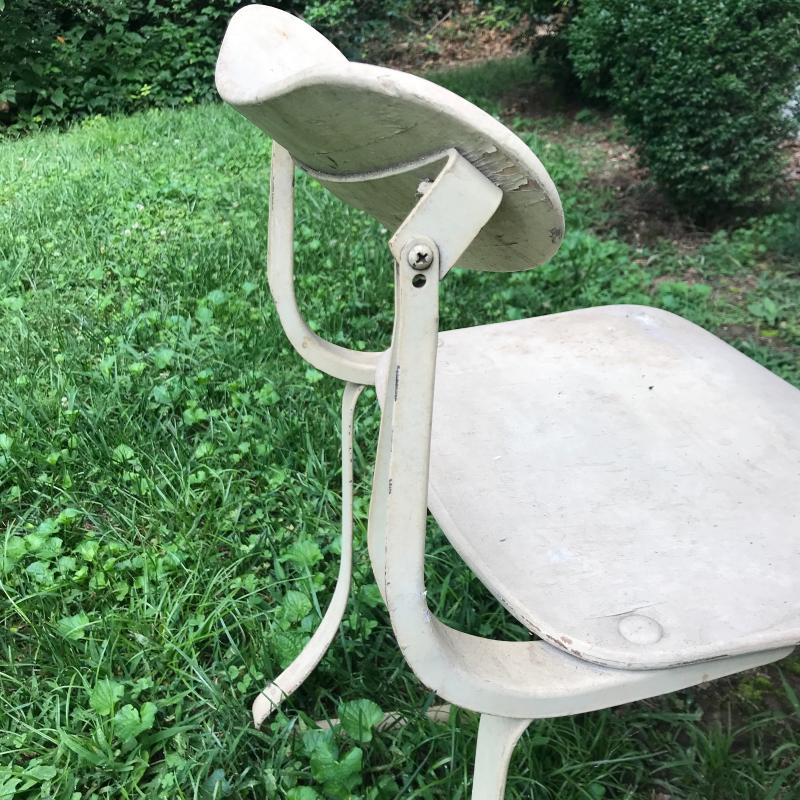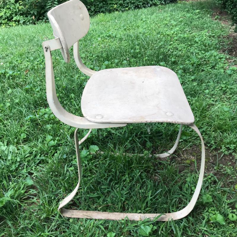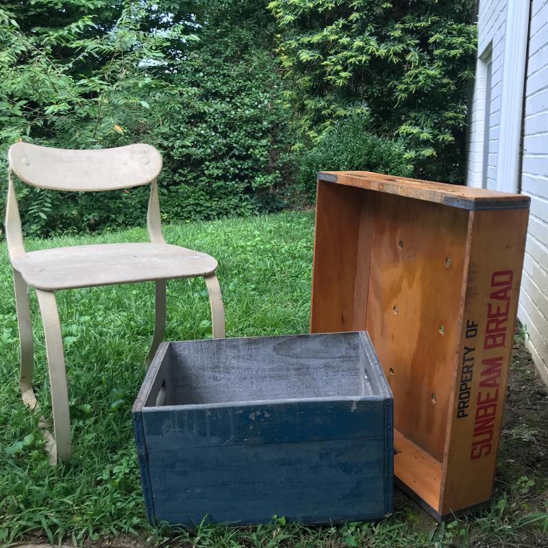 Vintage MCM chair with wooden seat and backrest and metal legs. Nice lines. Backrest is adjustable. Lot also includes two wooden boxes. One is from Sunbeam with metal hinges and measures 25” x 21” x 6”h No shipping