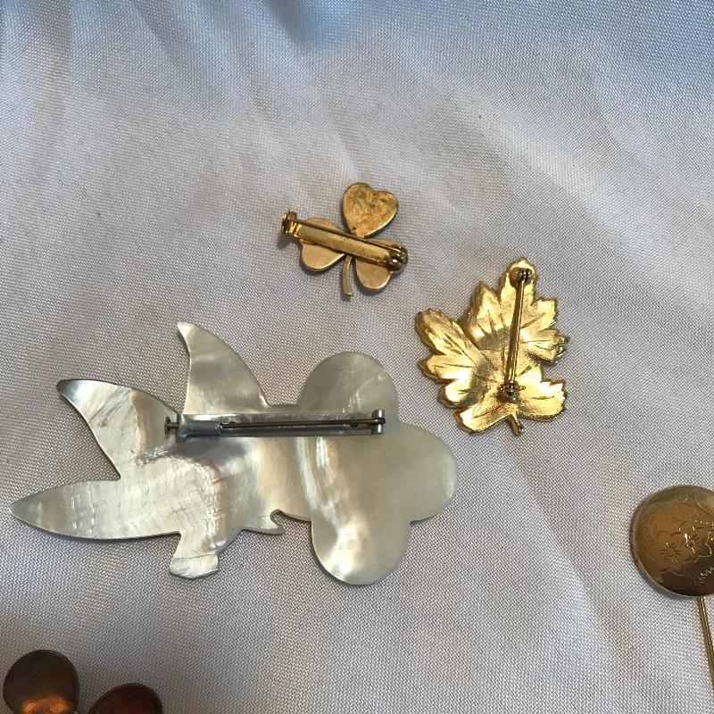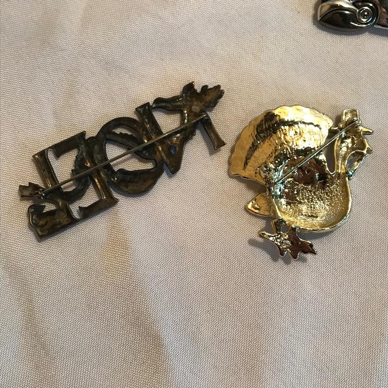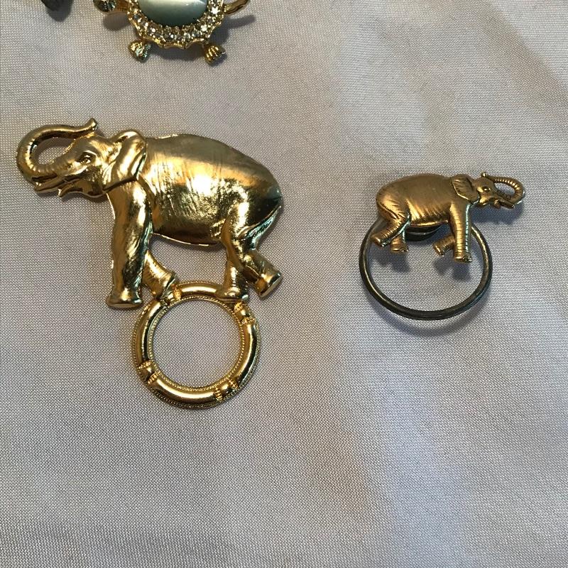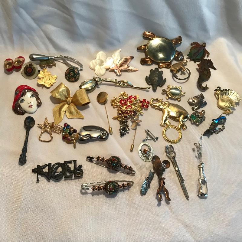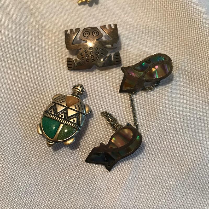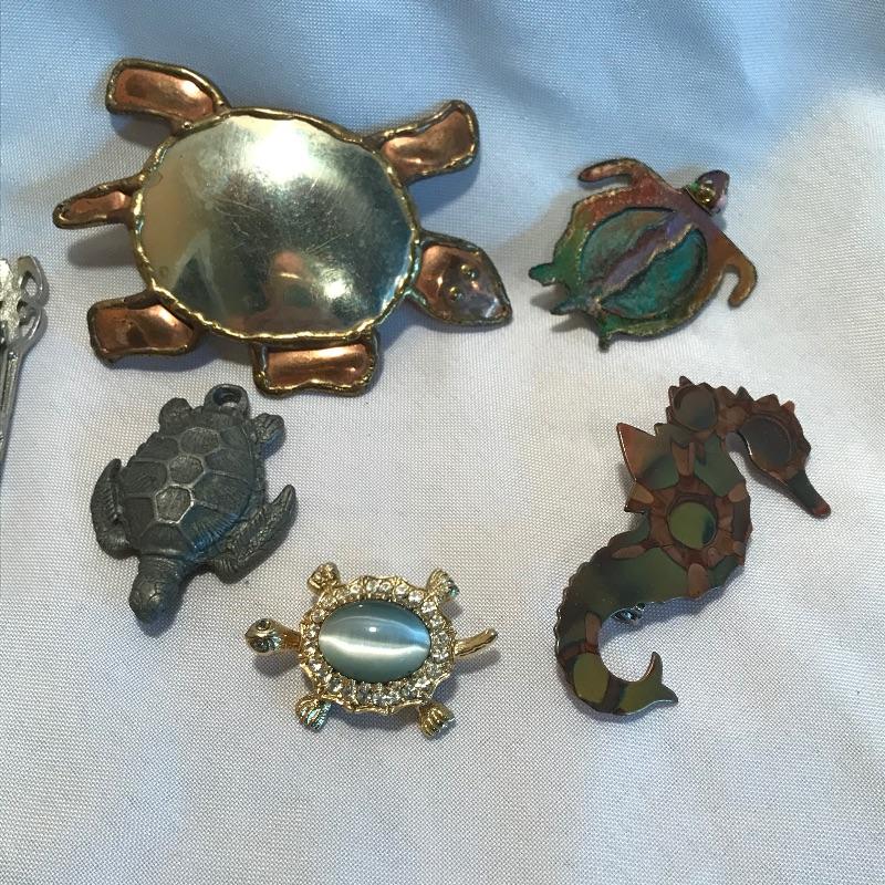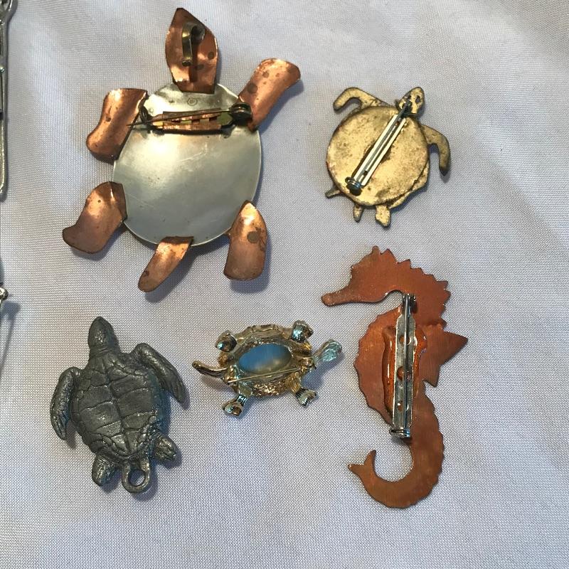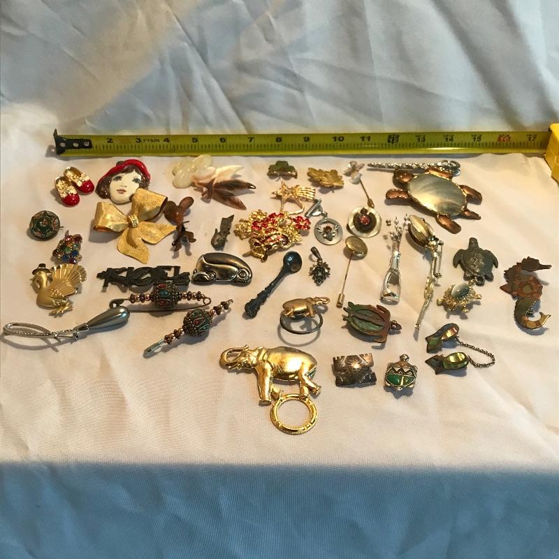 Full list to keep your wardrobe guessing. This collection is full of modern, classic, fun and holiday styles. There are three pieces that have sterling or 925 markings, a frog and turtle with stones and the clips with abalone style shell accents. All white gems were tested and did not register as diamonds or moissanite. There is a lot of personality here with plenty of turtles and elephants, materials range from metal, shell and even resin. See photos. Shipping available.