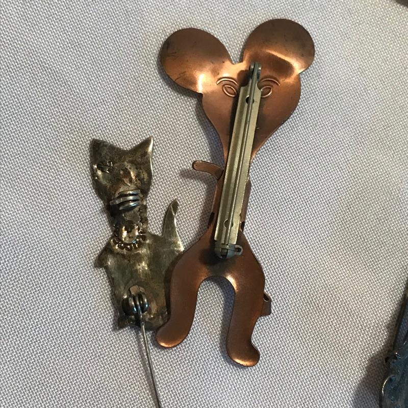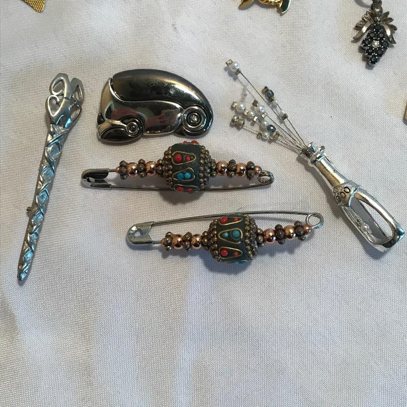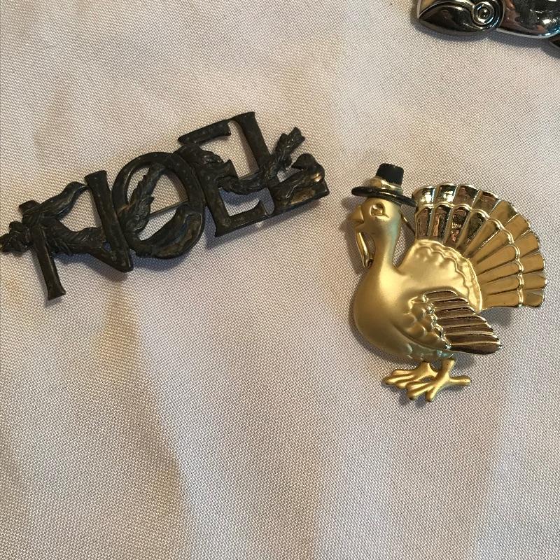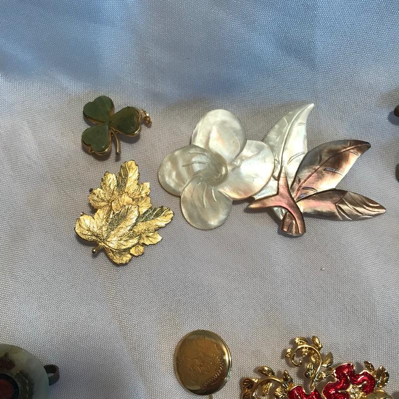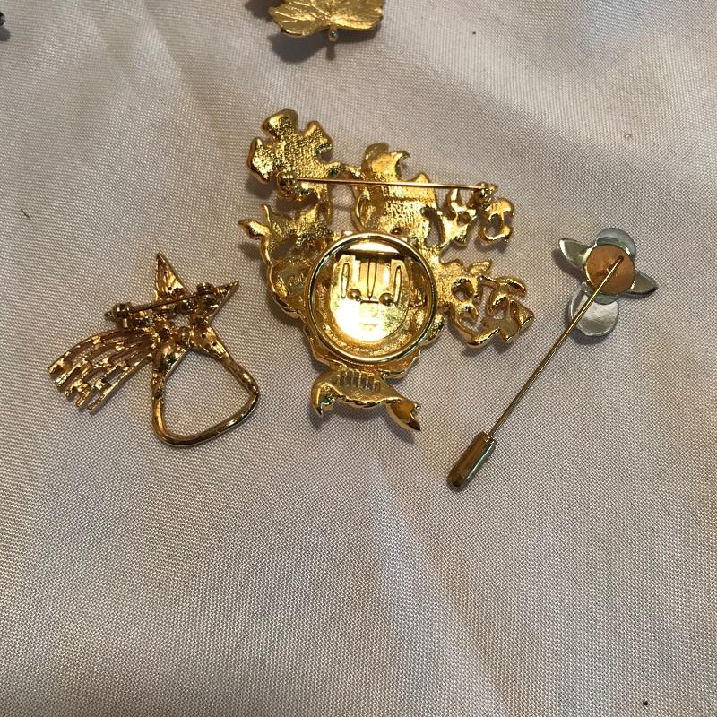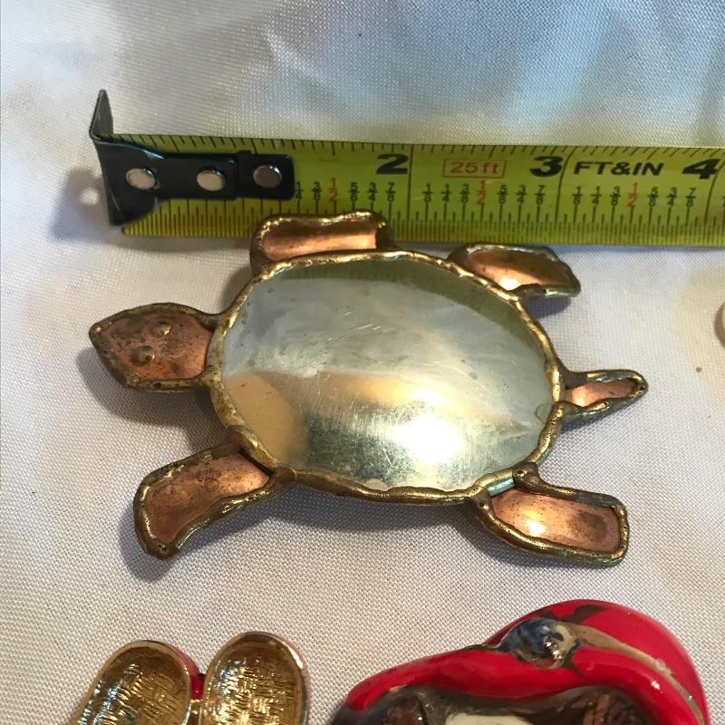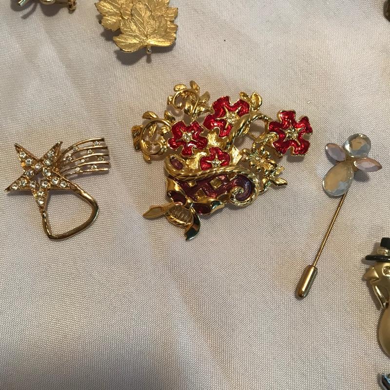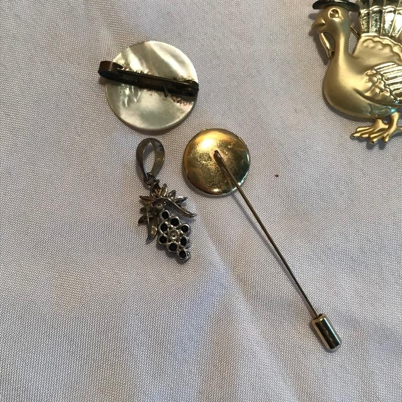 Full list to keep your wardrobe guessing. This collection is full of modern, classic, fun and holiday styles. There are three pieces that have sterling or 925 markings, a frog and turtle with stones and the clips with abalone style shell accents. All white gems were tested and did not register as diamonds or moissanite. There is a lot of personality here with plenty of turtles and elephants, materials range from metal, shell and even resin. See photos. Shipping available.