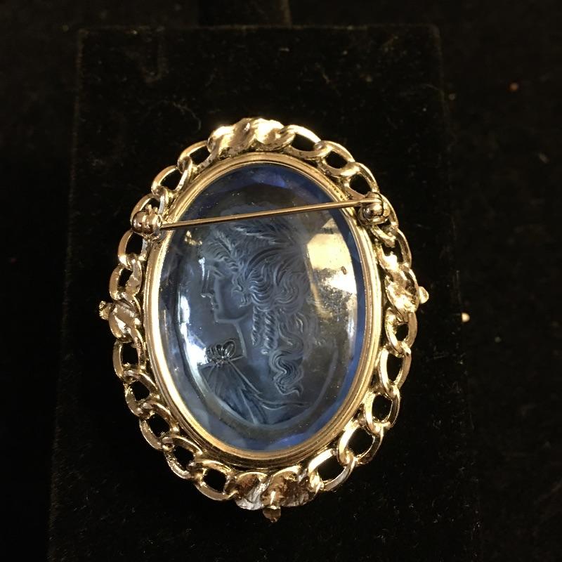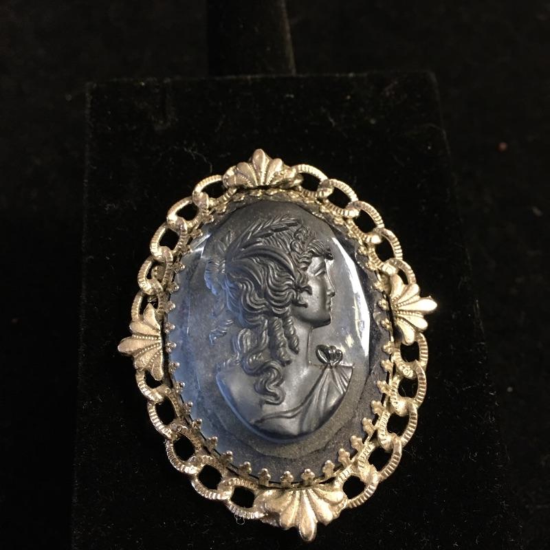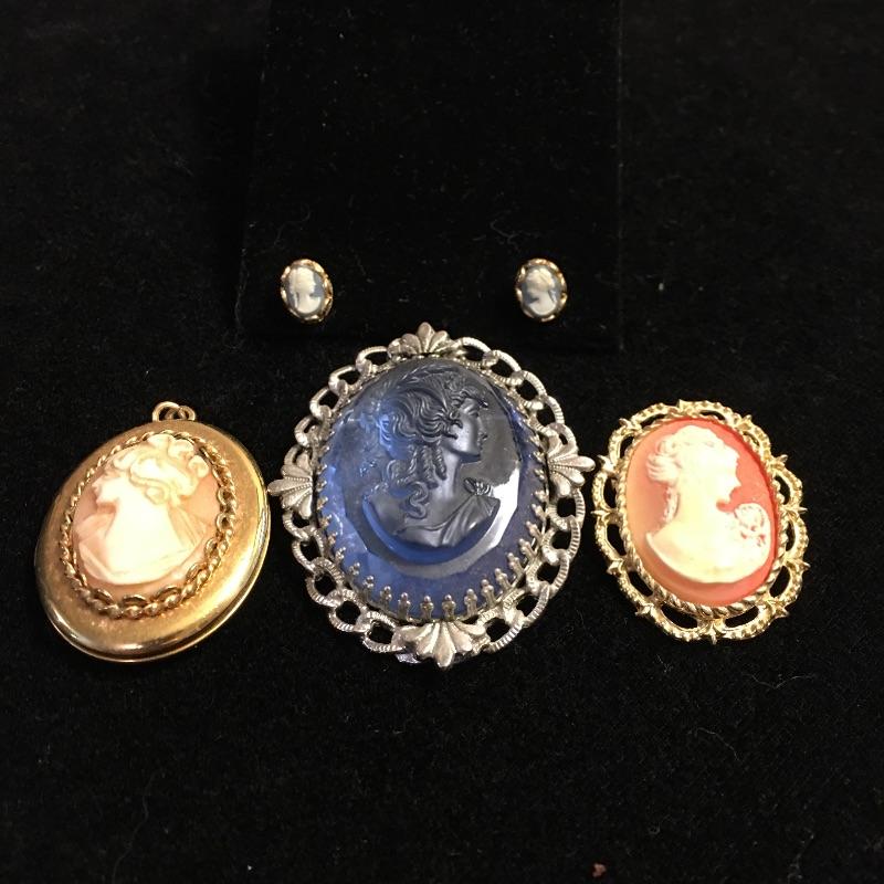 Cameo collection includes pair of earrings, pin, pendant and picture pendant. Go for the old school look with this collection of Cameos. Largest cameo measures 1.5” x 2” x .5”.