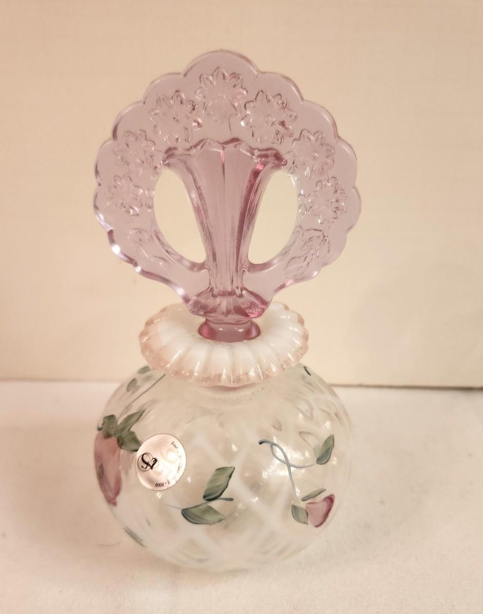 95th Anniversary piece - Fenton Art Glass perfume bottle - Empress Rose on Trellis" pattern - 6" tall, has label.