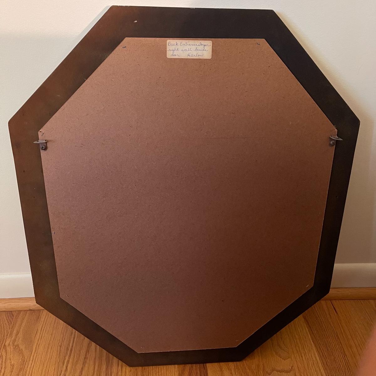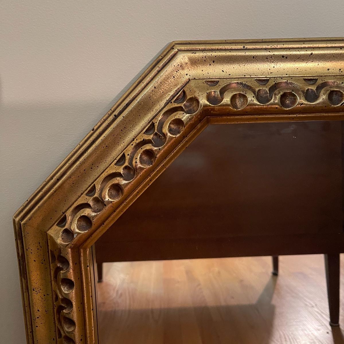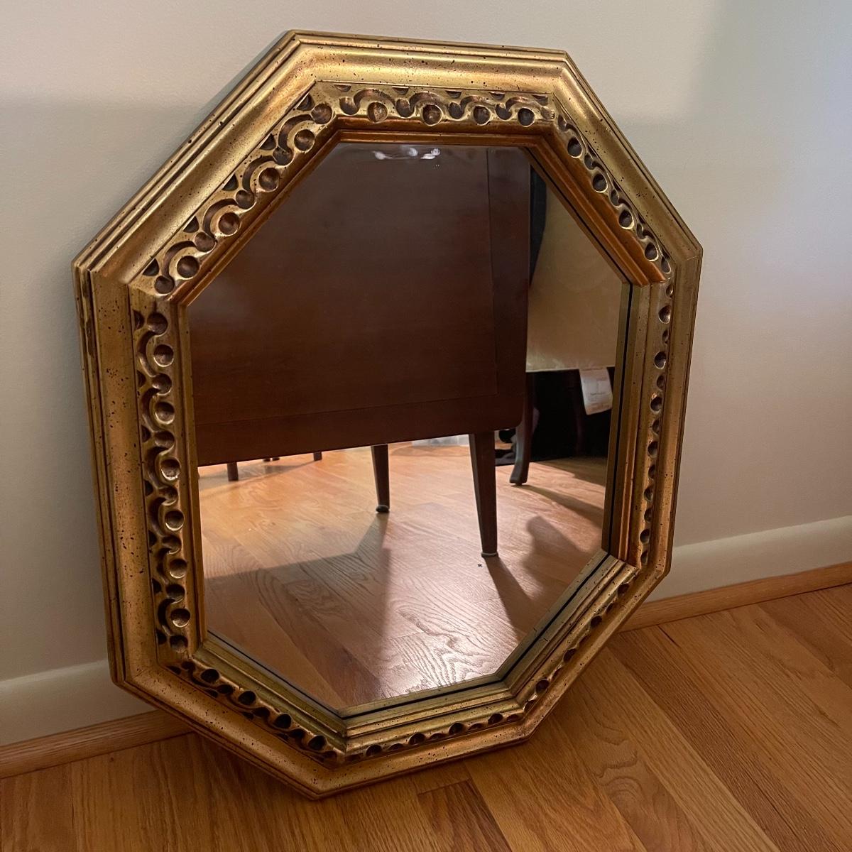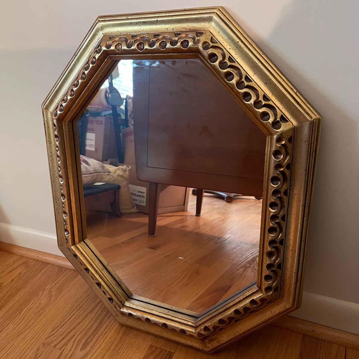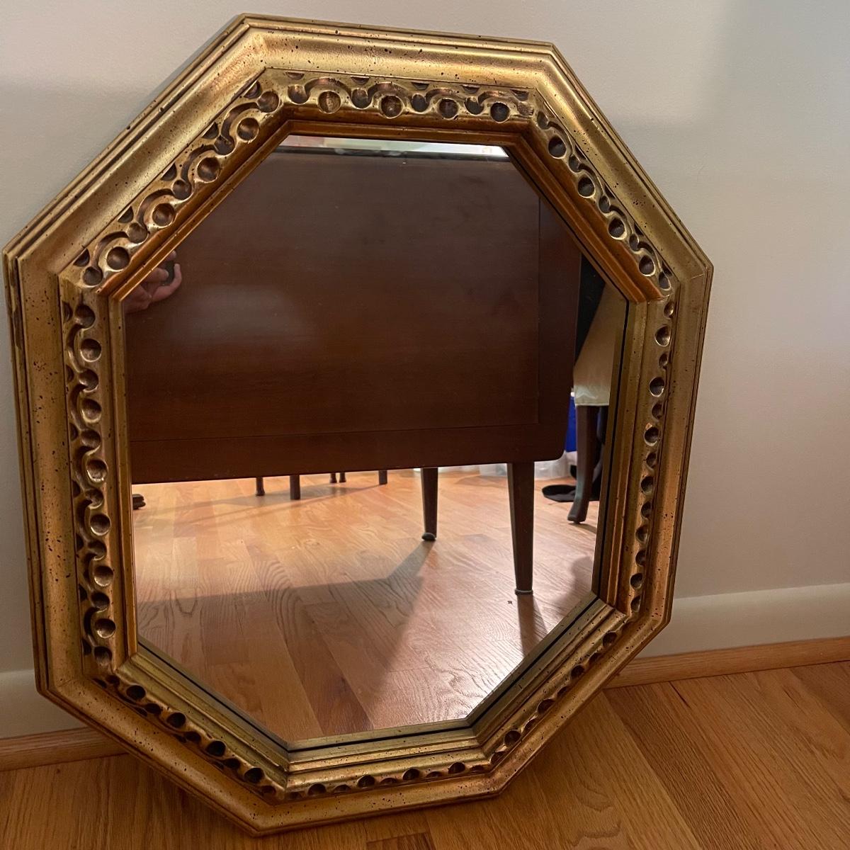 Adorn your home with these gold colored accent pieces. The first of this lot is a gold colored octagon shaped mirror that measures 26” X 21”. It features decorative framing and is in great condition. Next in this lot is a pair of gold garbage cans each measuring 9” tall. These two show a little age and have some rust in the bottom, but still shine and are useful. See pics for details.