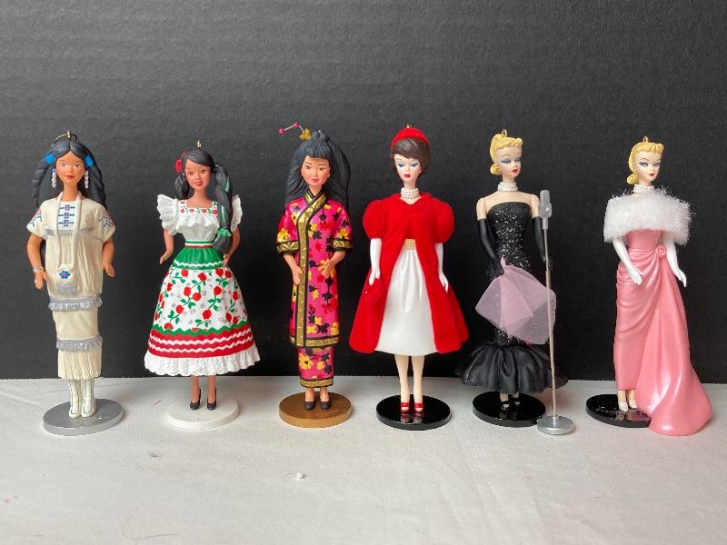 Collector’s Series.Three Barbie Dolls of The World ornaments “Native American Barbie”, “Mexican Barbie” and “Chinese Barbie”. “Silken Flame Barbie”, “Solo In The Spotlight Barbie” and “Featuring The Enchanted Evening Barbie”