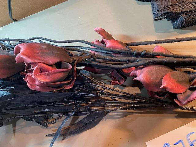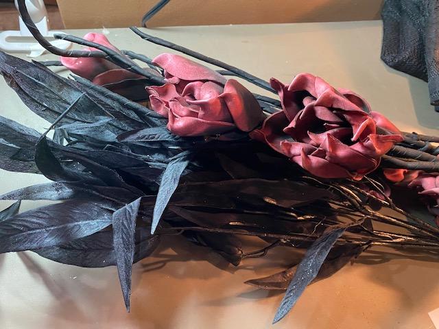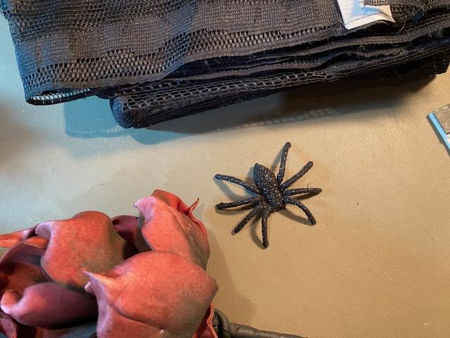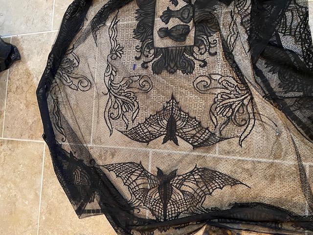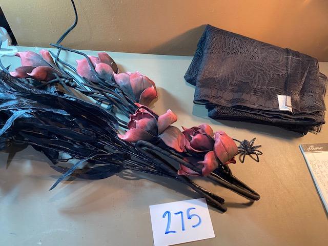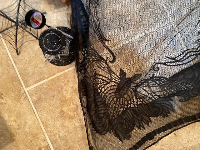5' x 7' black lacy tablecloth, creepy flowers and glitter spider