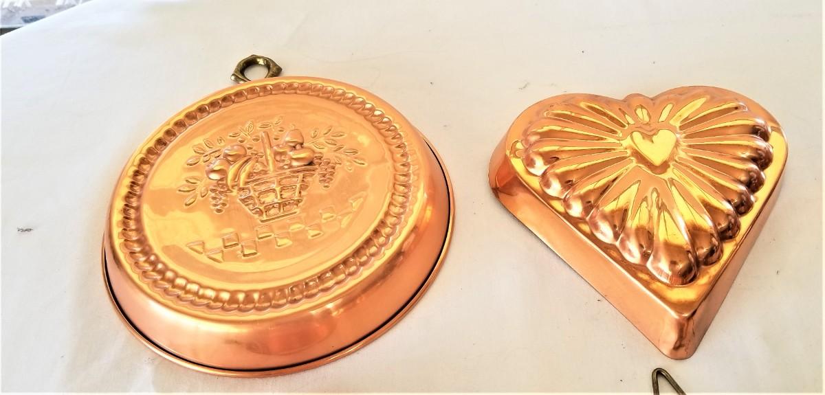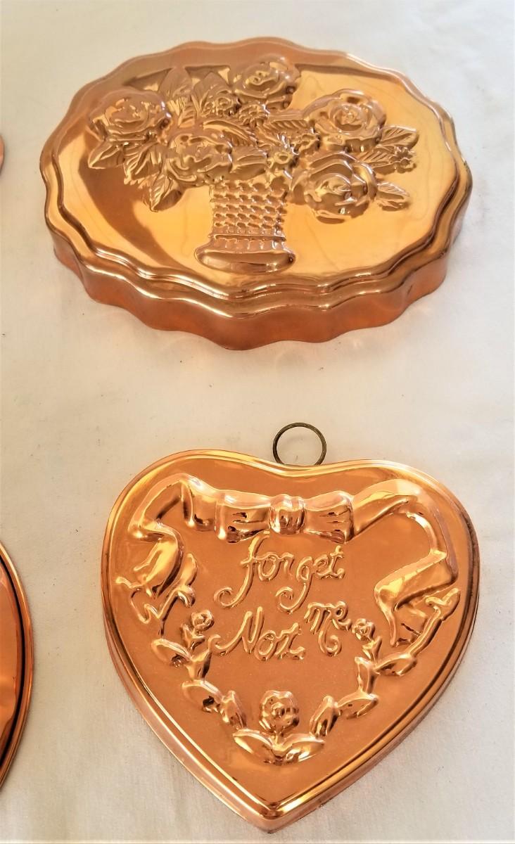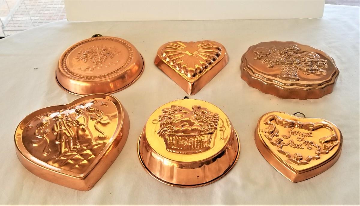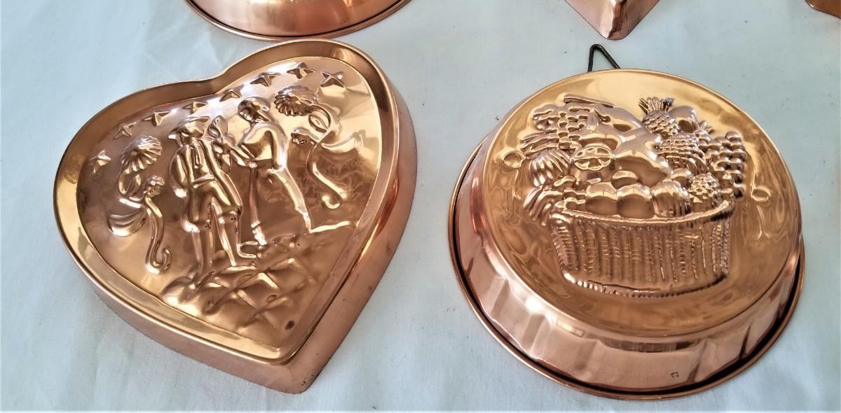 You get all you see here - six contemporary, decorative copper kitchen molds. All in good condition. Three have a heart motif. They average about 10" across.