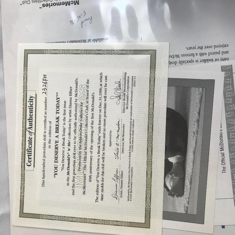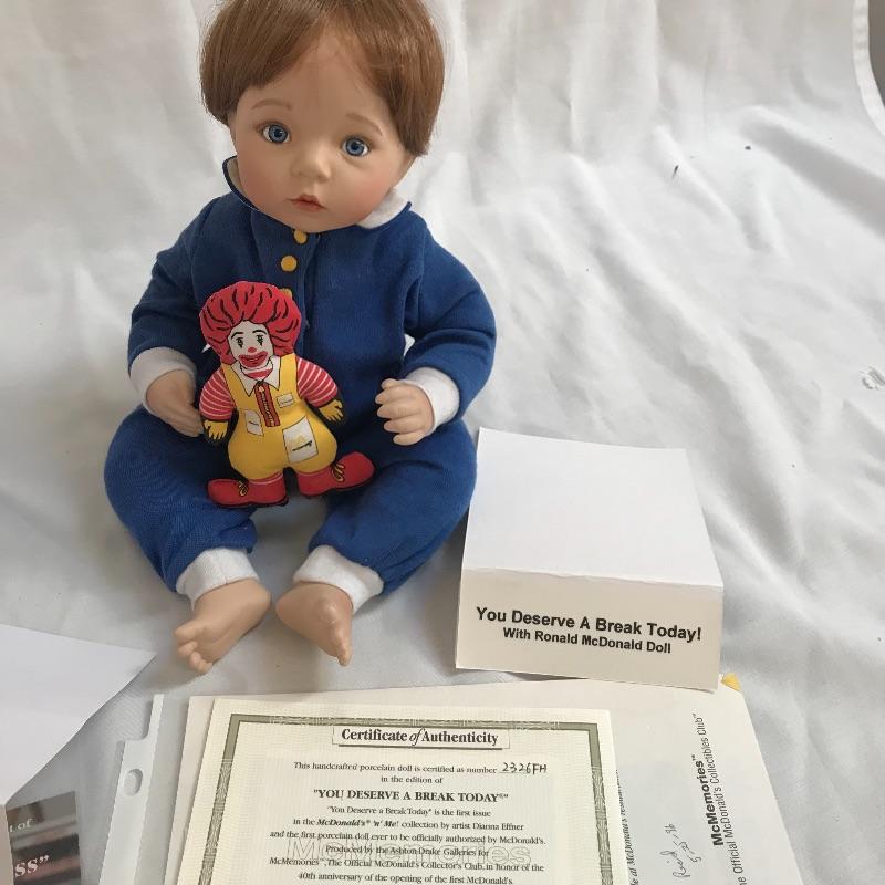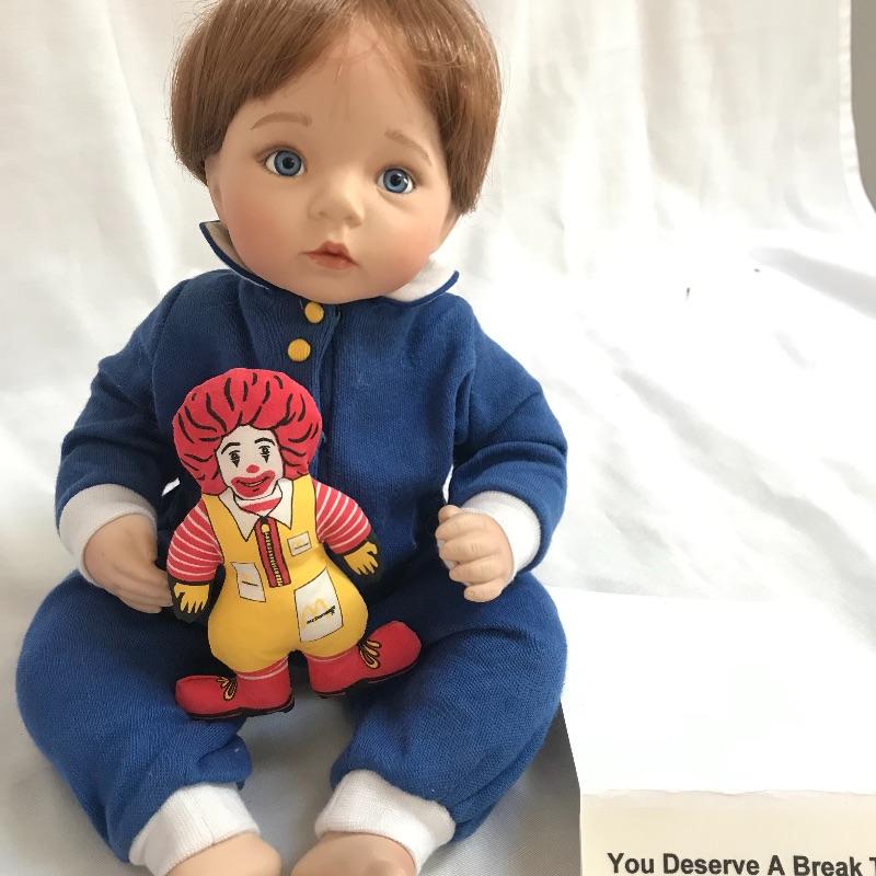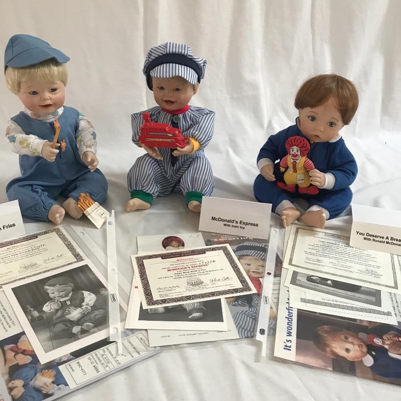 Three mc Memories dolls all with COAs created by Yolanda Bello. These are soft and porcelain faced limbs. Eric’s first French fries, You Deserve a break today with Ronald and Mc Donald’s Express with Train. Shipping available.