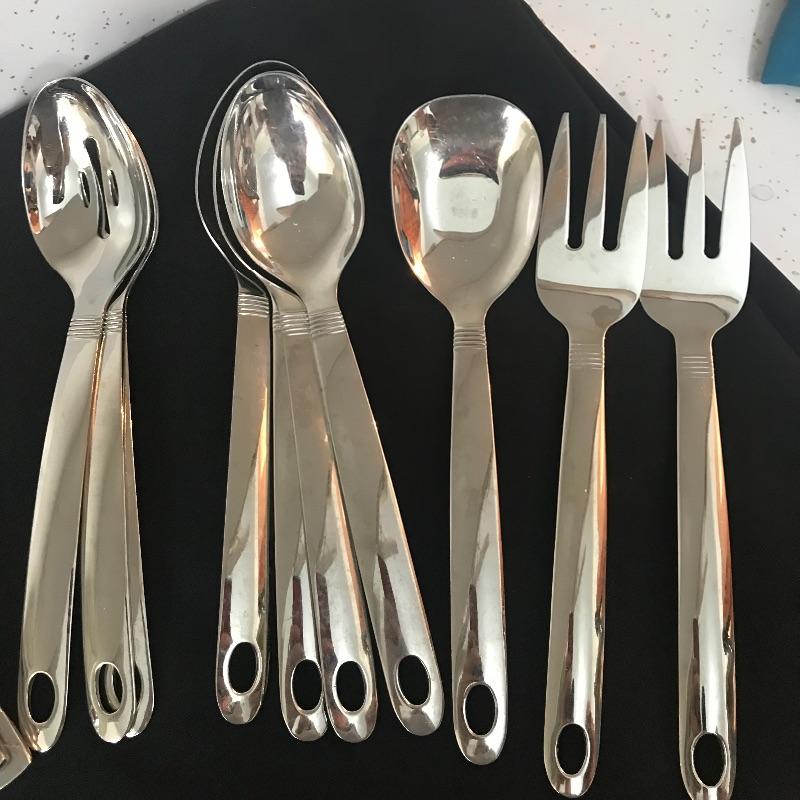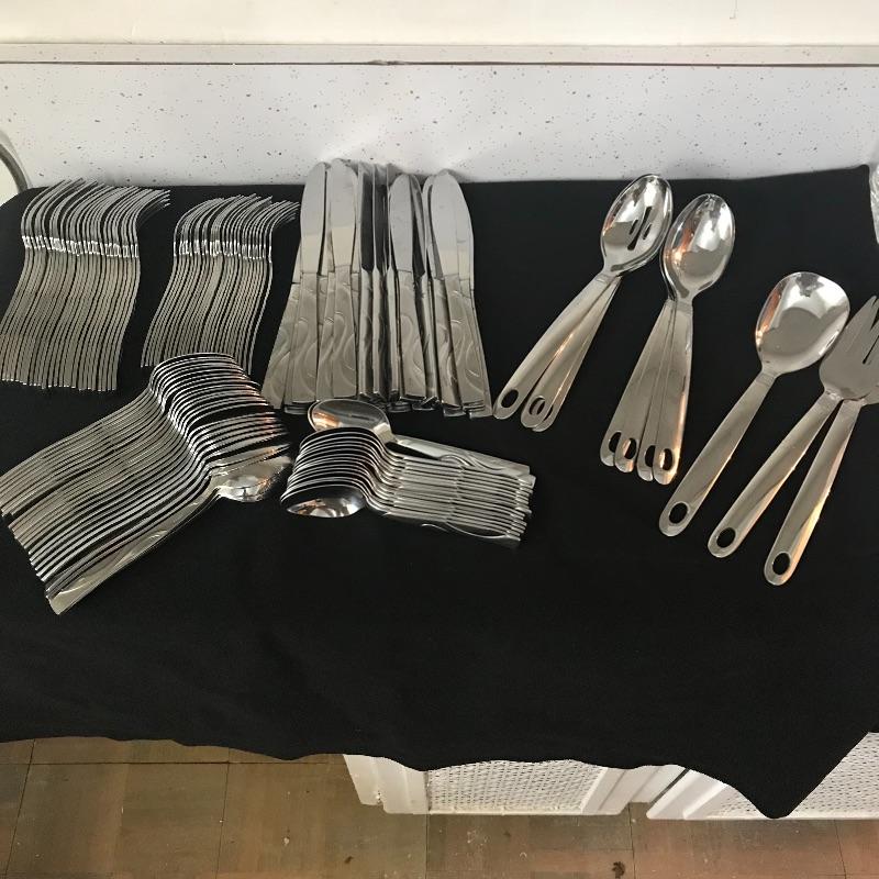 Five piece 17 place setting in complete sets with up to 10 more of everything but the small spoons as well as ten serving pieces that are not the same pattern but also by Oneida. Local pick up only.