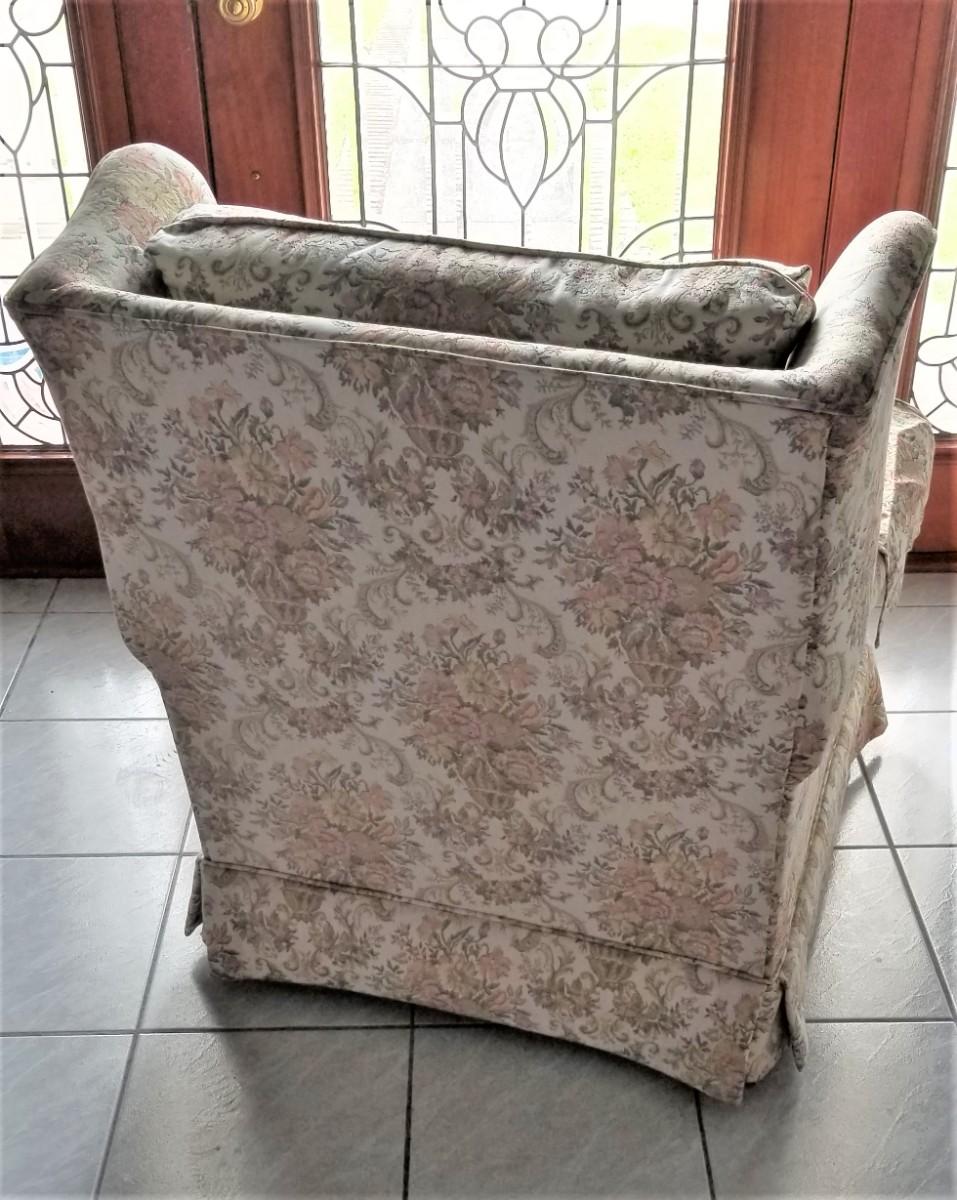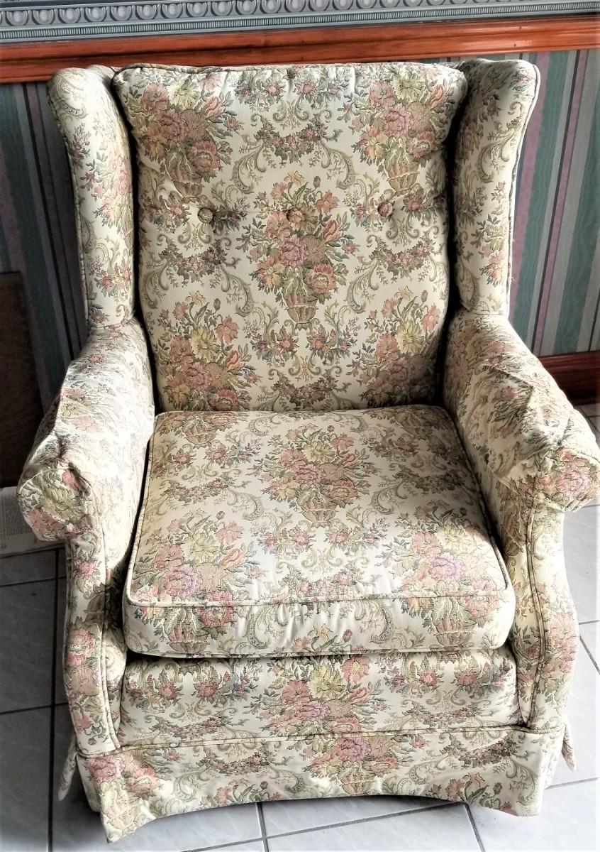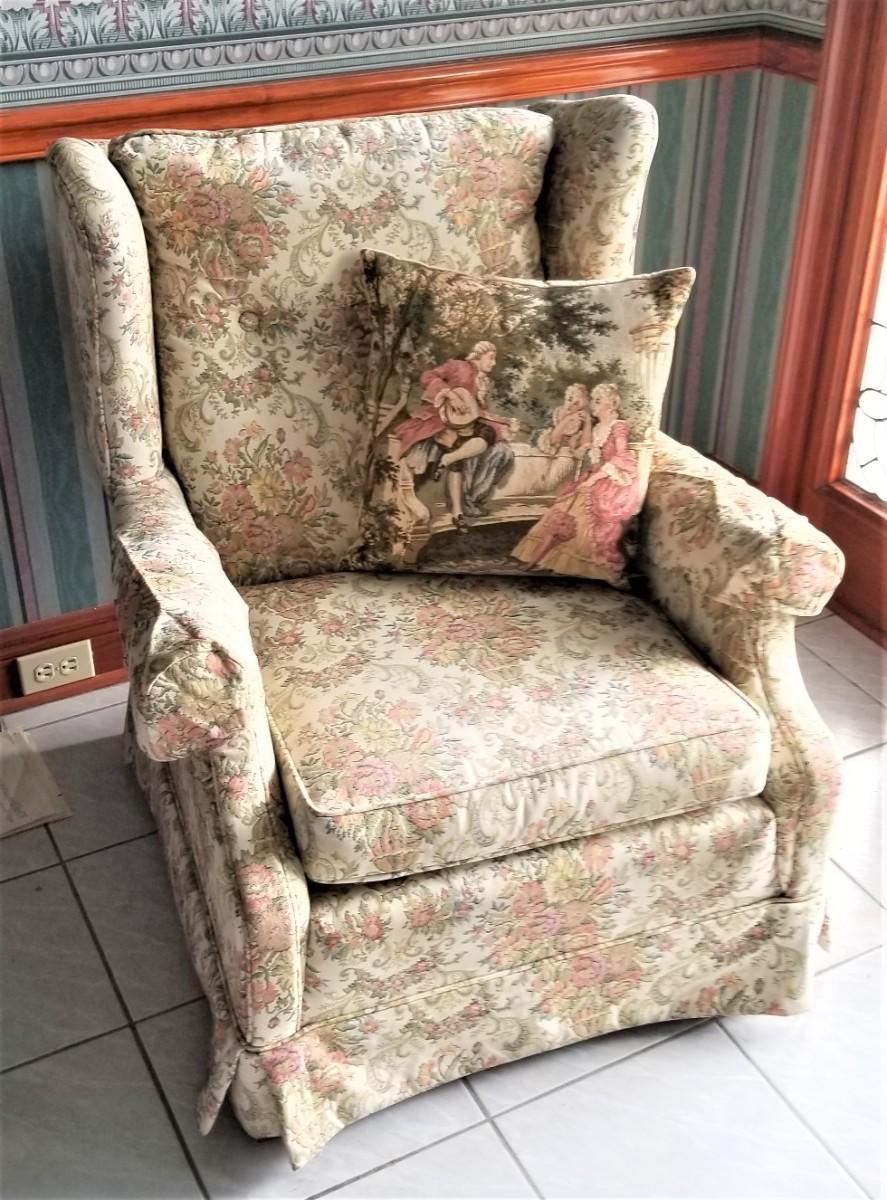 No maker's name - vintage wing-backed chair in good vintage condition. Finished all the way around - a sign of qua.ity. Comes with the pillow. 27" wide, 34" tall, 29.5" deep