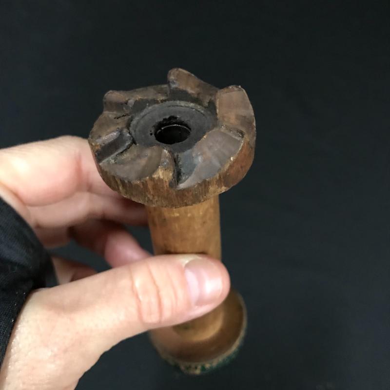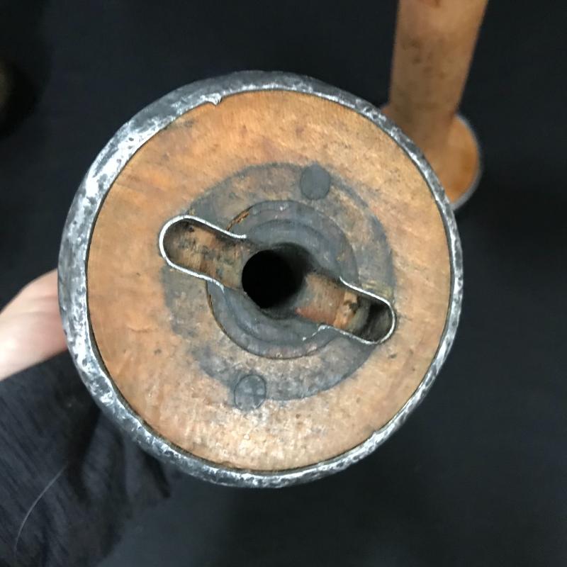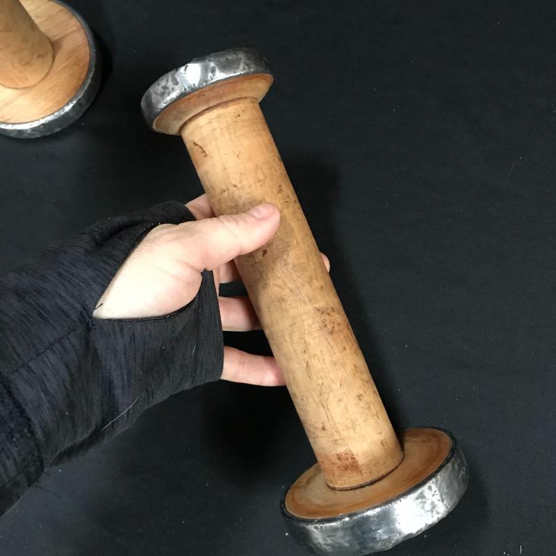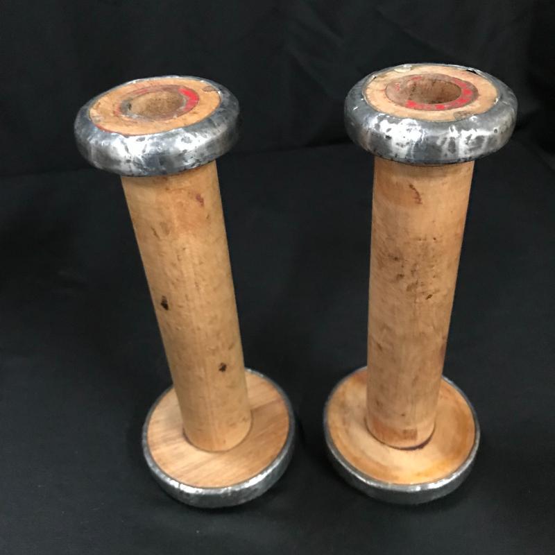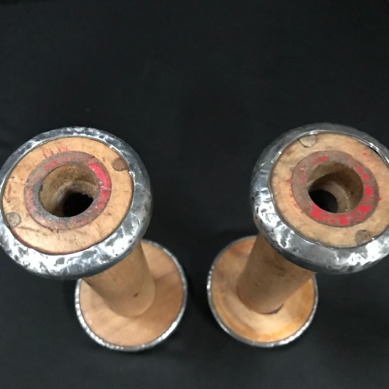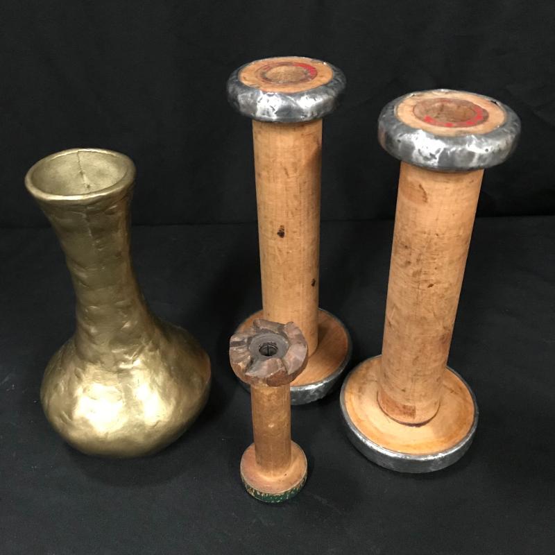Three wooden spool candle holders (approx. 8.5” tall) and one brass vase, which is very heavy and appears to be handmade. Shipping available or local pickup in Asheville, NC.