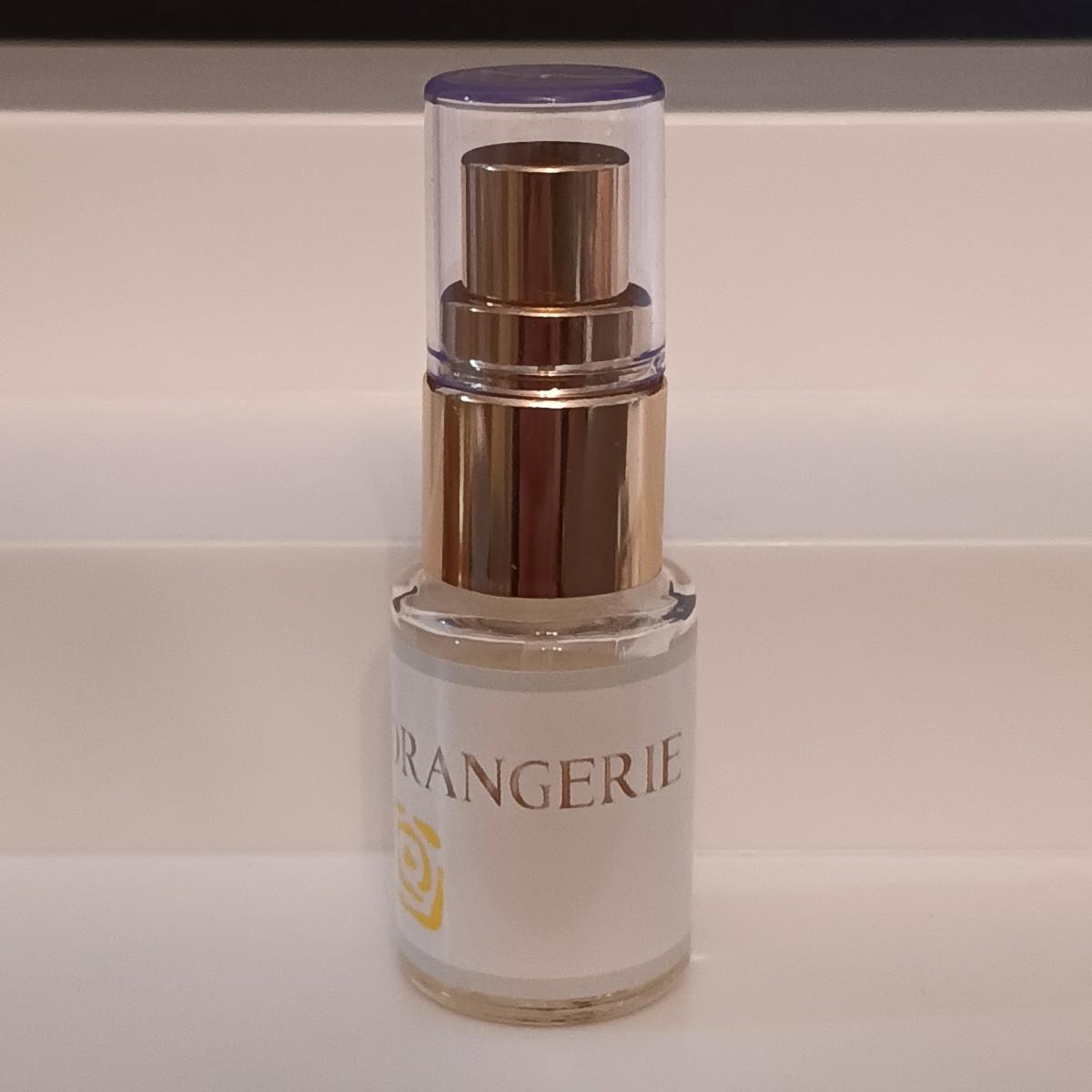 The O De L'Orangerie is about 80% full. There are no marks on the bottom of the glass and the label is a simple sticker. It is uncertain if this is a discontinued bottle or off-brand.