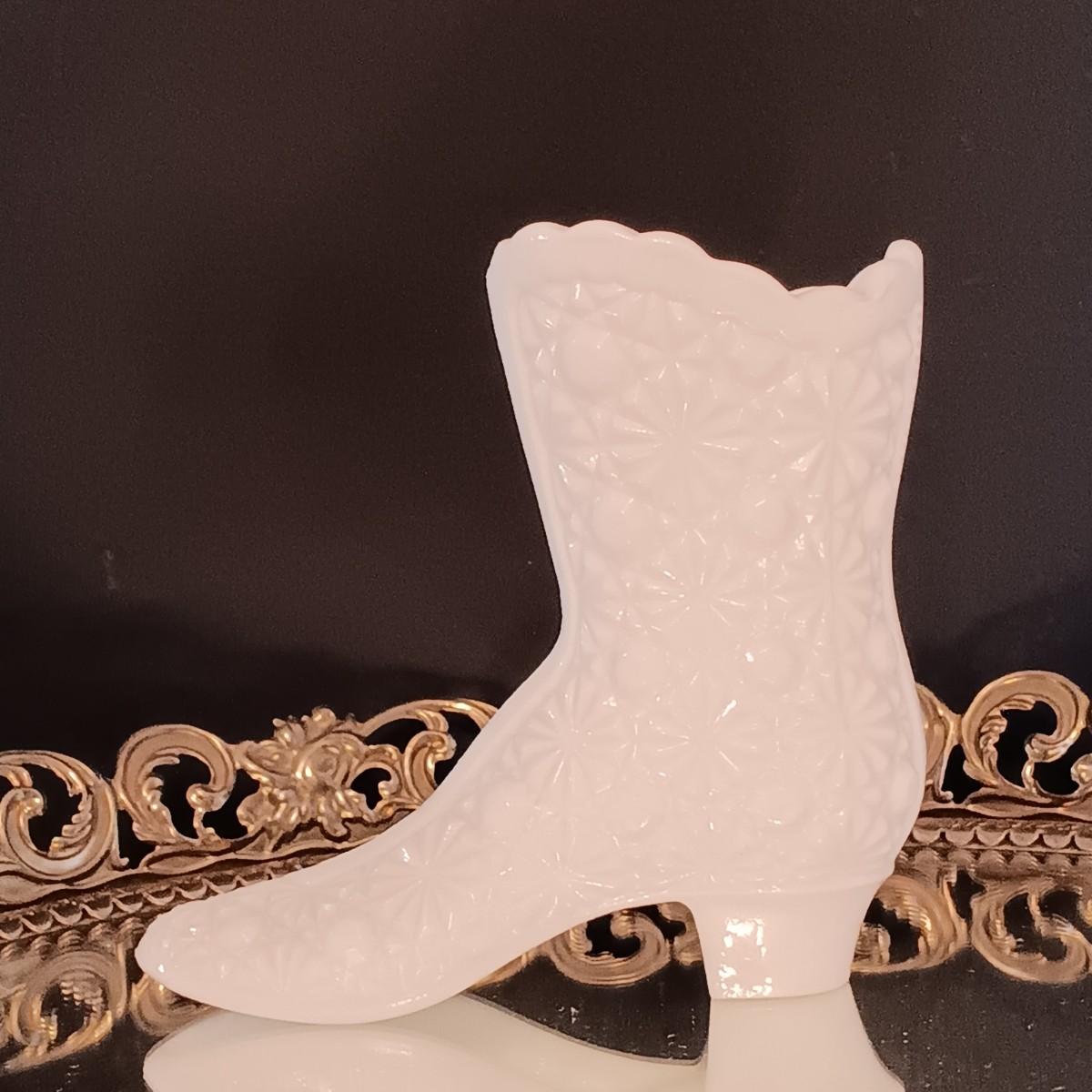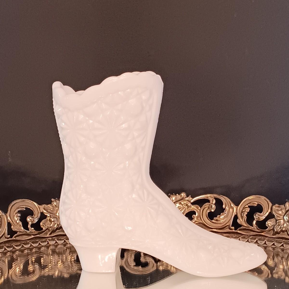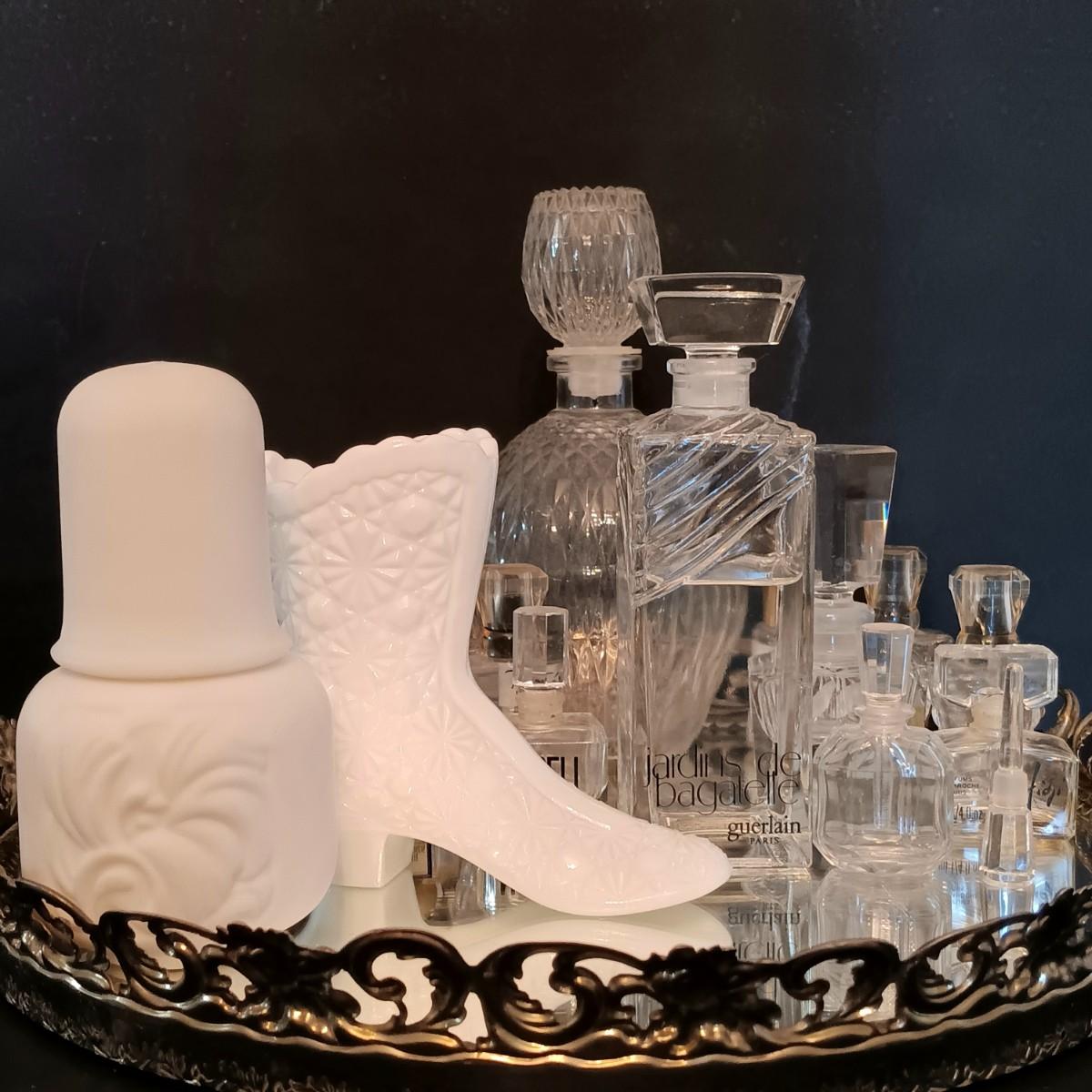 LOT 276: Fenton Milk Glass Boot, Anais Anais R. Royale Paris Vintage Ceramic Bottle, Jardine de Bagatelle 4 fl oz Bottle & More
