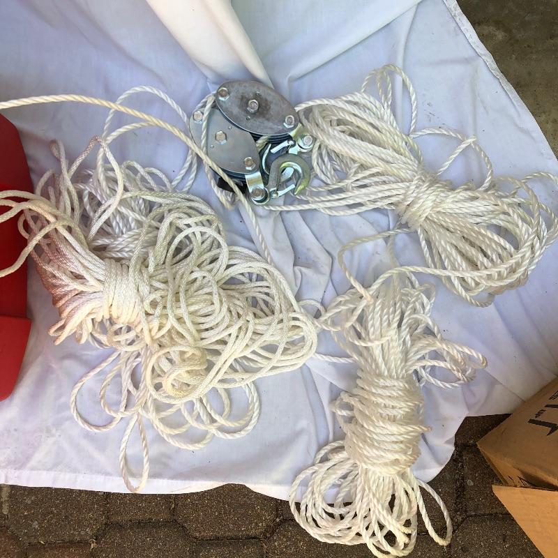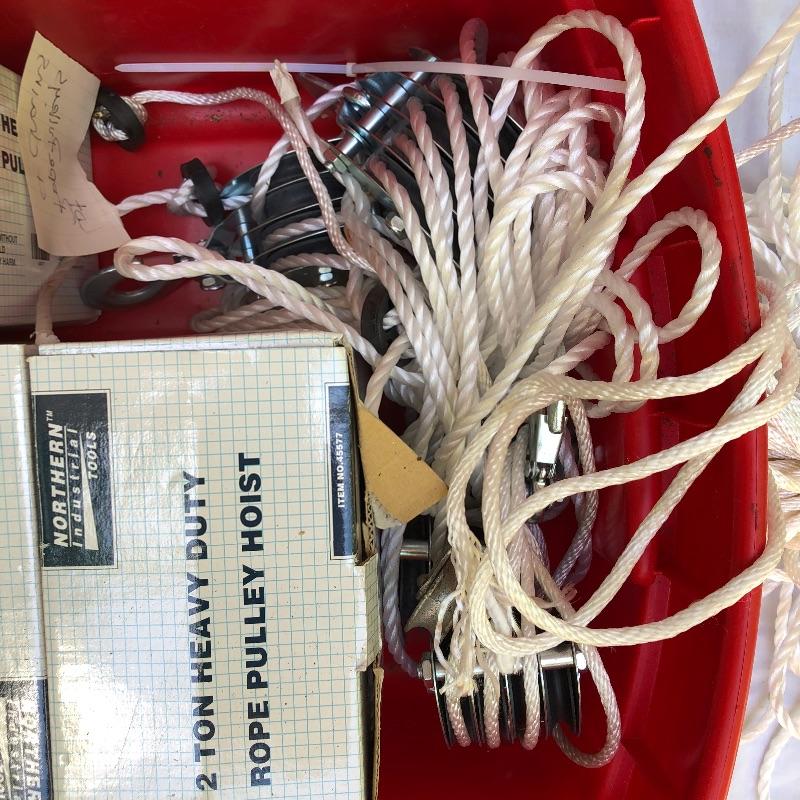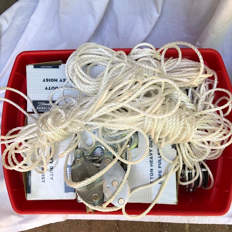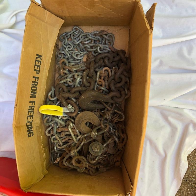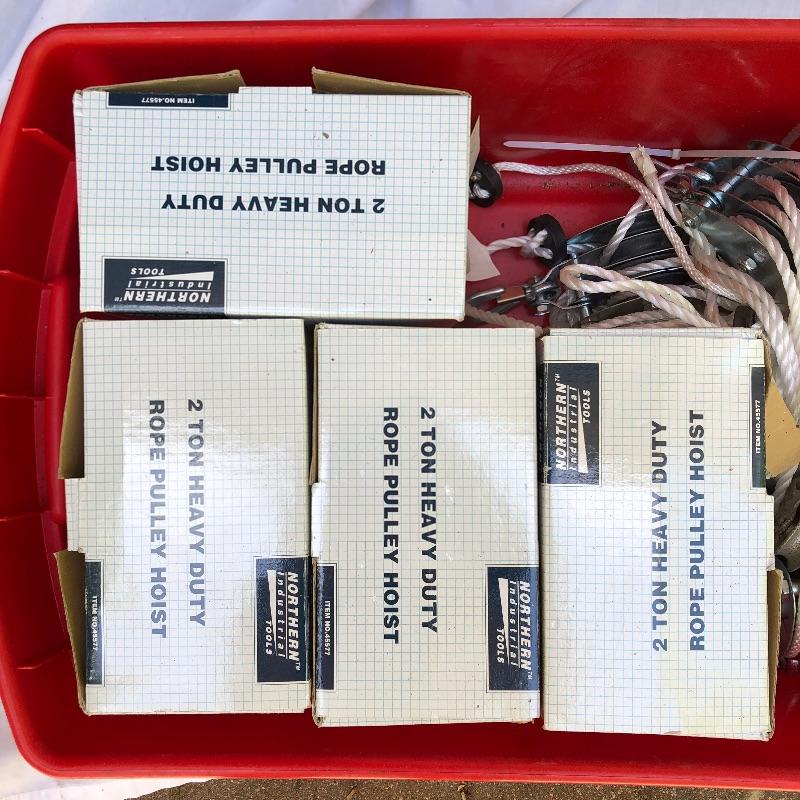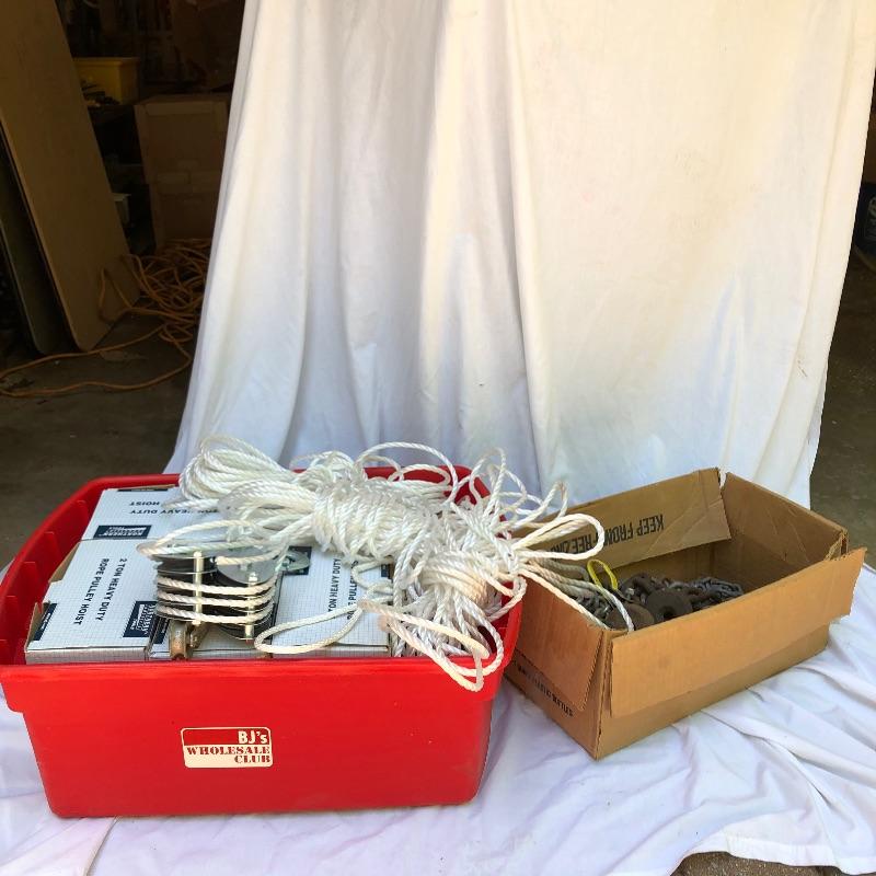 This lot includes a bucket full of 2 ton heavy duty pulley hoists and a box of heavy metal chains. Hoists are in like-new condition but chains are a little rusty. Local pick up only.