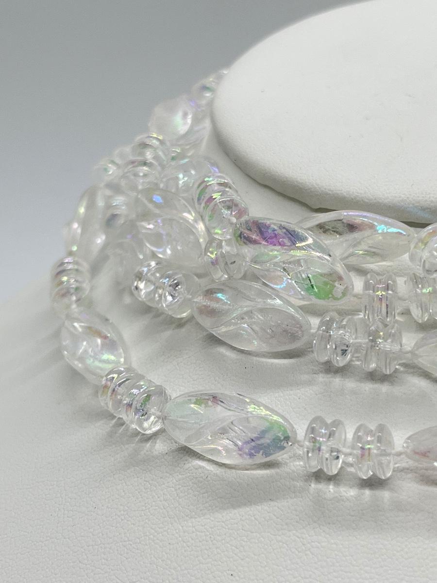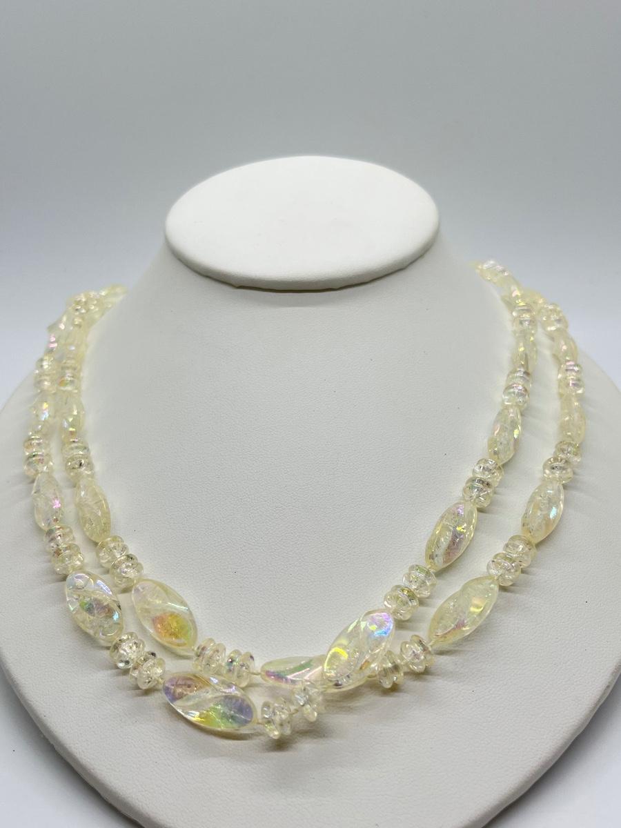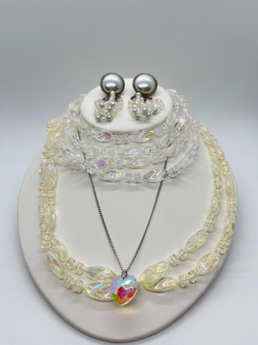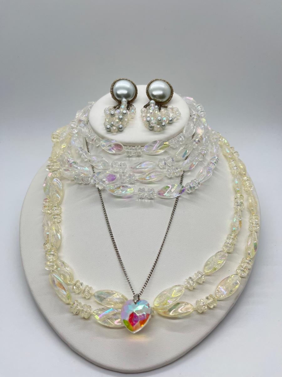 LOT 276: Two Long Iridescent Beaded Necklaces + Matching Earrings - One Iridescent Heart Pendant