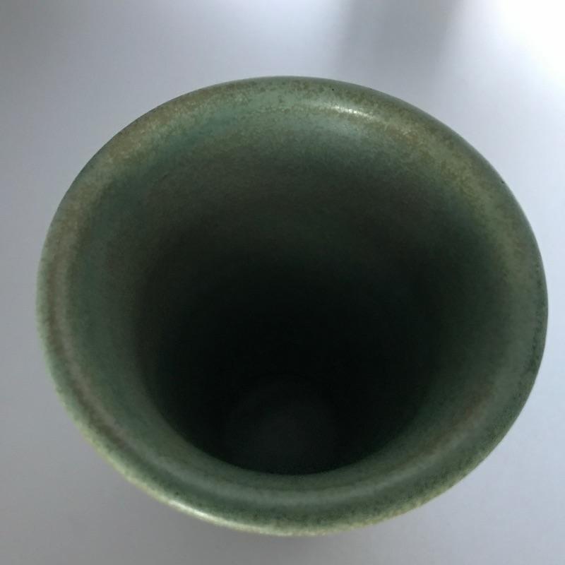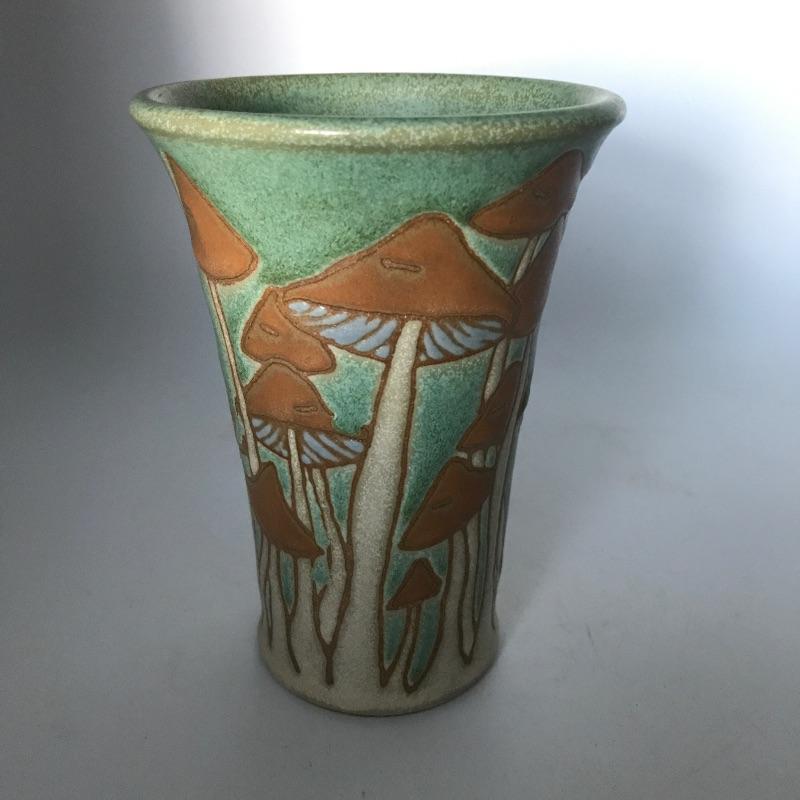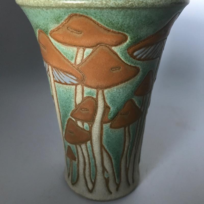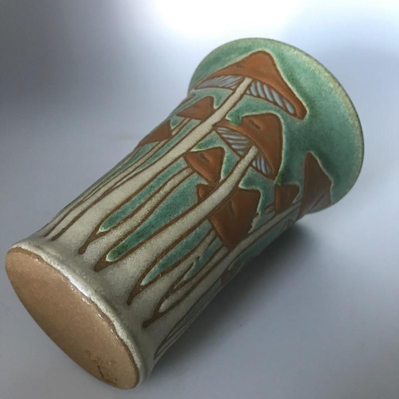 Cute mushroom design on this pottery by Eric Olson. Stamped by maker on bottom 2015 measures 4-5”d x 6” tall